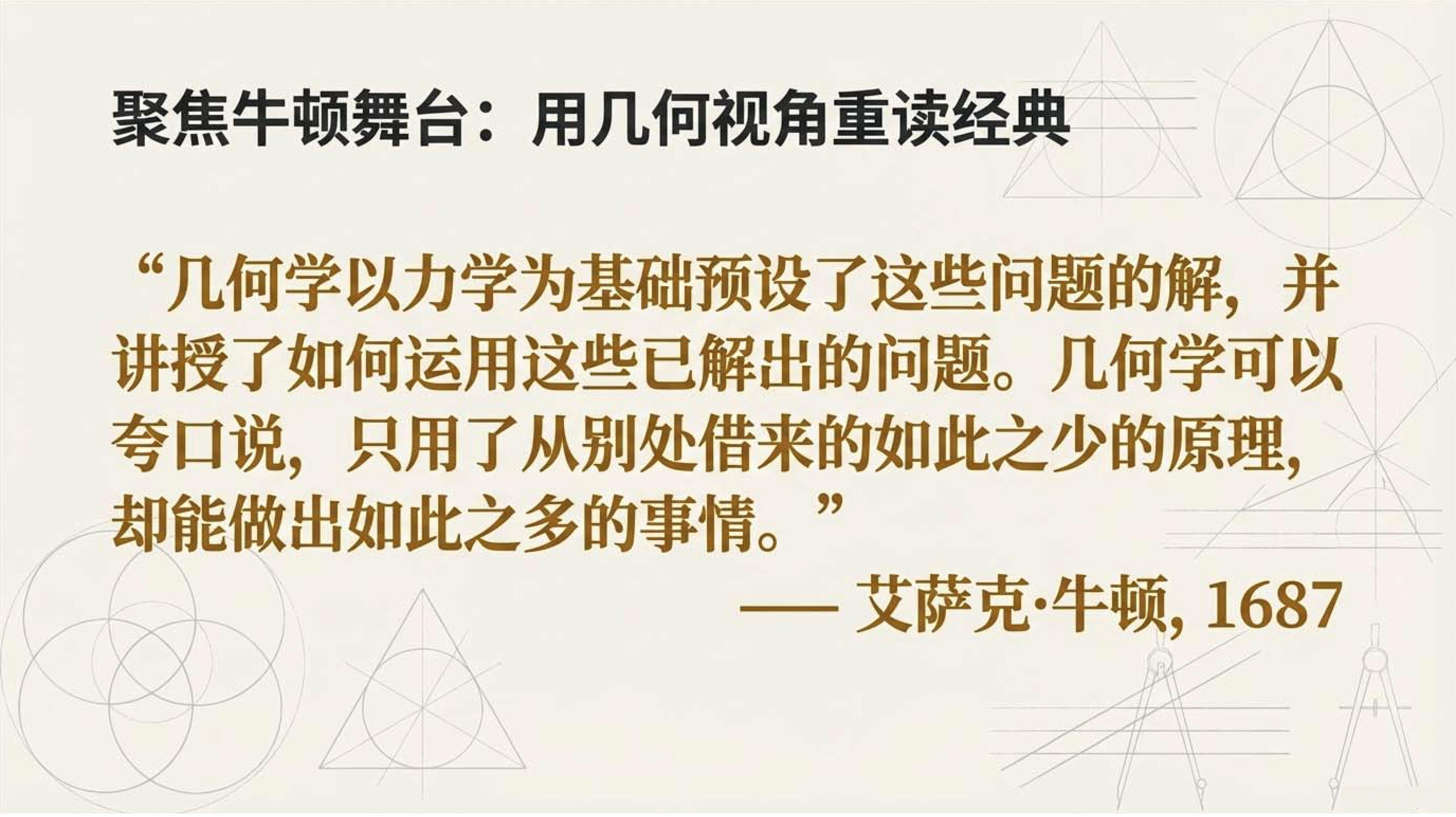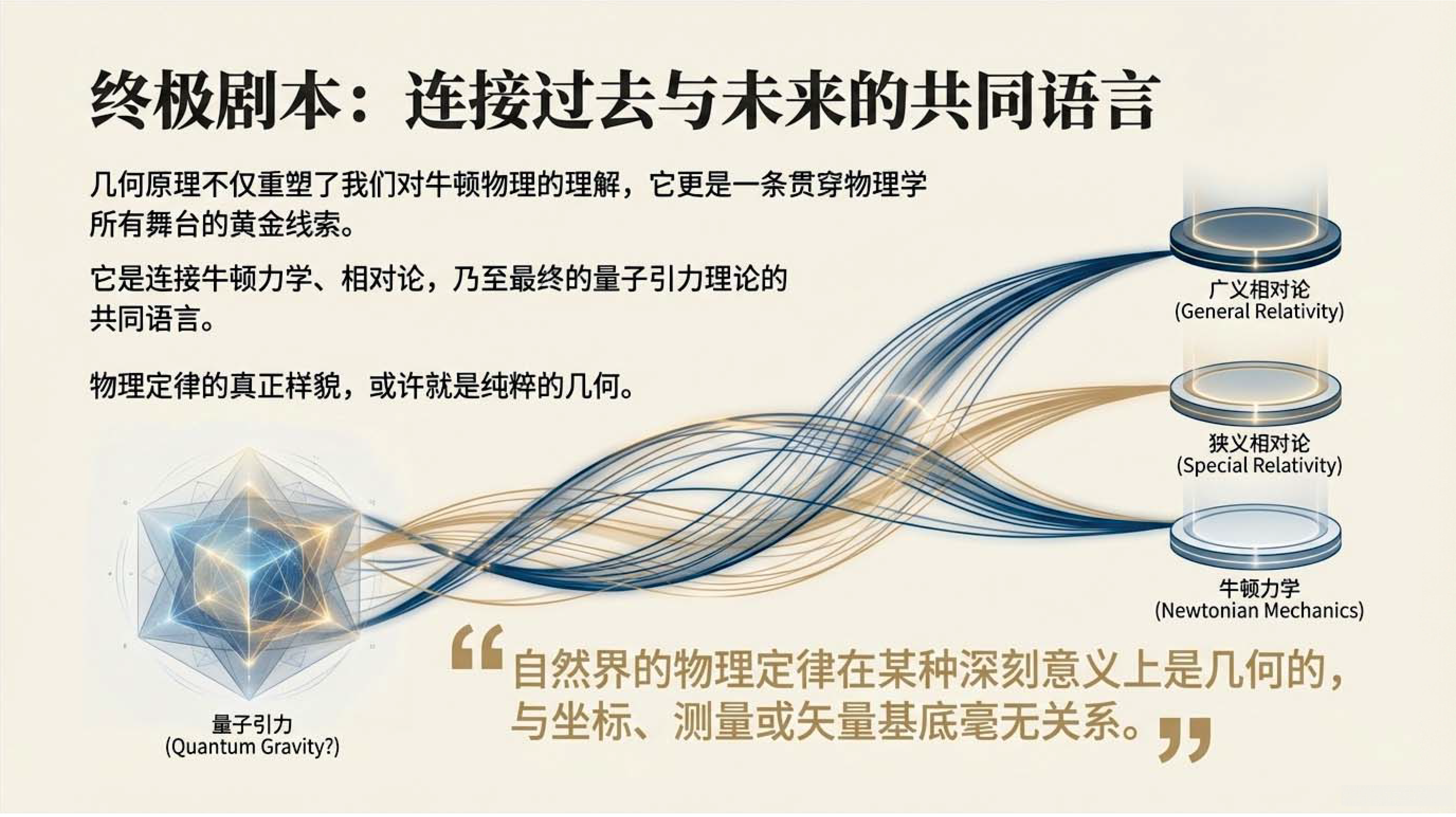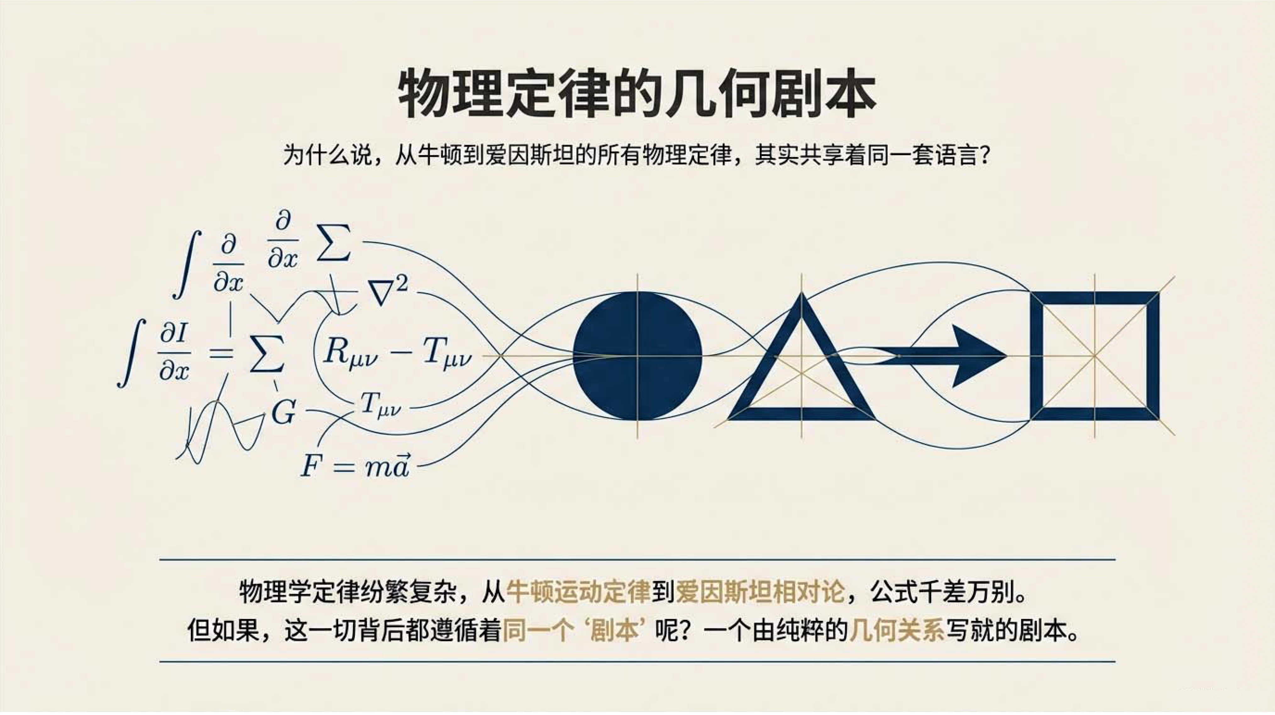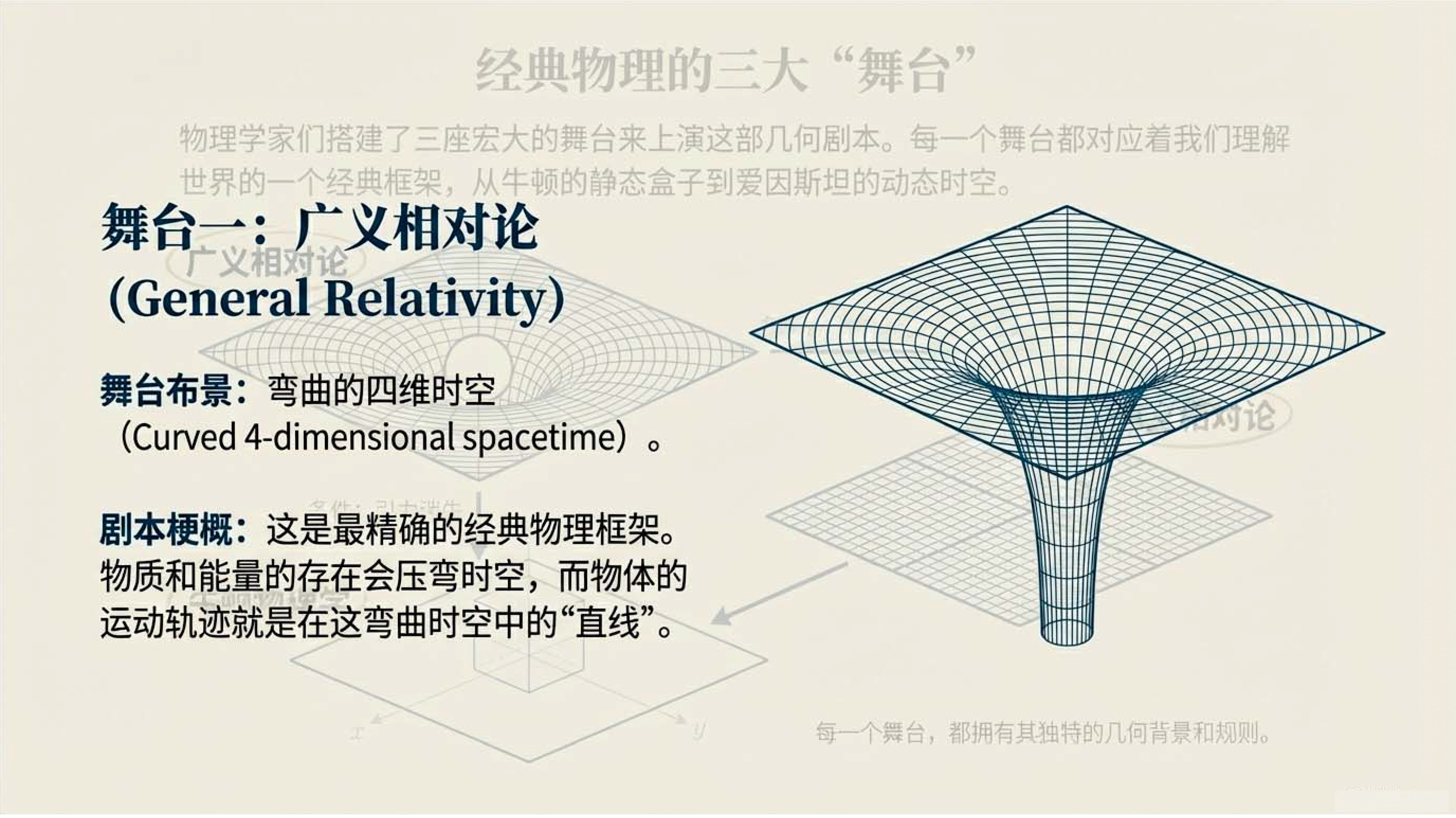 第1课视频的主要内容: 探讨物理定律背后共享的几何原理,介绍广义相对论、狭义相对论和牛顿物理学不同的舞台,阐述用几何原理解剖牛顿物理,认识基本几何对象和运算规则。该几何视角为理解更高阶物理开启新的大门。