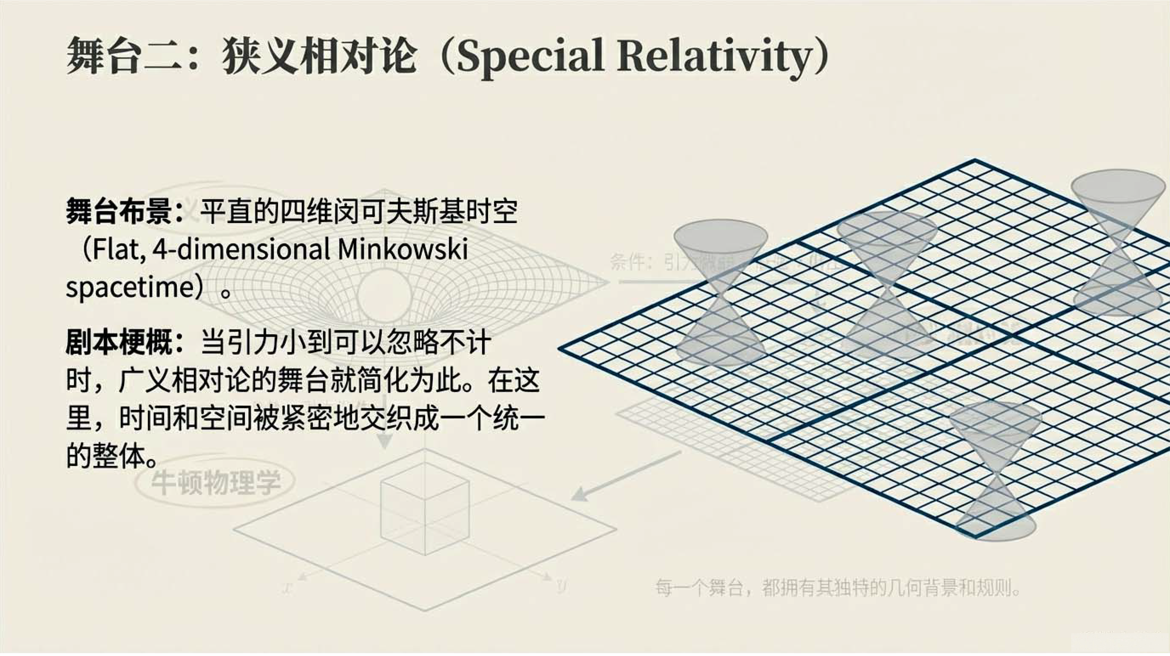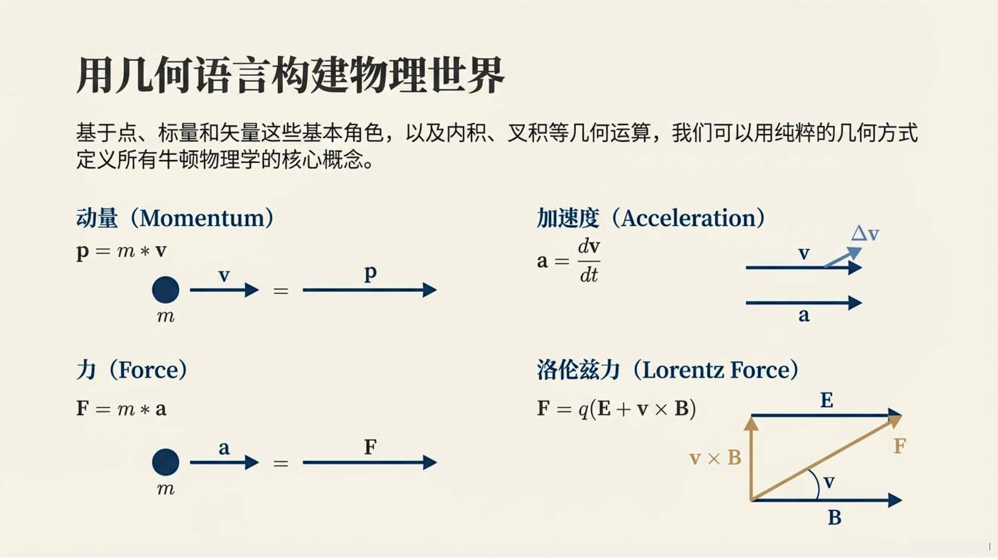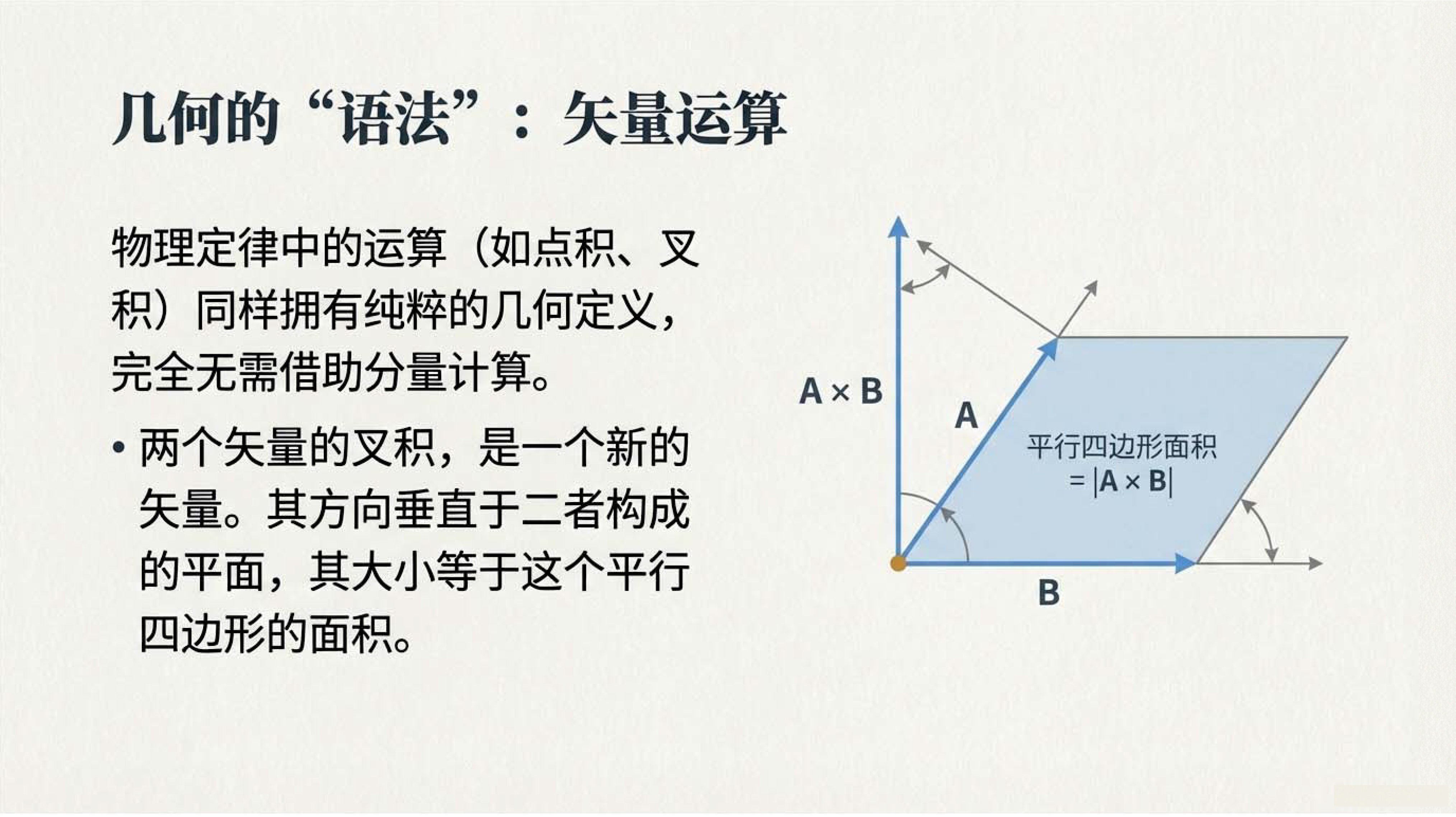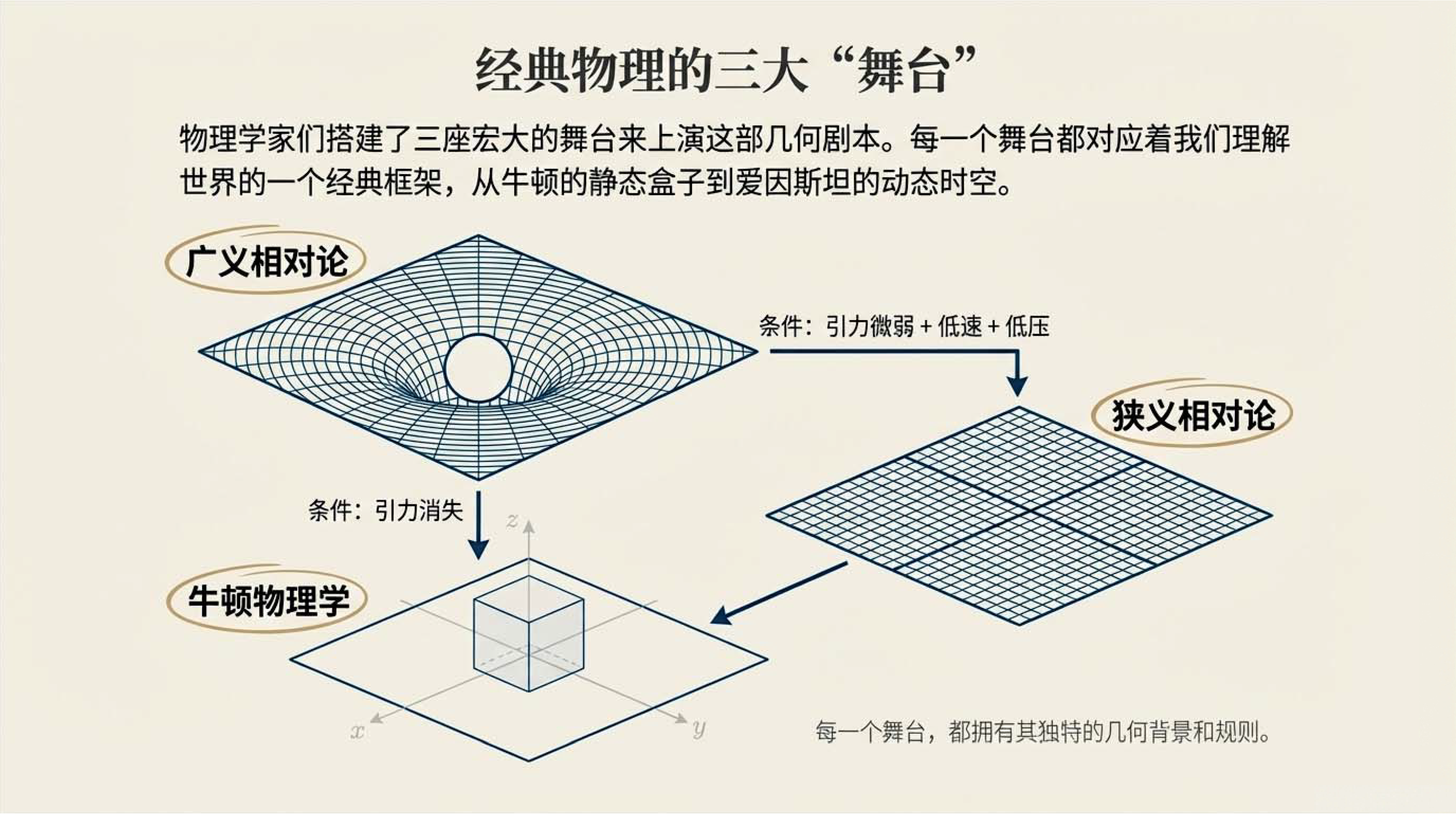 第1课视频的主要内容: 探讨物理定律背后共享的几何原理,介绍广义相对论、狭义相对论和牛顿物理学不同的舞台,阐述用几何原理解剖牛顿物理,认识基本几何对象和运算规则。该几何视角为理解更高阶物理开启新的大门。