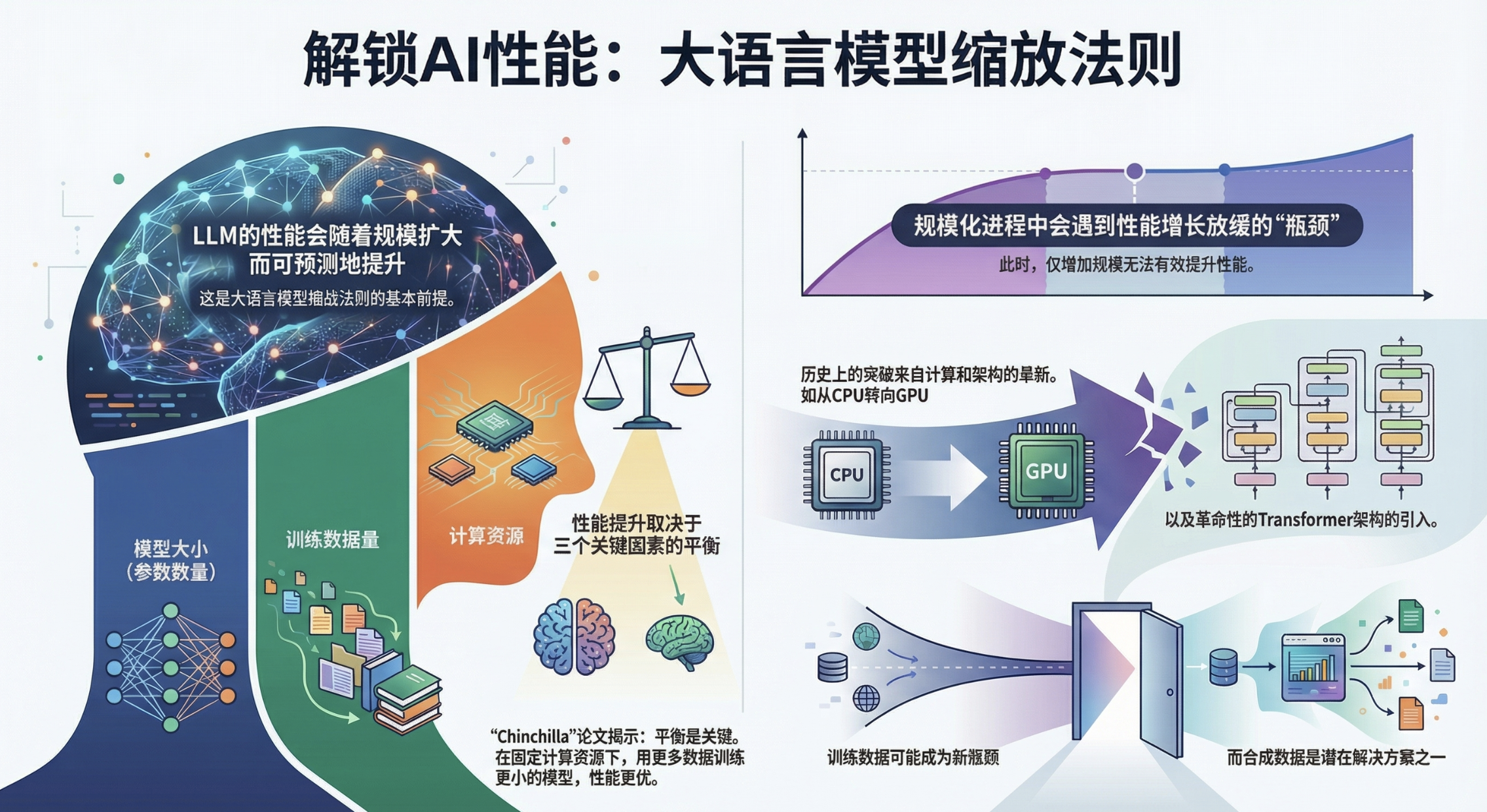 在 AI 领域,曾有一个简单粗暴的信条:堆算力、堆数据、堆参数,就能换来更智能的模型。但这条看似无限的“扩展定律”,其实暗藏着精妙的平衡艺术。本期内容将深入拆解大语言模型性能增长背后的核心法则。你将了解到,决定模型能力的三大支柱如何相互制衡,以及 DeepMind 的 “Chinchilla” 研究为何颠覆了“越大越好”的认知——原来,一个在巨量数据上充分训练的小模型,完全可以战胜资源错配的庞然大物。我们还将追溯从 GPU 到 Transformer 的技术革命如何一次次重写增长曲线,并展望在数据枯竭的阴影下,MoE 架构与合成数据如何引领下一场突破。