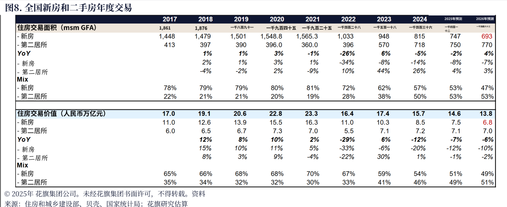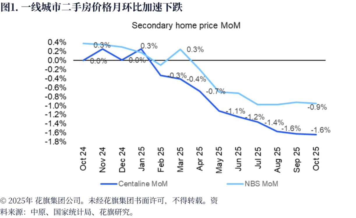 价格走势同样不容乐观。图1(一线城市二手房价格月环比)显示,一线城市二手房价格月环比跌幅持续扩大,从2024年10月的-0.2%一路跌至2025年10月的-1.6%,较峰值已累计下跌36%。而图72(二手销售占比上升)揭示了市场结构的深刻变化,二手房交易占比从2018年的34%飙升至2026年预期的50%,自由定价的二手房成了市场主导,其价格疲软直接拖累新房市场。