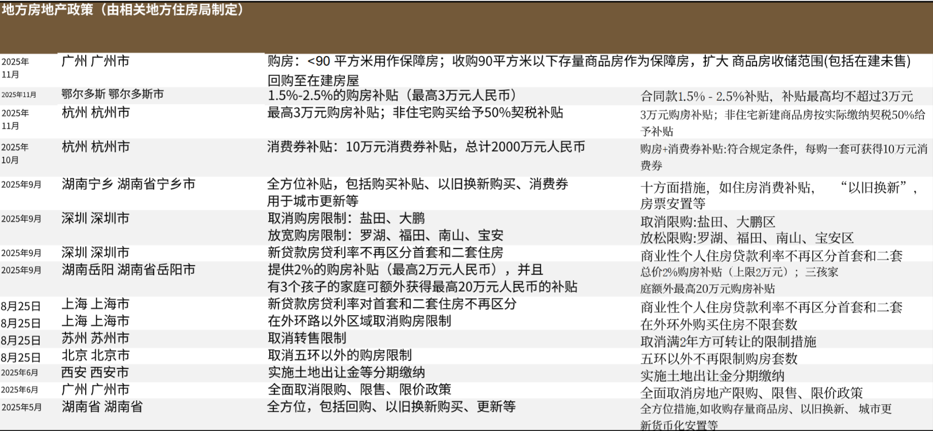 政策方面也难有速效。虽然2025年第四季度各地出台了购房补贴、取消限售等刺激政策(如图59所示部分城市政策),但花旗判断这些政策顶多缓解压力,难改预期。真正能破局的协调政策(房地产+金融政策并行)还需时间落地,而房产税、现房销售等长期政策近期不会实施。