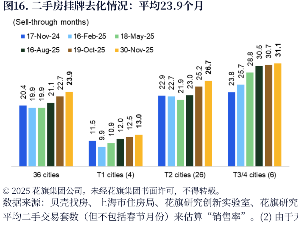更关键的是图16(二手房挂牌去化情况),36个重点城市平均去化周期达23.9个月,一线城市虽略好但也需13个月,二线和三四线城市分别要27个月和31个月,这意味着供应端的压力短期内根本卸不掉。