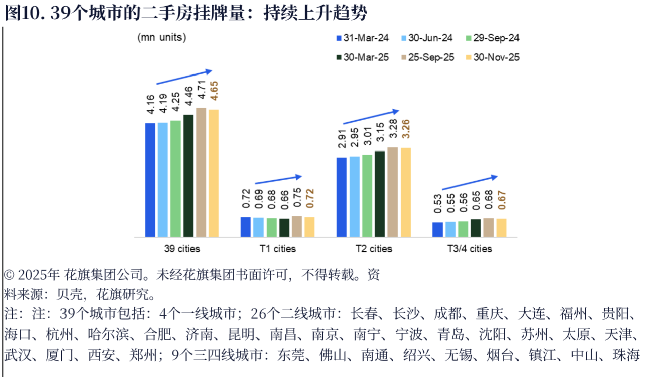 先看最刺眼的库存压力。研报里的图10(39个城市的二手房挂牌量趋势)清晰显示,2025年11月,39个重点城市二手房挂牌量冲到470万套的历史峰值,按每月20-21万套的成交量算,消化完这些库存得22个月,二线三线城市更是要27-31个月。