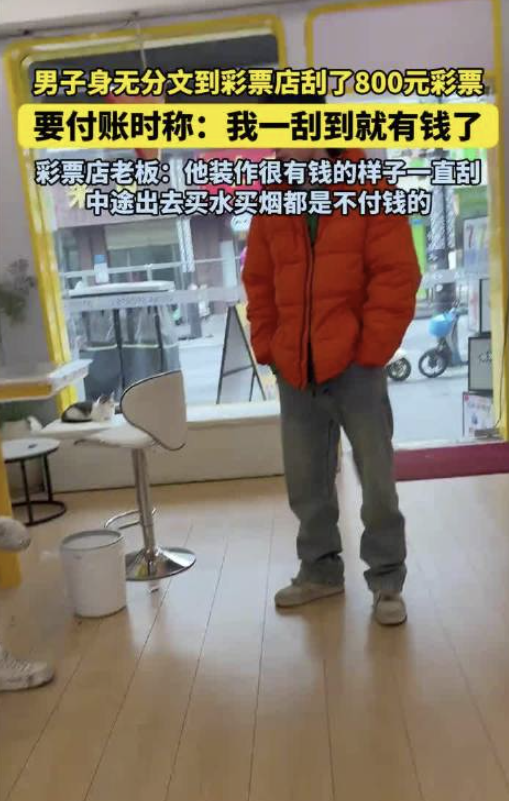 身无分文男子到彩票店刮800元彩票,结果只中了300多元!抵赖:我一刮到就有钱了