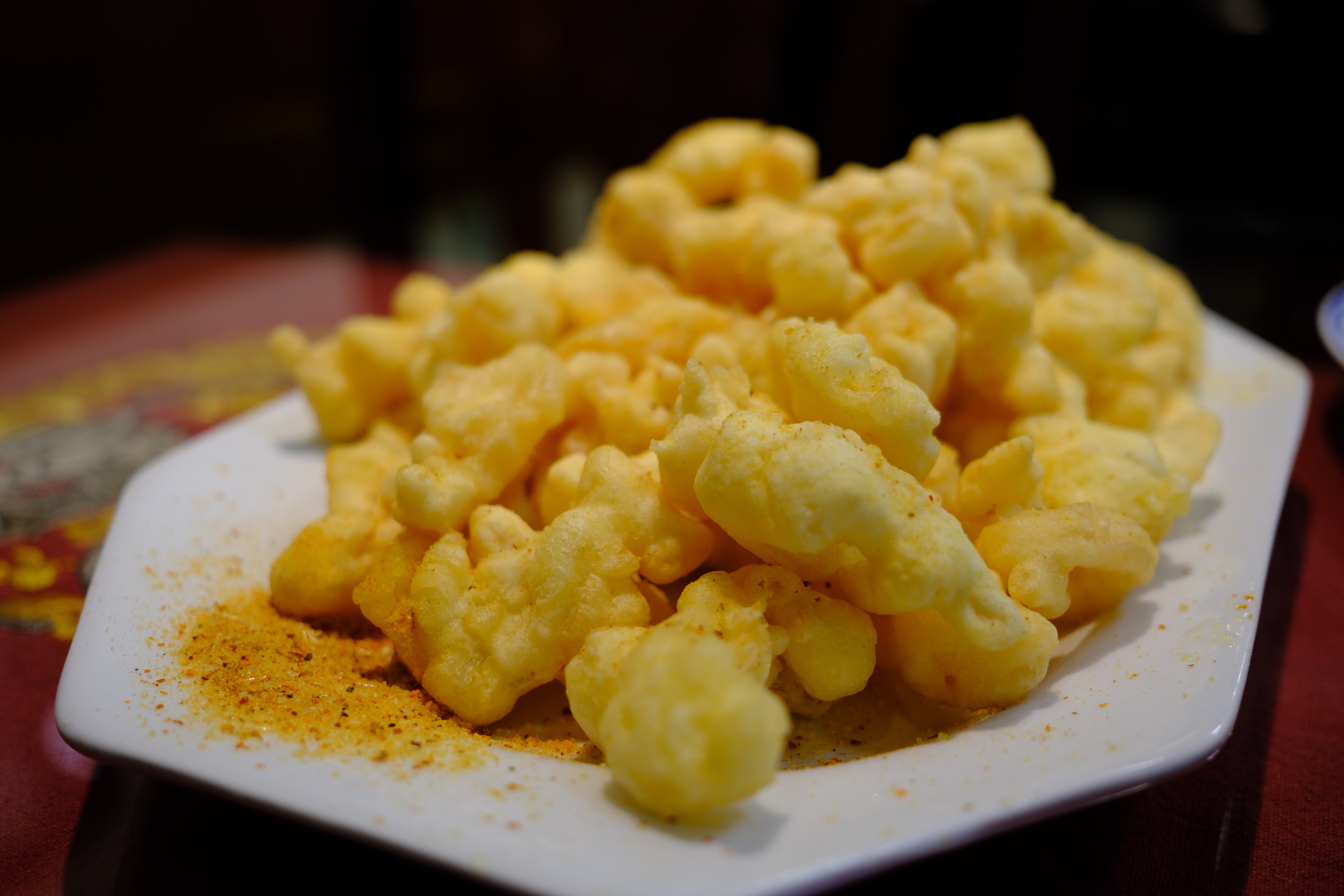 • 全蛋糊、低油温,让外酥里嫩成立,再用椒盐把香气提出来。