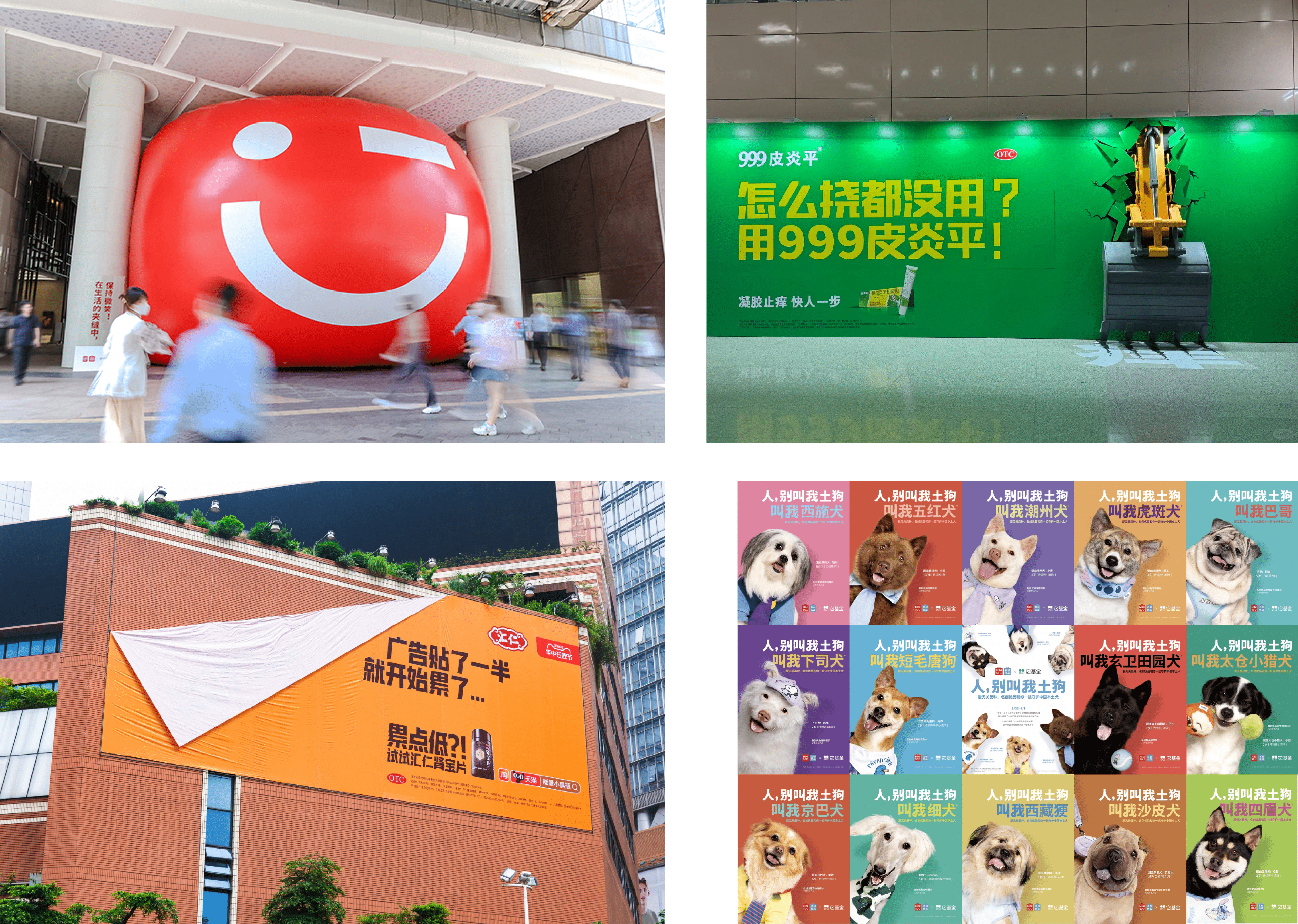 团队出圈创意:名创优品系列(世界微笑日《在生活的夹缝中保持微笑》、《保持微笑上海难不倒》、《人,别叫我土狗》、《开心无需深度思考》)、汇仁药业(《广告贴了一半就开始累了...》)、999皮炎平(把挖掘机开进了广州地铁)等等