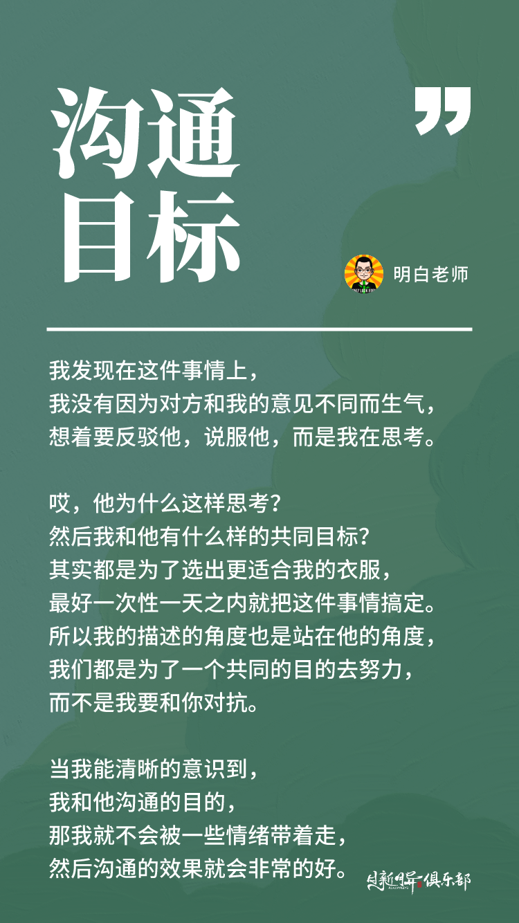 当我能清晰的意识到,我和他沟通的目的,那我就不会被一些情绪带着走,然后沟通的效果就会非常的好。这在日常沟通中也是一样。如果我们清晰的记得自己的目标,我们就不会被中间的各种情绪呀、辩论呀,想要赢啊之类的东西给带着走掉。