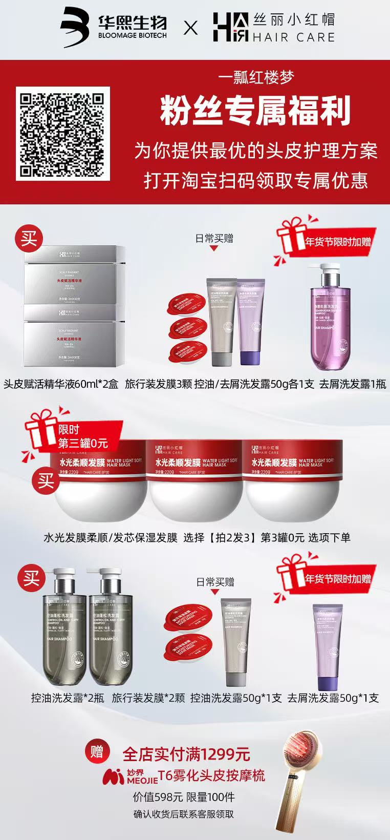 现在还有大额优惠券可以领取啦37₤59uQUUglOpn₤ / CZ193 到淘宝或去淘宝搜【丝丽小红帽旗舰店】向客服报暗号【一瓢红楼梦】领取大额优惠券!!年货节期间丝丽小红帽与妙界联动开展满赠活动,实付满1299就赠价值598的妙界头皮按摩梳,大家快去试试吧~