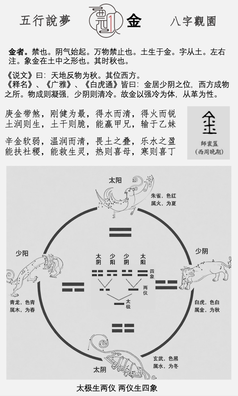 作为“金木水火土”的第一个元素,古人把金的意象从物质拆分成了季节、方位和代表的灵兽。金属可以冶炼但也坚硬的属性,化成了对金命人属性的最佳阐述。阴阳将金划分成辛金与庚金两种类型,不同的金命人又写出了他们不同的性格特征。