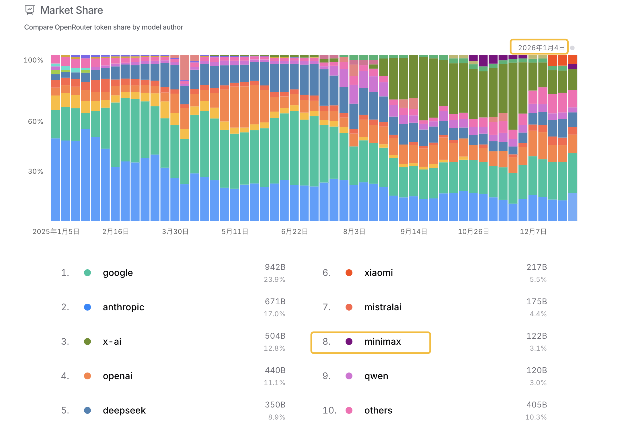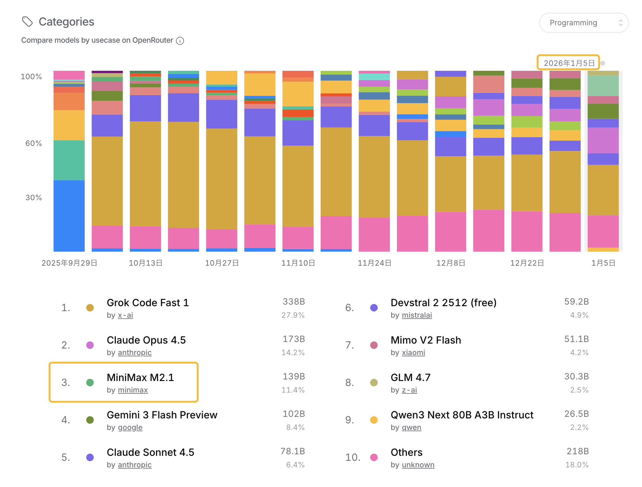 从数据上对比,查看 openrouter.ai 最新 Token 消耗的数据排名,MiniMax 从 2025年10月份开始提升市场份额占比,目前全球排名第8。编程领域也比较靠前,目前全球排名第3,排在 Claude Opus 4.5 之后。