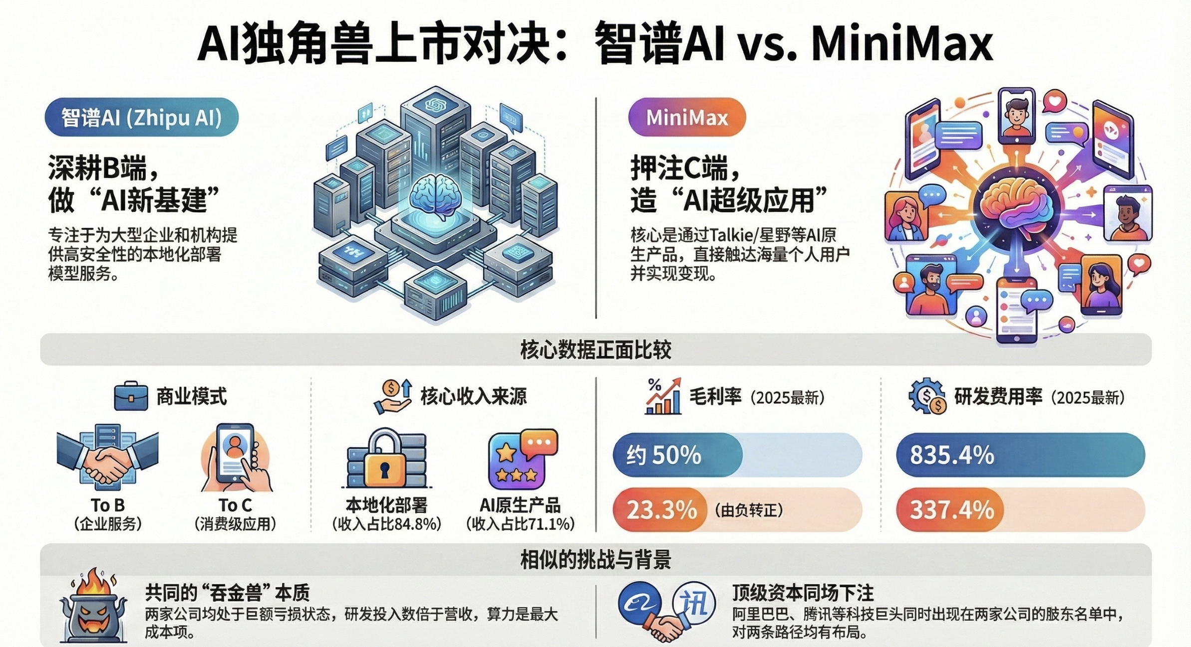 2026 年初,两家中国 AI 独角兽智谱和 MiniMax 前后脚在港交所挂牌,成为“大模型第一股”与“超级应用第一股”。但它们讲述的,是截然不同的两个商业故事:一个扎根于企业机房,一个爆发于海外社交平台;一个靠开源技术赢得声誉,一个靠多模态应用收割用户。本期我们深度拆解两家公司的招股书,看它们如何用完全不同的逻辑,回答同一个致命问题:大模型到底怎么赚钱?我们将解析智谱为何“每赚1元就要烧掉8元研发”,剖析 MiniMax 毛利率从负 24% 到正 23% 的过山车式修复,并探讨在算力成本与版权风险的双重压力下,这两条道路各自通往何方。这不仅是中国 AI 行业的“压力测试”,也是一场关于技术理想与商业现实的终极校准。