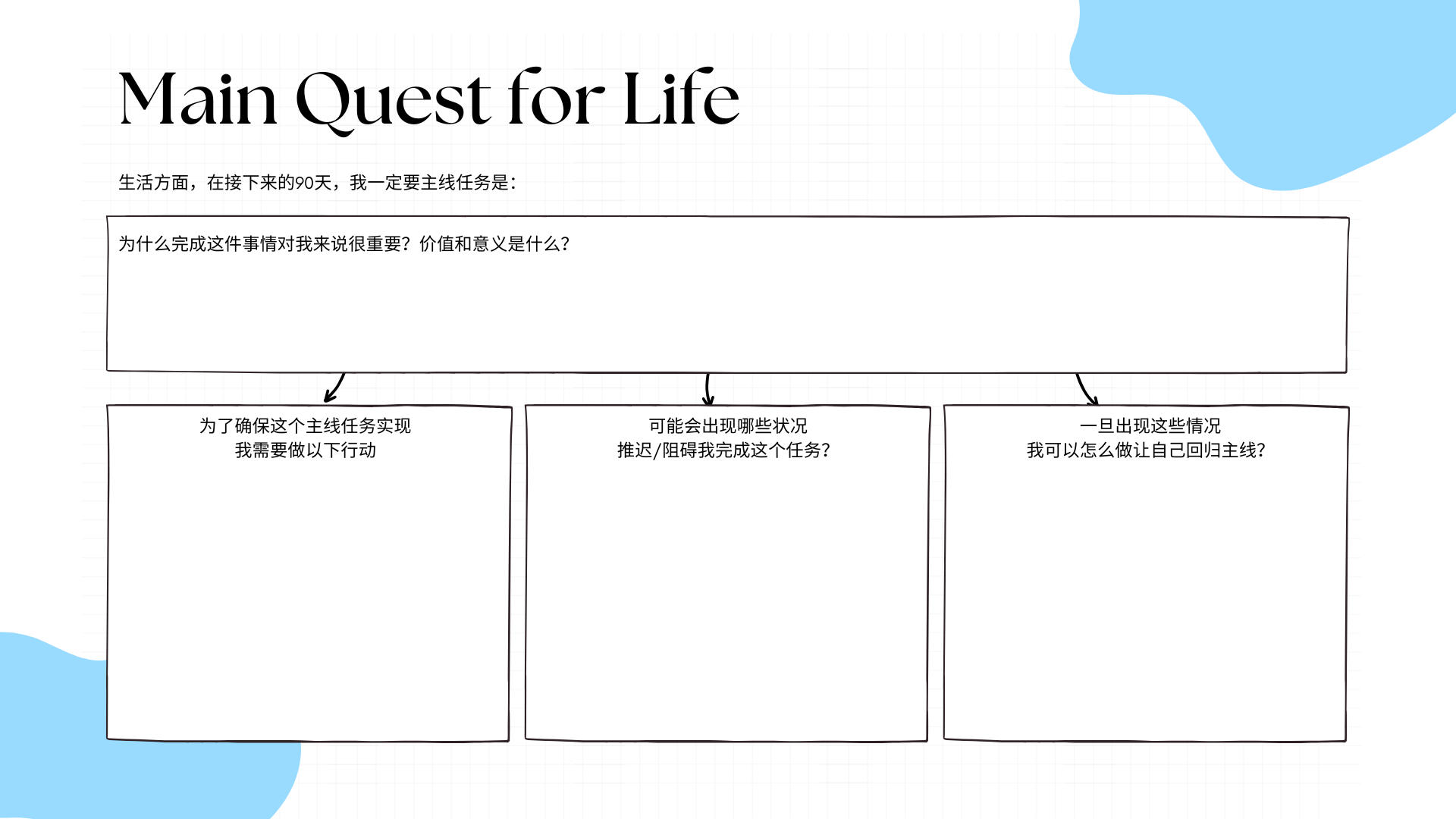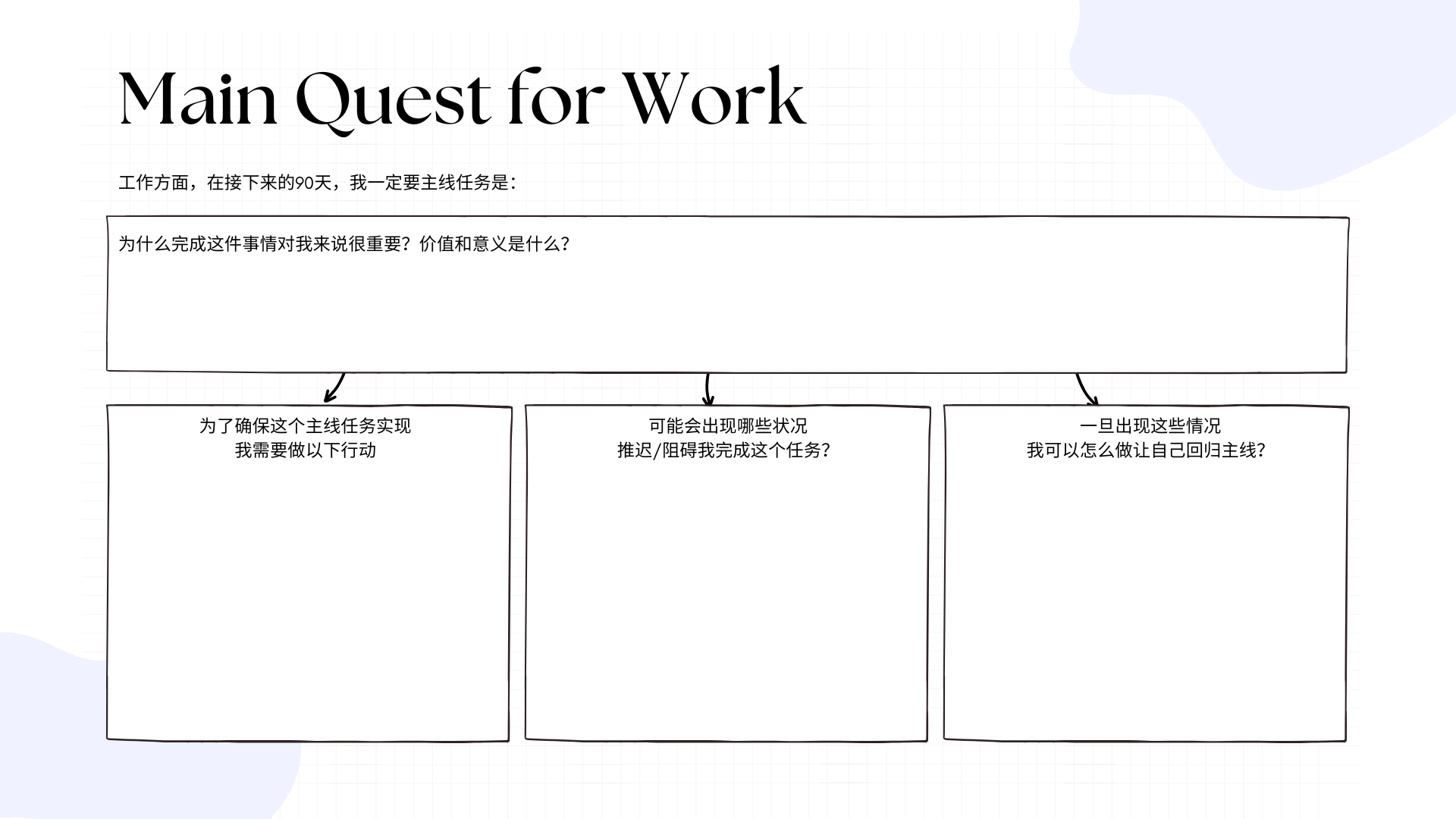 一、主线 main quest 90天,把核心任务放在这90天,是全年任务的一个小任务的拆分。在核心任务90天以外的是side quest,这些是nice to have,要明白这些不是主线。