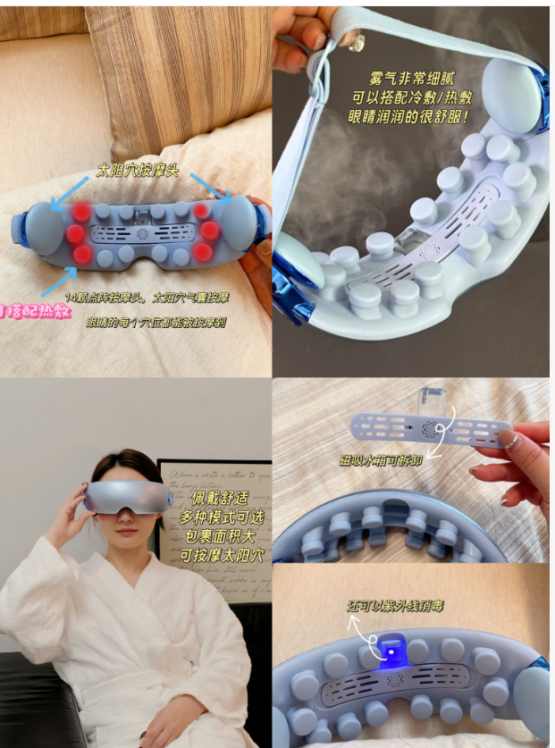 经常低头工作,老看手机,常常戴隐形眼镜或美瞳的朋友,都会用眼过度,眼睛一疲劳,麻烦就多了,比如度数上涨,皮肤变差,睡不着觉,严重一些的还会得干眼症,结膜炎,电脑视觉综合征,影响非常大。一般呢我们都会想点简单办法缓解疲劳,比如拿毛巾热敷,做眼保健操,效果不大,用眼药水呢,里面还有防腐剂,常用伤眼睛,这就是妙界这款按摩仪的妙处,它比简单的方法更专业,比专业的眼药水更健康,戴上它随时都能做眼保健操!