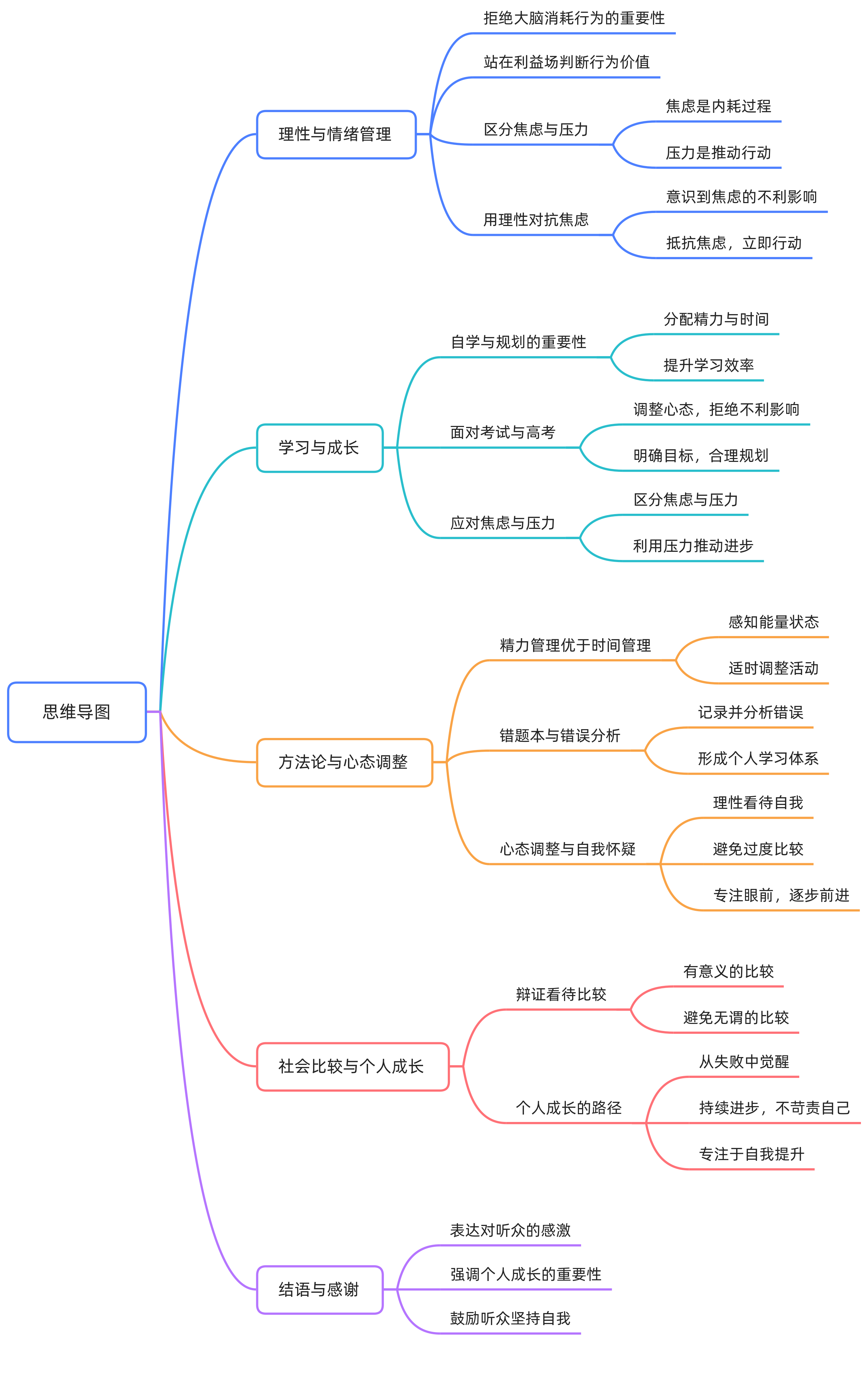 - 04 | 09:36 【理性对待行为与情绪】:要意识到焦虑是一种自我否定的内耗过程,而压力是推动行动的动力;应拒绝大脑对焦虑的沉迷,用理性判断行为是否有利于自身发展。