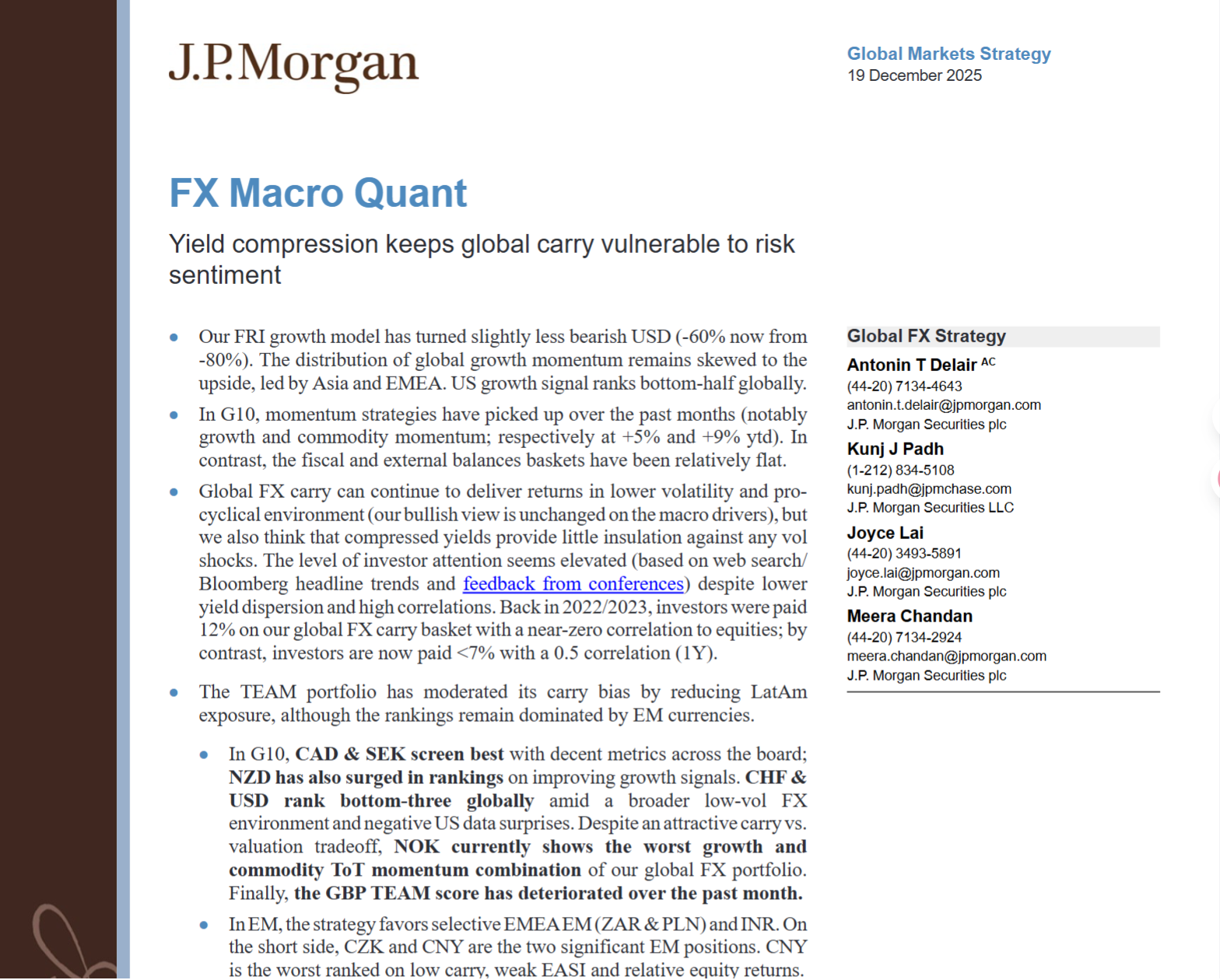 现在被投资者疯抢的外汇套利,早已不是2022年的香饽饽。摩根大通2025年12月19日发布的FX Macro Quant研报(标题:Yield compression keeps global carry vulnerable to risk sentiment)重磅提示:全球外汇套利虽仍能在低波动环境下赚钱,但收益率压缩让它对风险冲击毫无抵抗力,投资性价比已大幅缩水。