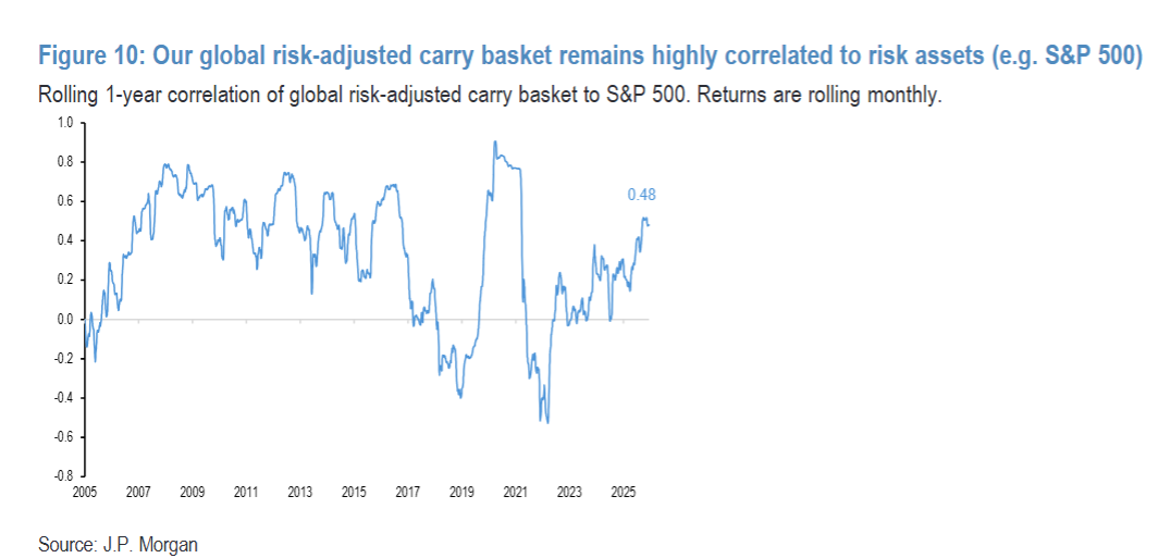 先看核心结论:摩根大通对美元的看空程度有所缓和(FRI增长模型权重从-80%调整至-60%),但全球增长动量仍由亚洲和EMEA引领,美国增长信号在全球排名中下游。更关键的是,外汇套利的吸引力正在崩塌——2022-2023年,全球外汇套利篮子能给投资者带来12%的收益,且和股票相关性几乎为零;如今收益率跌到不足7%,与股票的1年相关性却飙升至0.48。