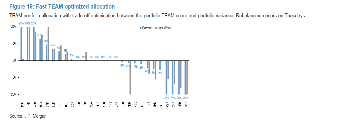 研报第12页的图19(Fast TEAM optimized allocation)展示了最新的优化配置结果:在G10货币中,加元(CAD)和瑞典克朗(SEK)表现最佳,各项指标均衡,优化后权重较高;新西兰元(NZD)因增长信号改善,从倒数跻身中游;而瑞郎(CHF)和美元则排名倒数前三,受低波动环境和美国数据不及预期拖累。在新兴市场,策略偏爱欧洲中东非洲的波兰兹罗提(PLN)、南非兰特(ZAR)和印度卢比(INR);看空捷克克朗(CZK)和人民币(CNY),其中人民币因低套利、弱经济惊喜指数(EASI)和相对 equity 回报不佳,成为排名最差的EM货币。