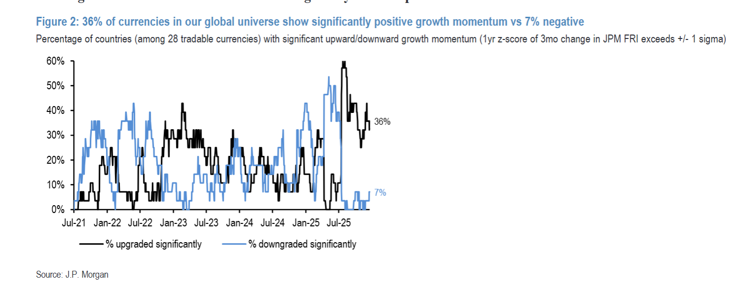 研报第2页的图2(36% of currencies show significantly positive growth momentum vs 7% negative)清晰显示,在28种可交易货币中,36%呈现显著正增长动量,与上周持平;7%呈现显著负增长,较上周的4%有所上升。这9种高增长货币集中在亚洲和EMEA,包括印度卢比、新西兰元、波兰兹罗提等;而英镑和日元则成了表现最差的货币,增长动量均低于-1个标准差,挪威克朗、澳元等也排名靠后。从图中2021年至今的趋势能看出,全球增长动量始终偏向上行,23种货币呈净正增长,仅5种为负,这为风险资产提供了良性环境,但美元在其中表现平平——全球排名下半区,G10中仅处于中游。