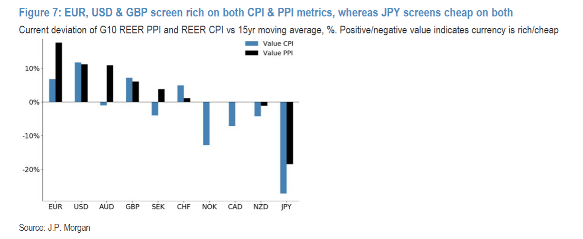 再看研报第5页的图7(EUR, USD & GBP screen rich on both CPI & PPI metrics),这张图对比了G10货币相对于15年平均水平的估值偏差。欧元以12%的溢价位居前列,美元紧随其后溢价11%,英镑也处于高估区间;而日元则是实打实的“洼地”,无论是CPI还是PPI维度,都折价23%,韩元折价13%、人民币折价11%,亚洲货币整体偏便宜。值得注意的是,EM估值分散度自2022年一季度后首次超过G10,这意味着新兴市场货币的估值差异更大,投资机会和风险也更分化。