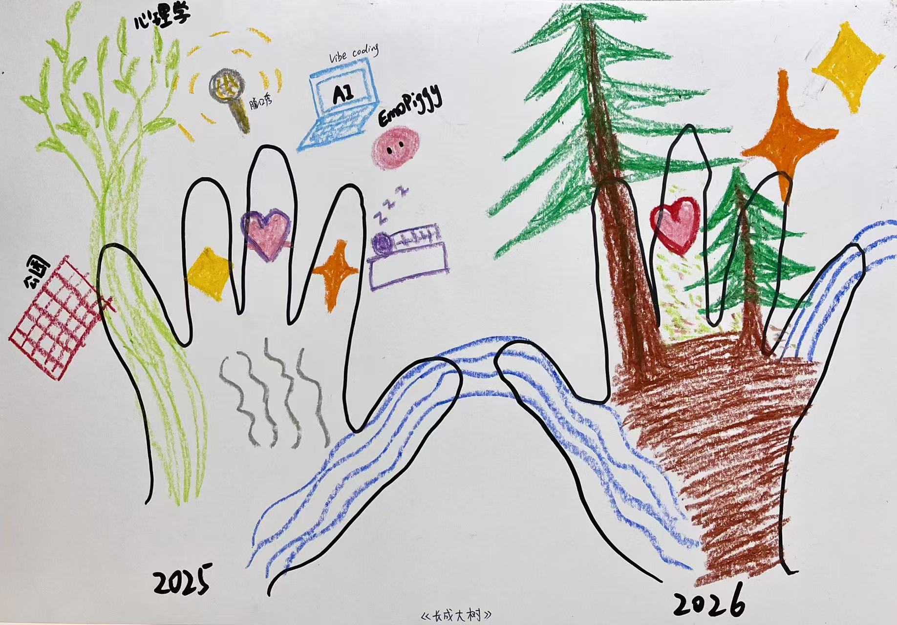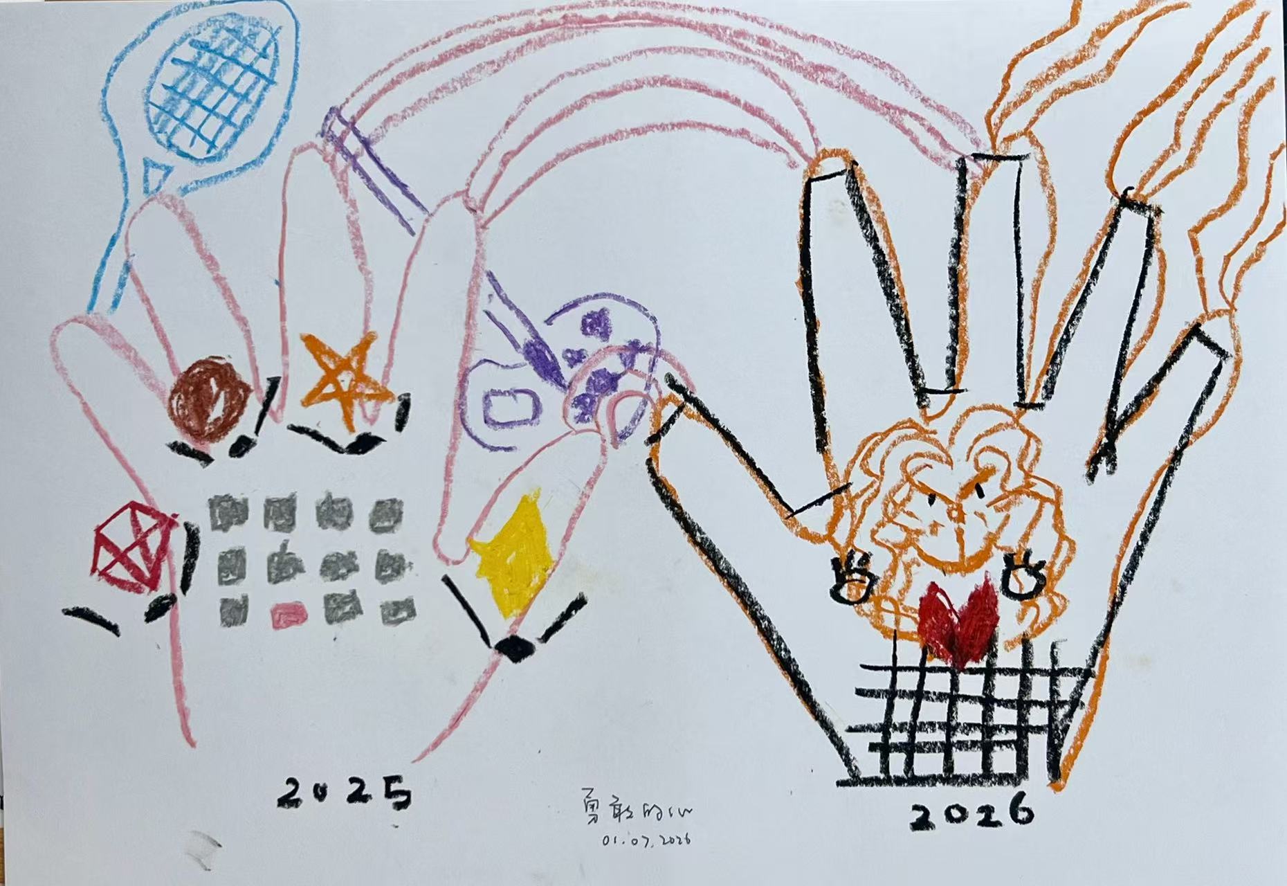 2、用任何喜欢的画笔在左手上画出2025年,在右手上画出2026年(任何线条、形状、图案、文字等,可以画自己的性格特征/行为表现/经历的事情/取得的成就,2026还可以画上对未来的目标期望)