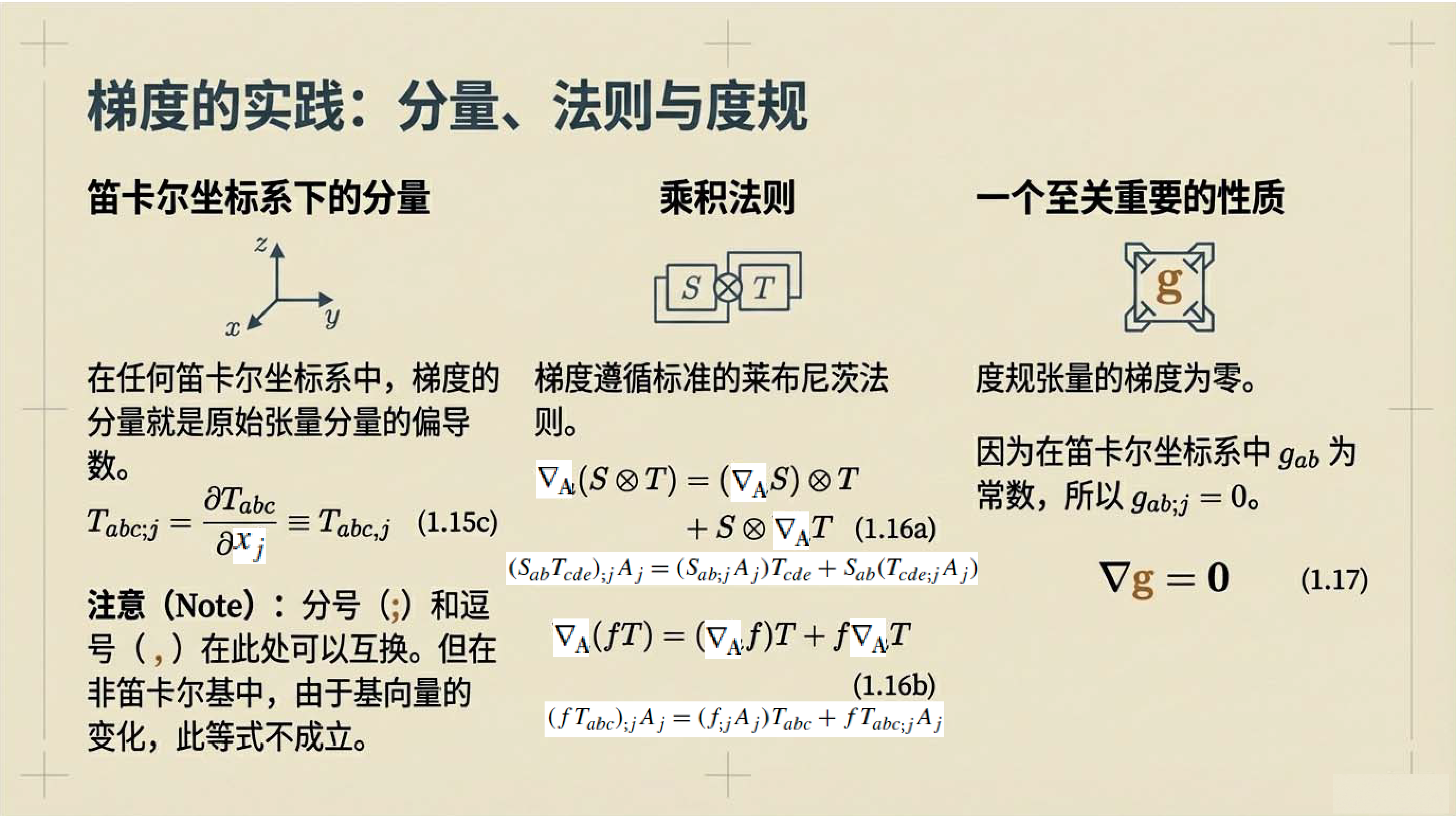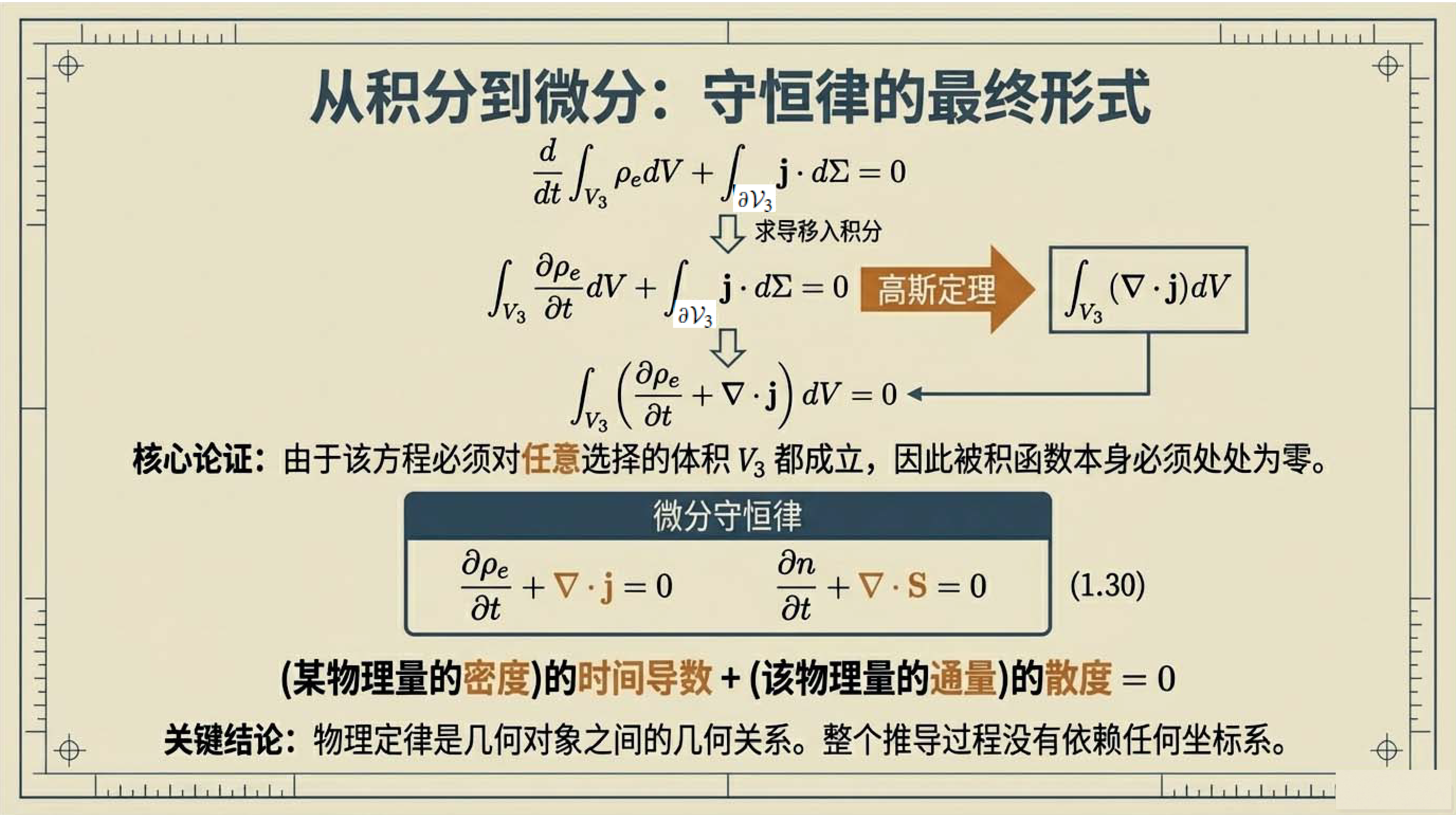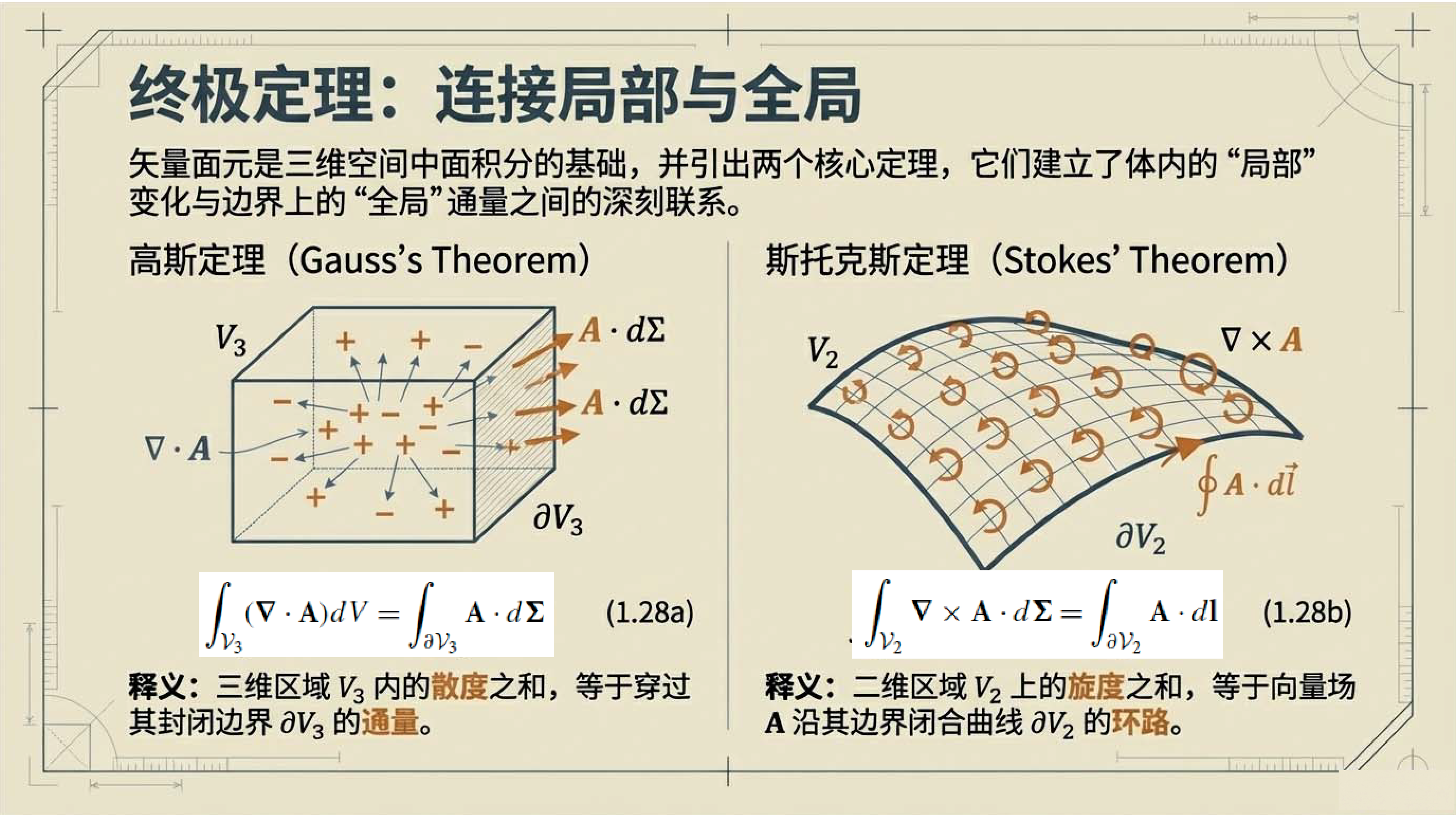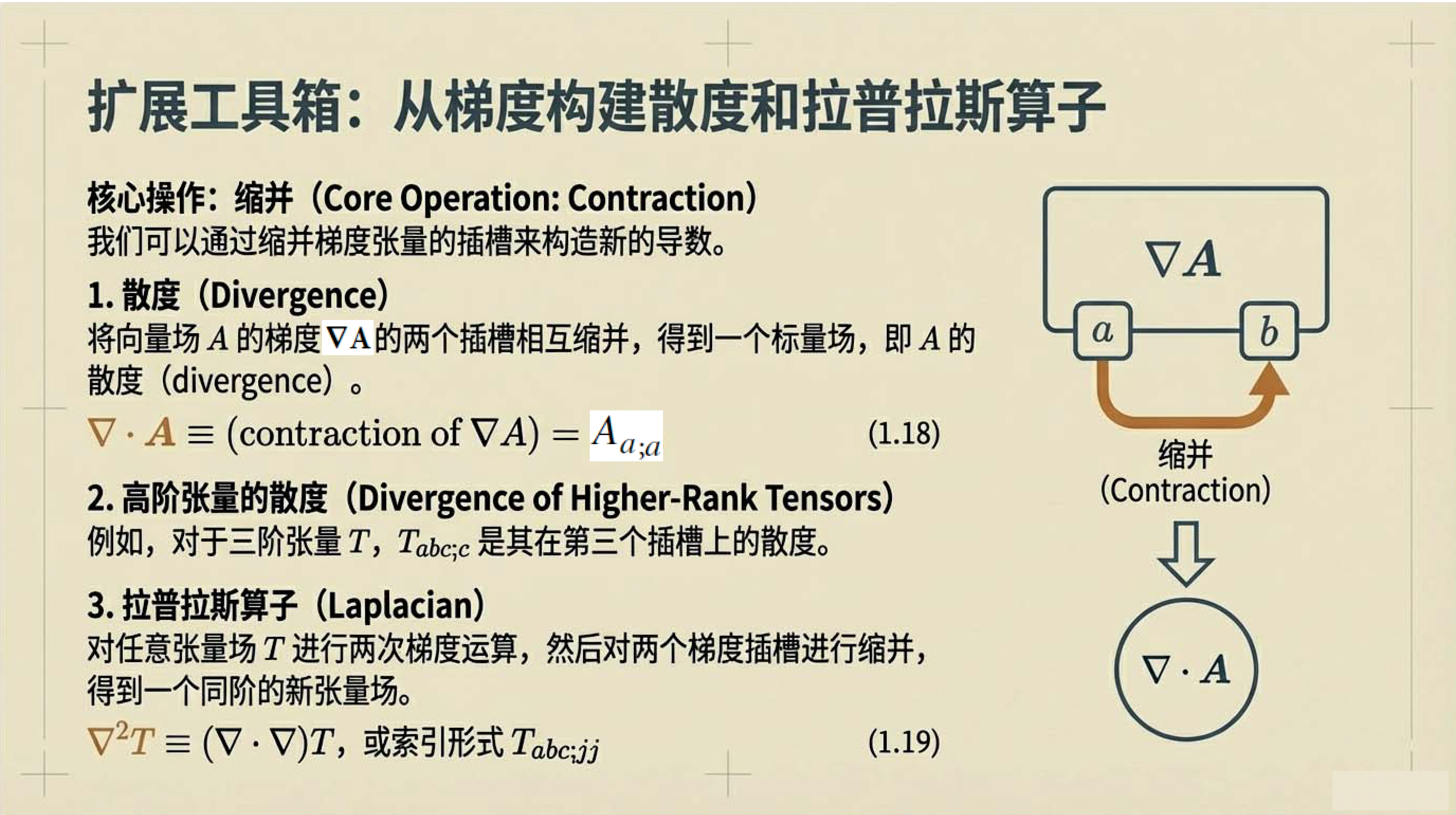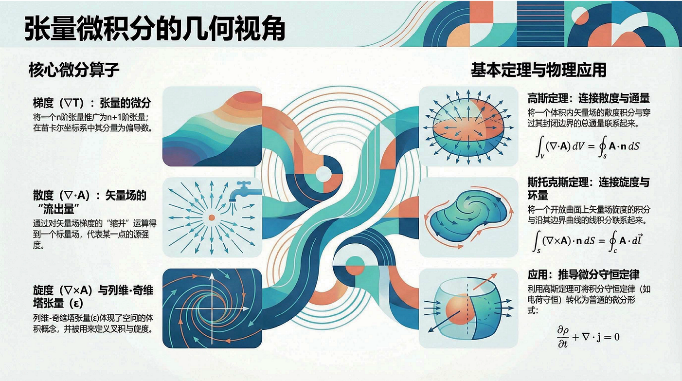 第4课视频的主要内容: 介绍了张量微积分的几何视角,包括梯度、散度、旋度等核心微分算子的定义与作用,以及它们与列维-奇维塔张量的关联。还阐述了高斯定理、斯托克斯定理等基本定理,以及这些定理在物理守恒定律推导等方面的应用。第4课完整讲义:zhuanlan.zhihu.com00:00 开篇语00:4301:5503:1604:5506:1207:1307:4708:4209:2309:3210:0010:5112:0612:3613:56 结束语14:34