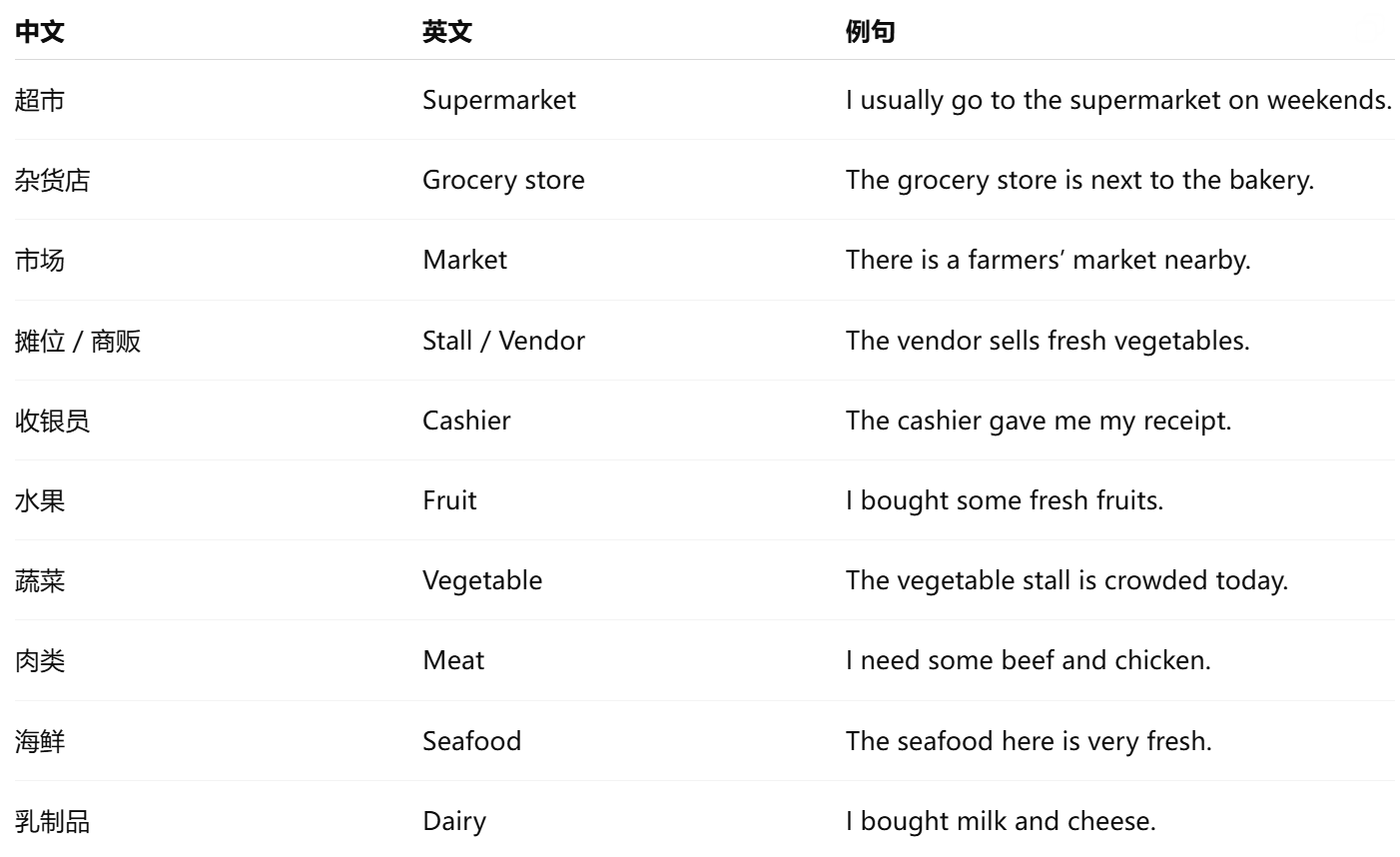 中文:先熟悉超市和市场的商品分类,快速找到所需物品。
