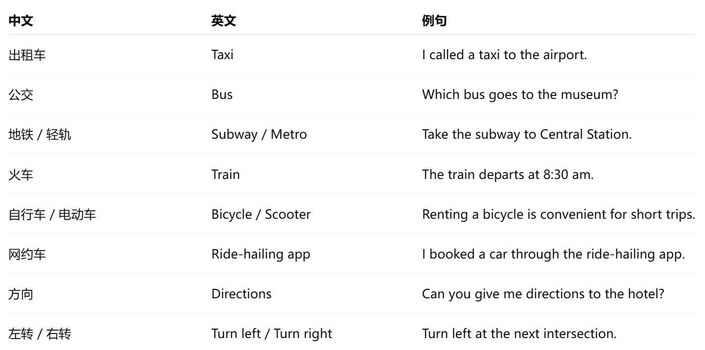 - 交通工具 (taxi / bus / subway / train / bicycle / scooter / ride-hailing app)