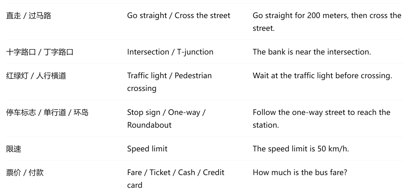 - 中文:熟悉红绿灯、人行横道、单行道和限速标识。