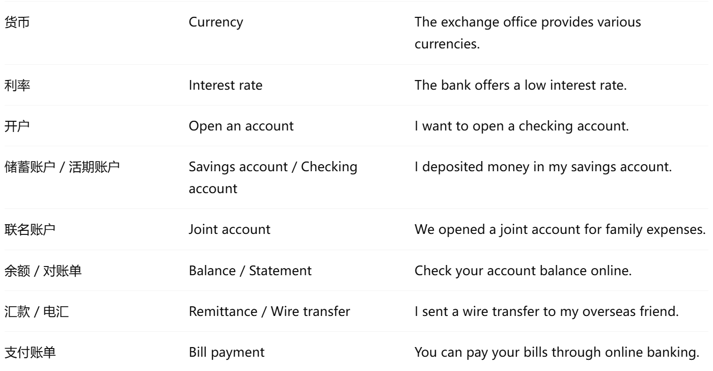 - 银行业务 (bank / branch / teller / customer service / account / deposit / withdrawal / transfer / ATM)