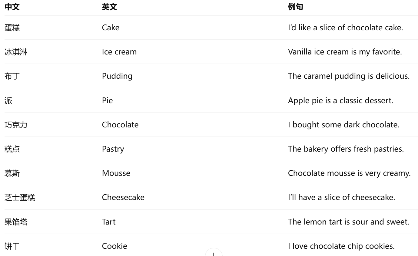 - 甜点 (cake / ice cream / pudding / pie / chocolate / pastry / mousse / cheesecake / tart / cookie / brownie)