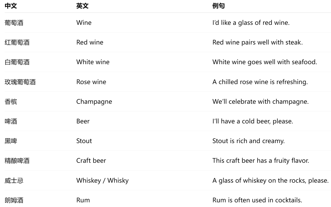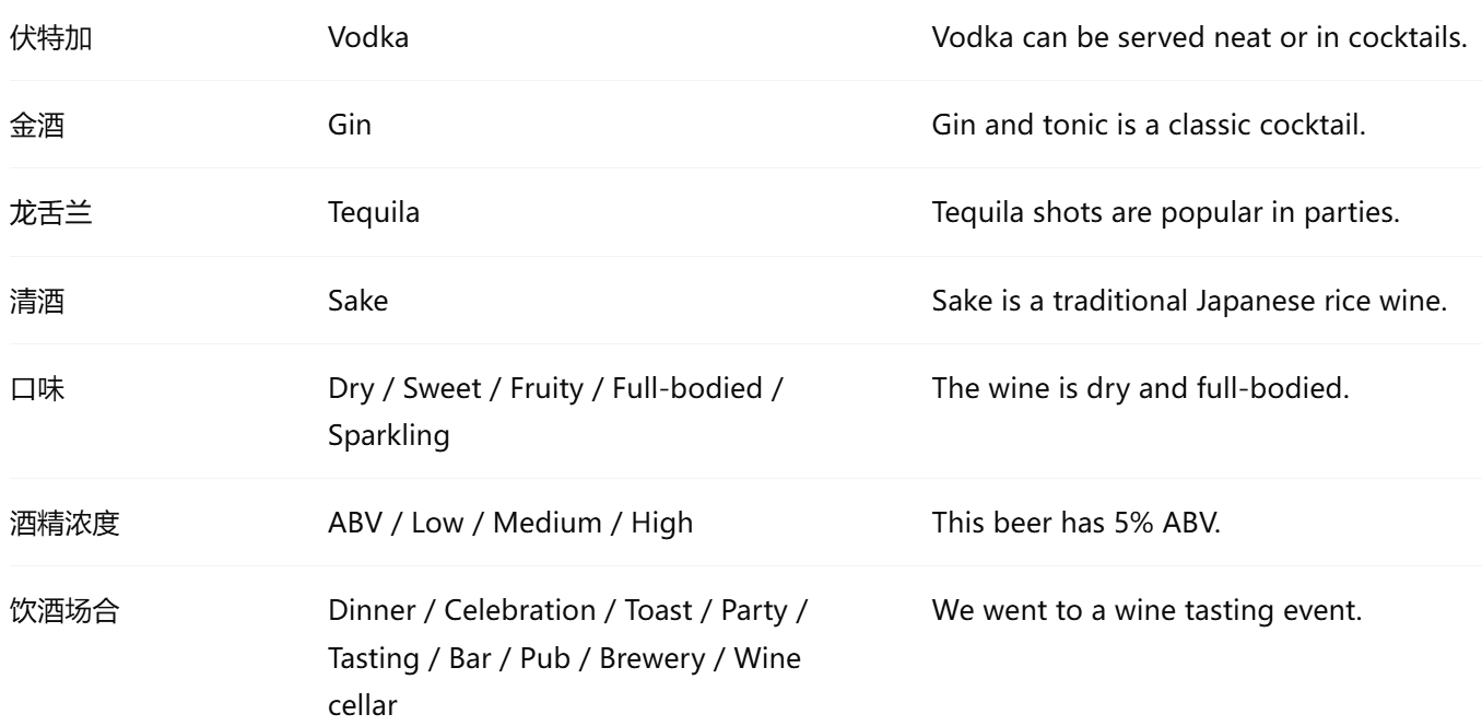 - 英文:Different types of alcohol are suitable for different occasions; check flavor and pairing beforehand.