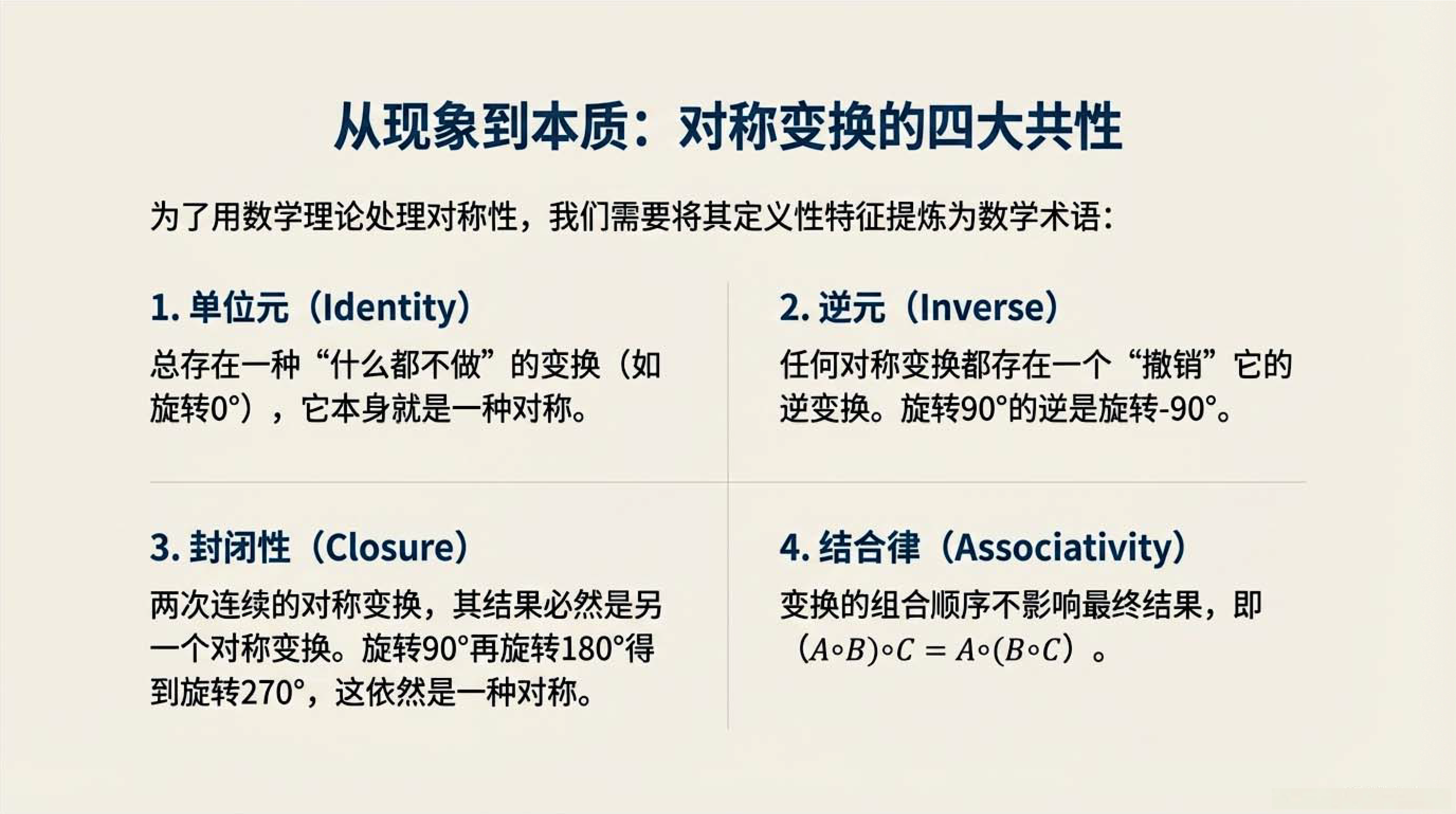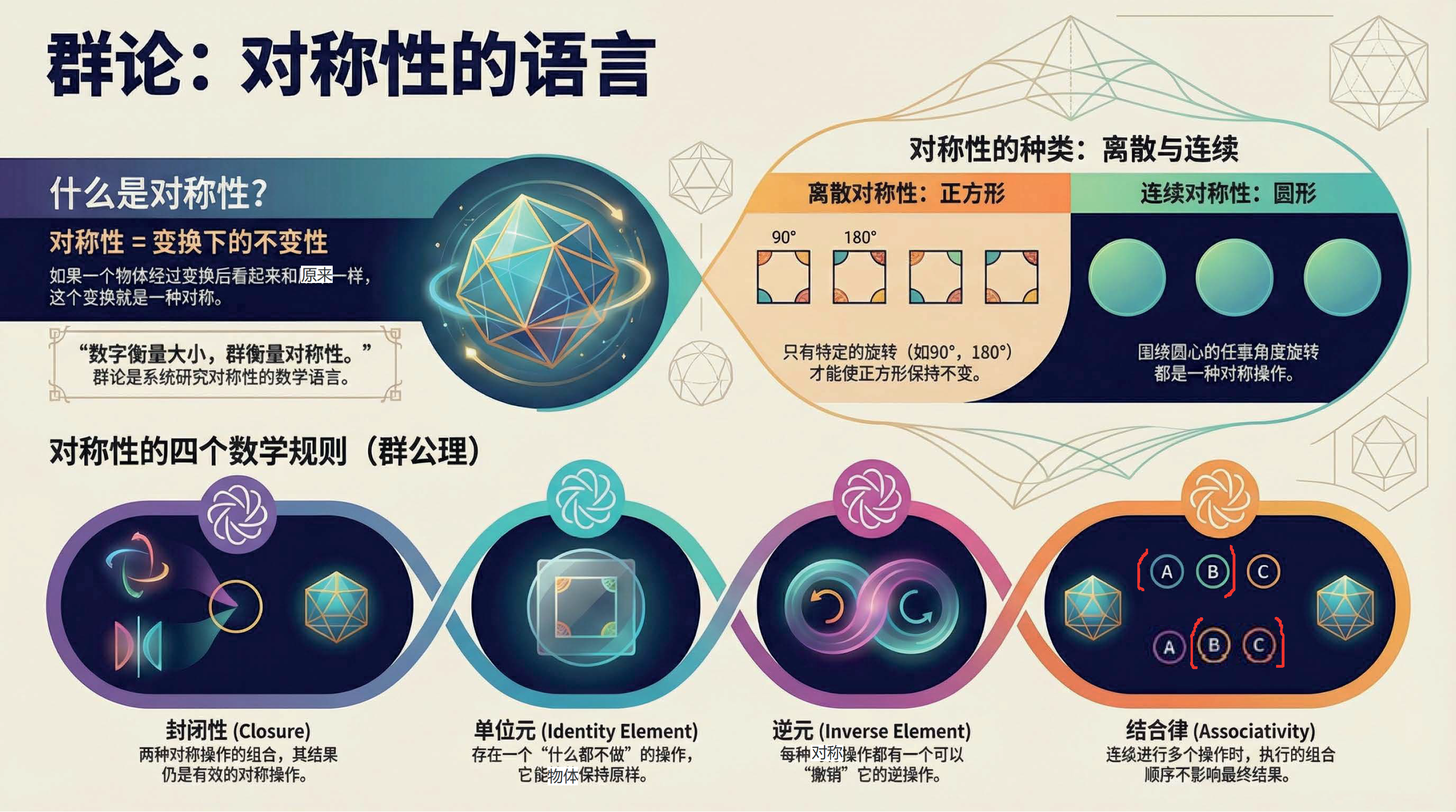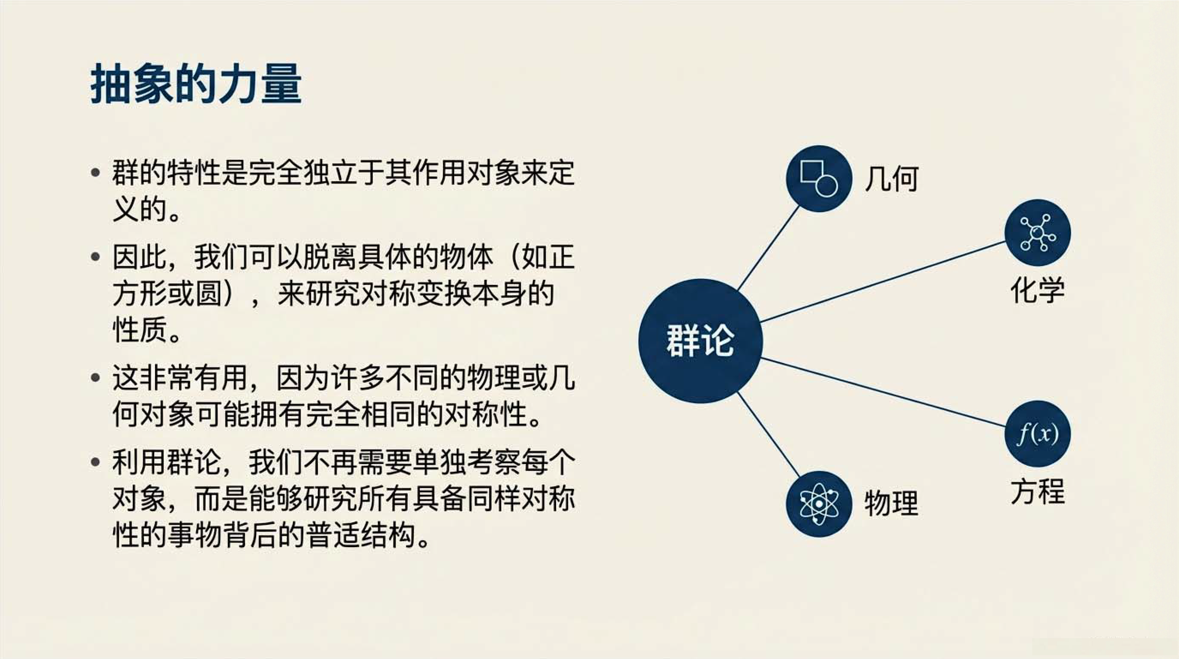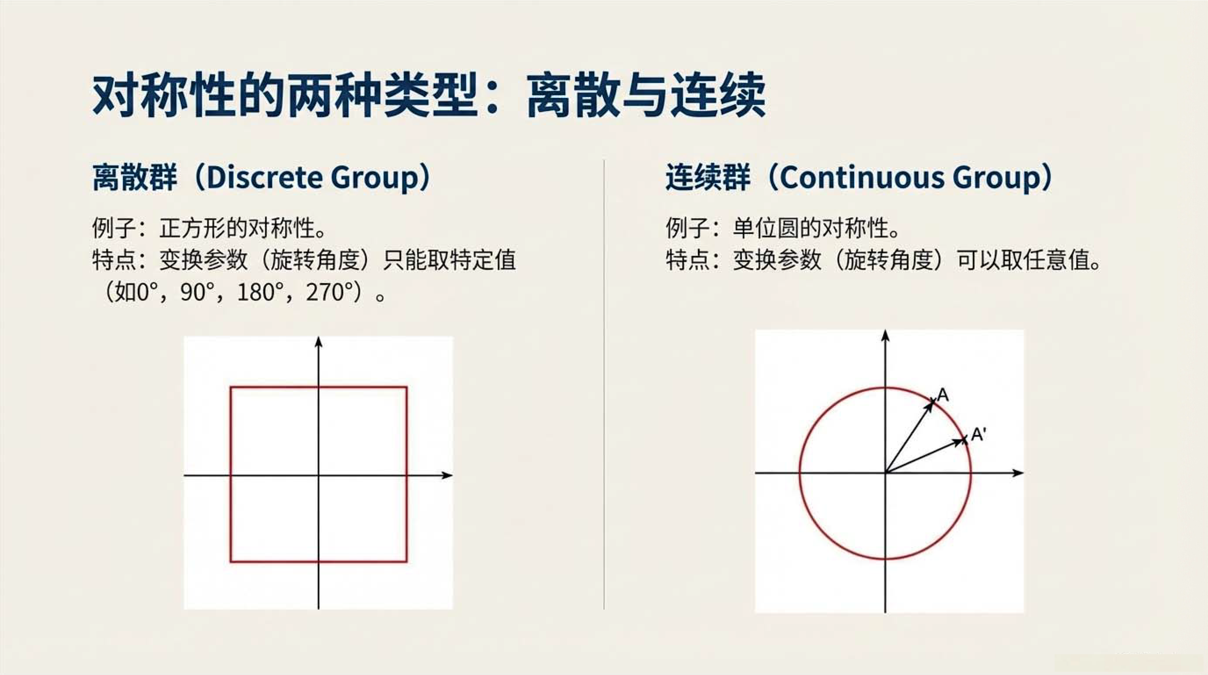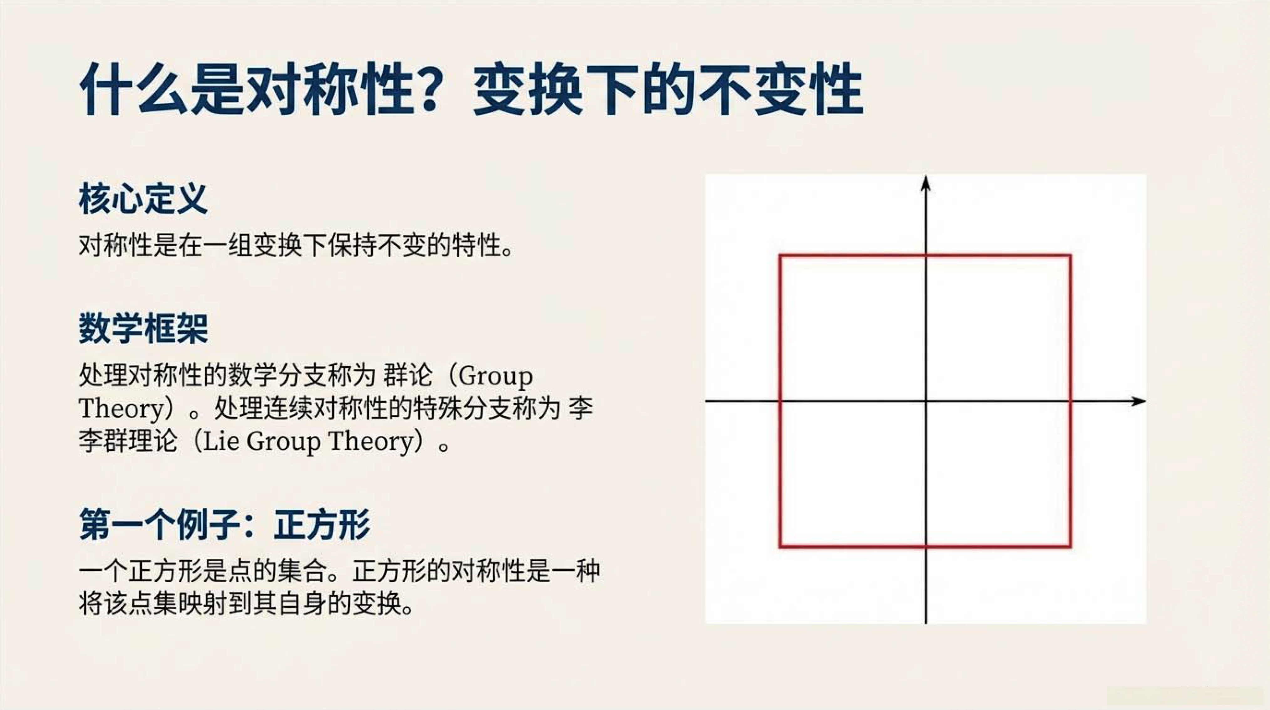 第4课视频的主要内容: 介绍了群论是系统研究对称性的数学语言,涵盖了对称性的种类(离散与连续)及四个数学规则(群公理)。群论可用于探索物理学中的基本对称性,推导相关表示以揭示基本粒子信息,还能脱离具体物体研究对称变换普适结构。第4课完整讲义:zhuanlan.zhihu.com00:0000:5305:0606:4008:0612:1115:1916:09 结束语