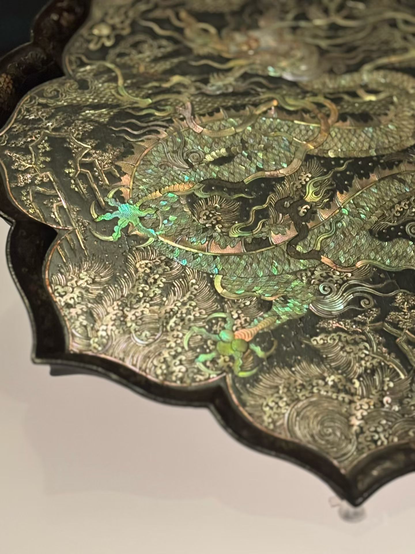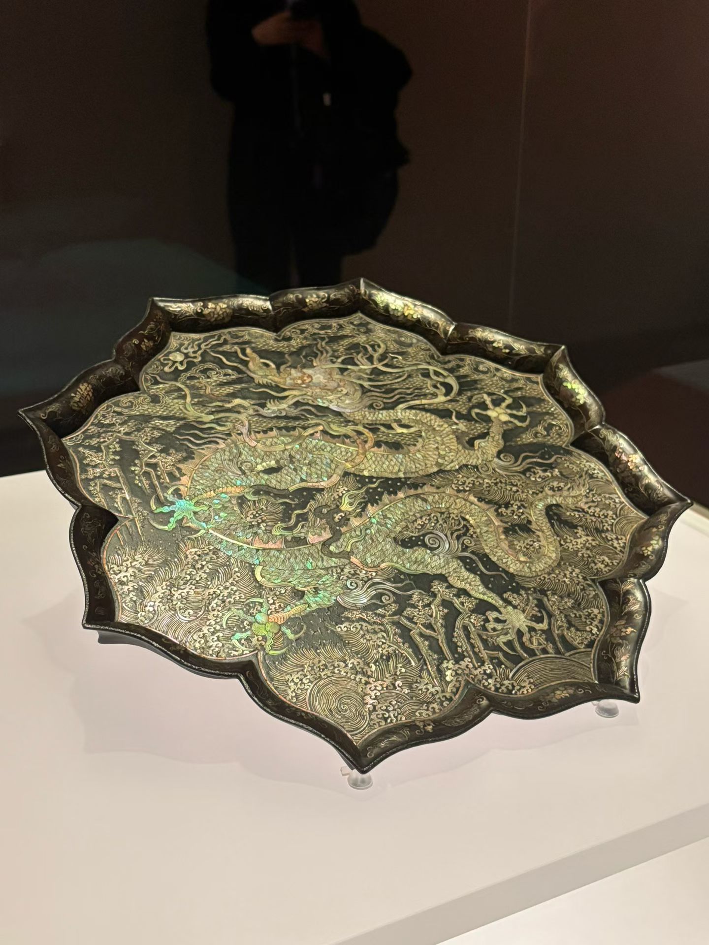 黑漆螺钿海水龙纹菱花形盘,元代