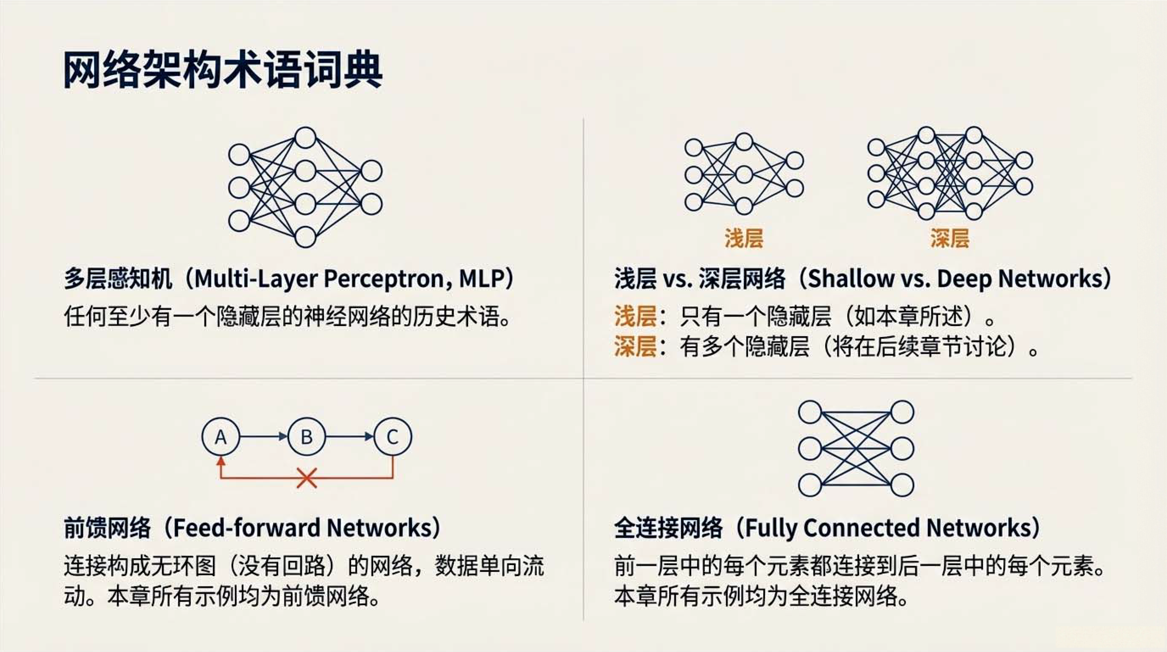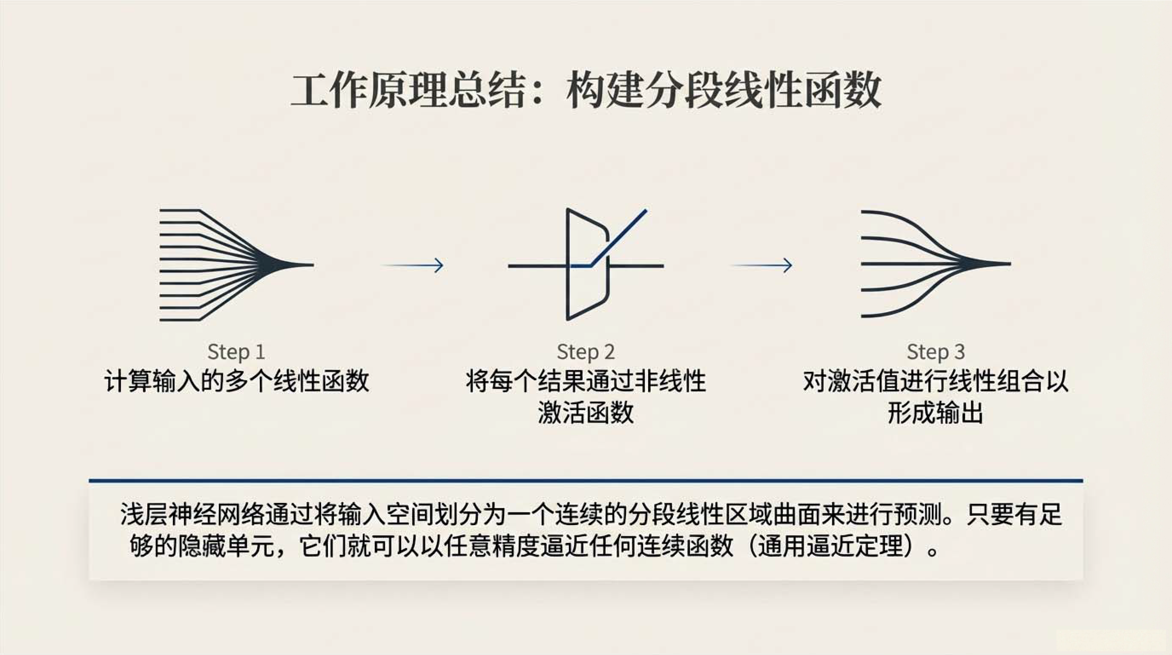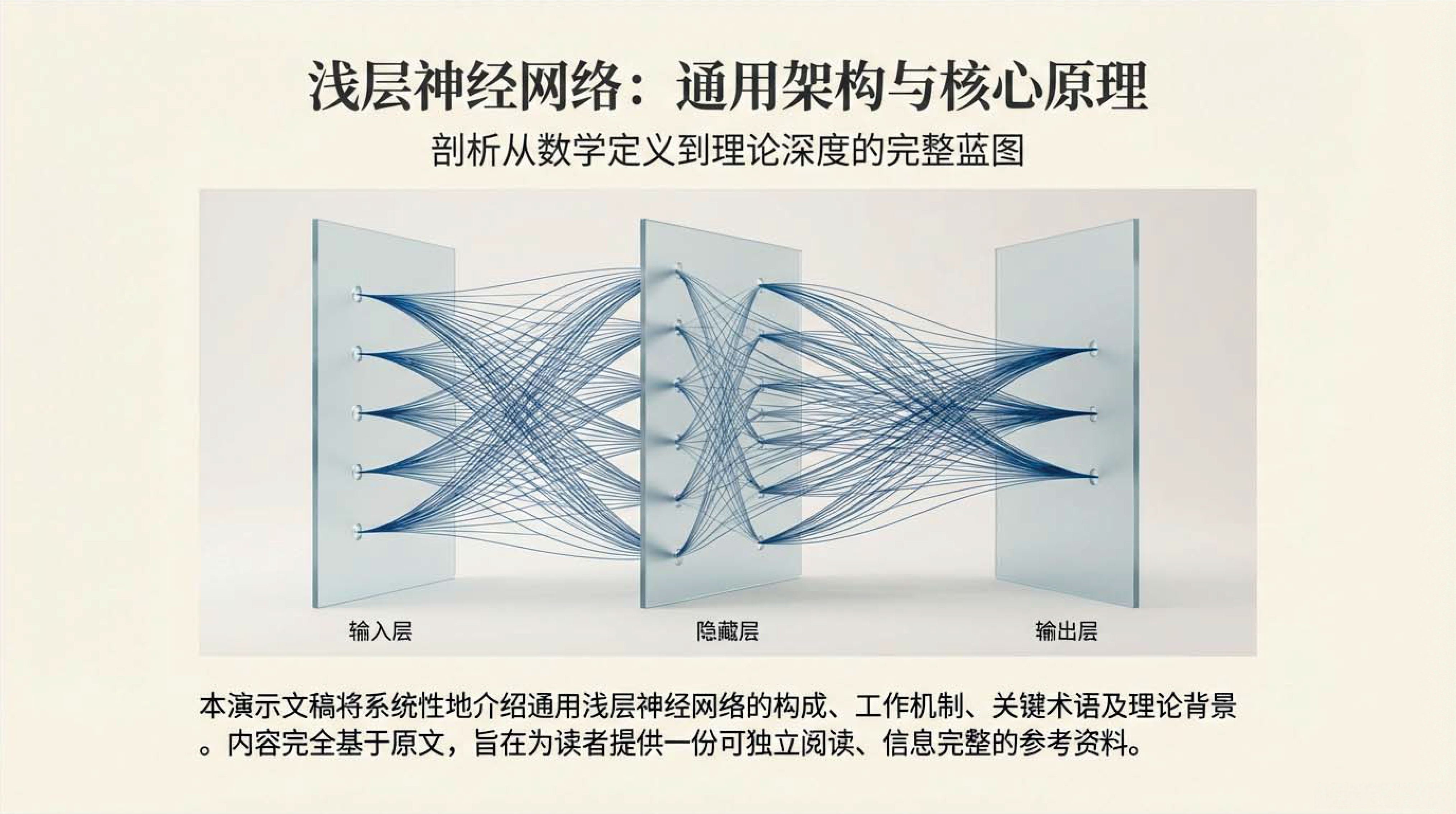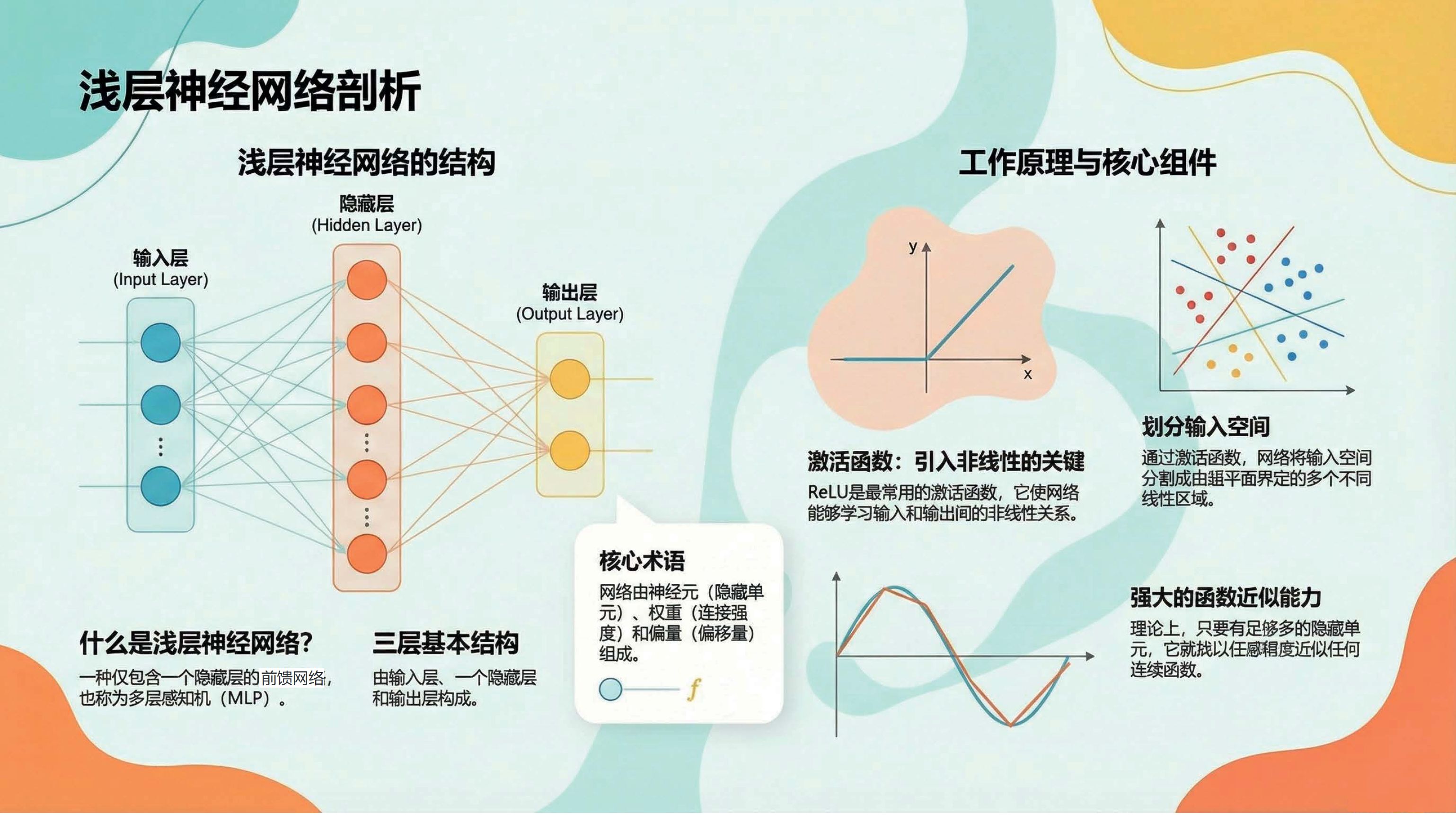 第5课视频的主要内容: 介绍了浅层神经网络是仅包含一个隐藏层的前馈网络,也称为多层感知机,由输入层、一个隐藏层和输出层构成。它具有特定的工作原理与核心组件,如常用的ReLU 激活函数,具备强大的函数近似能力,还介绍了相关网络架构术语。