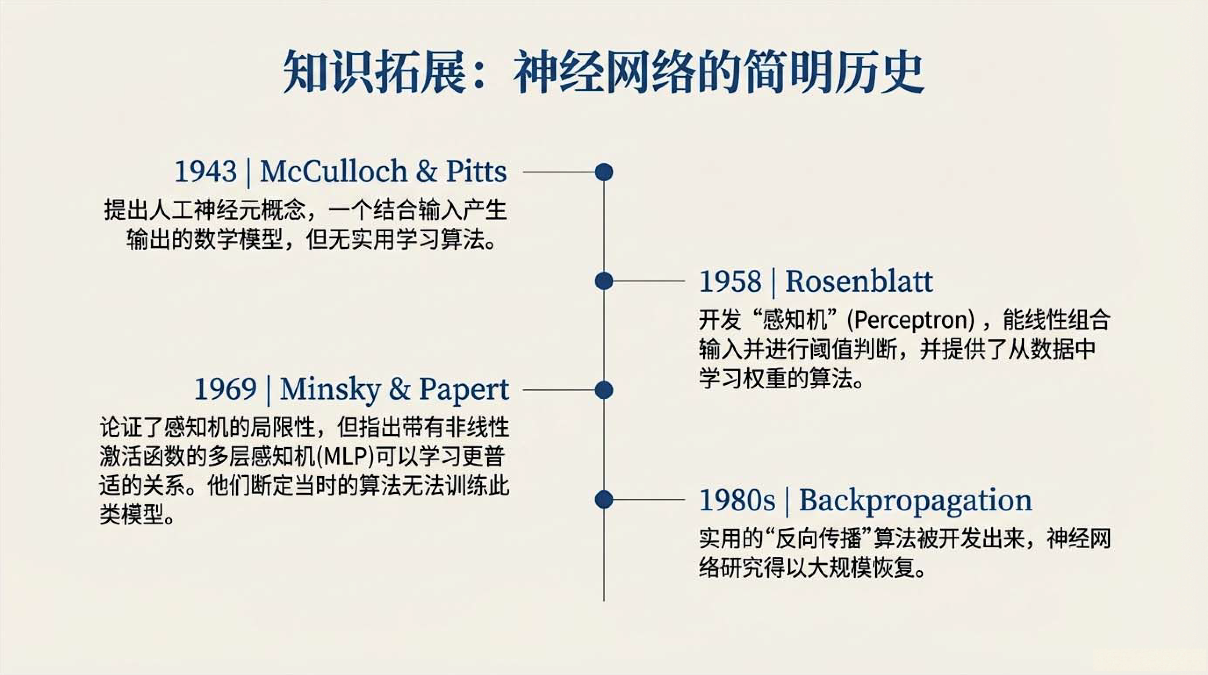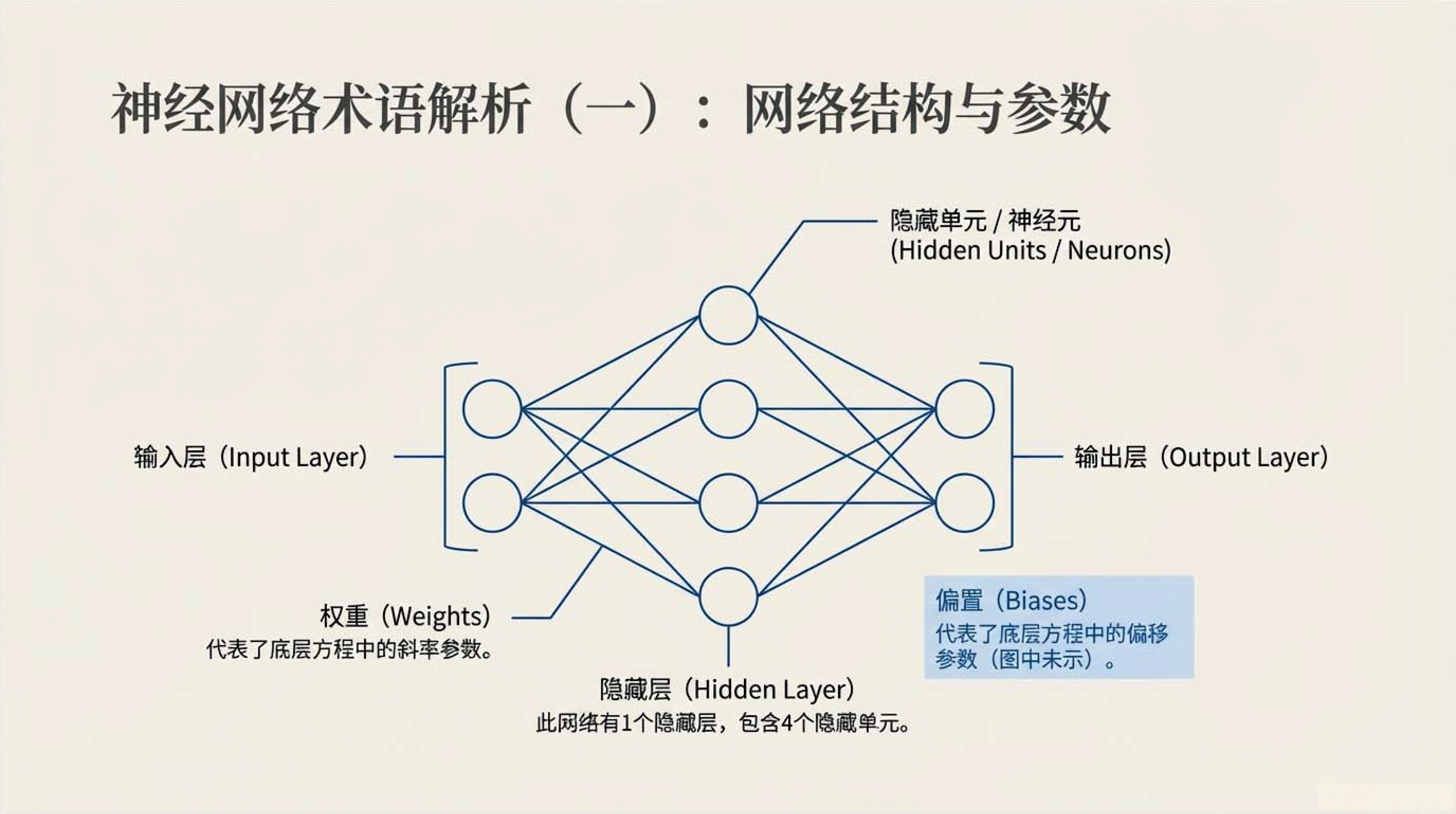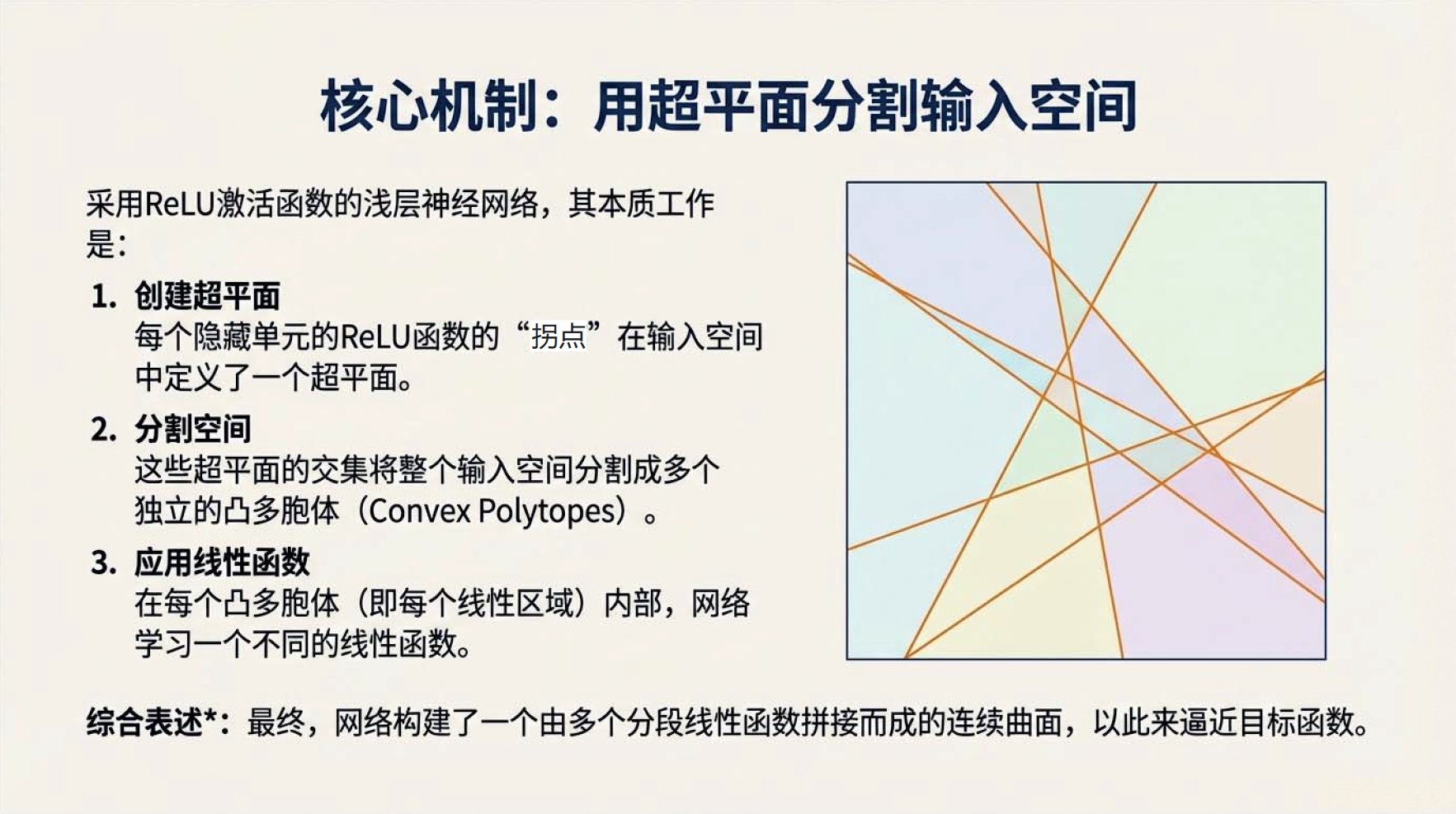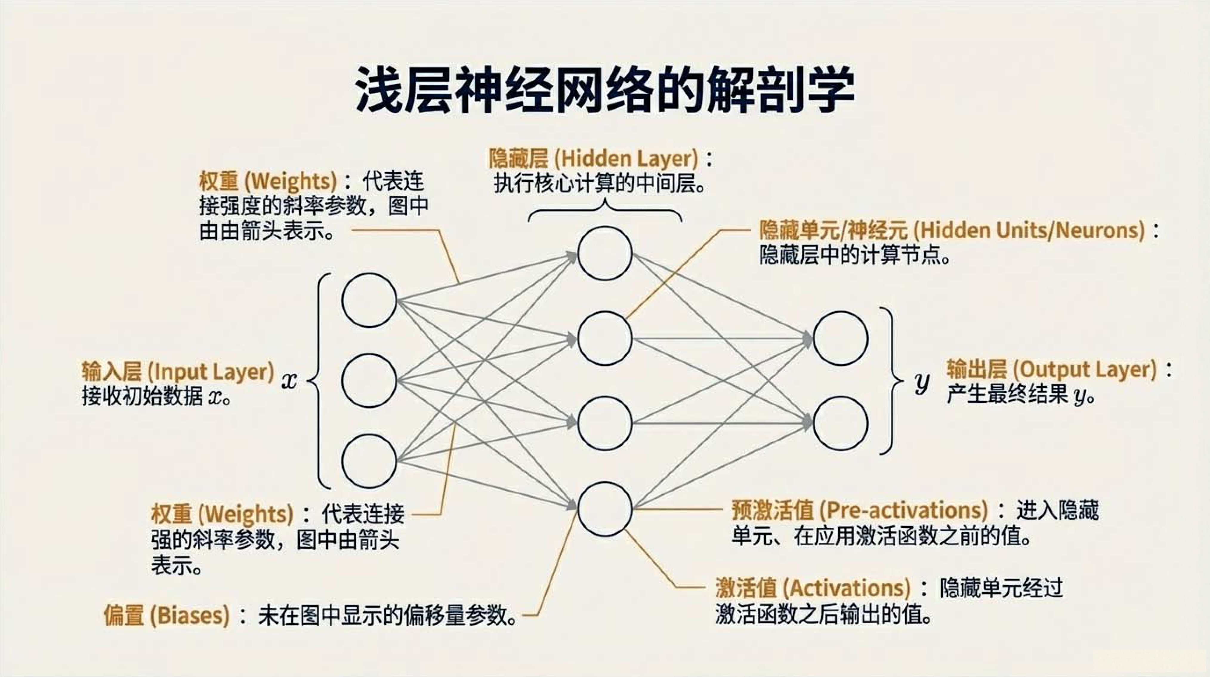 第5课视频的主要内容: 介绍了浅层神经网络是仅包含一个隐藏层的前馈网络,也称为多层感知机,由输入层、一个隐藏层和输出层构成。它具有特定的工作原理与核心组件,如常用的ReLU 激活函数,具备强大的函数近似能力,还介绍了相关网络架构术语。