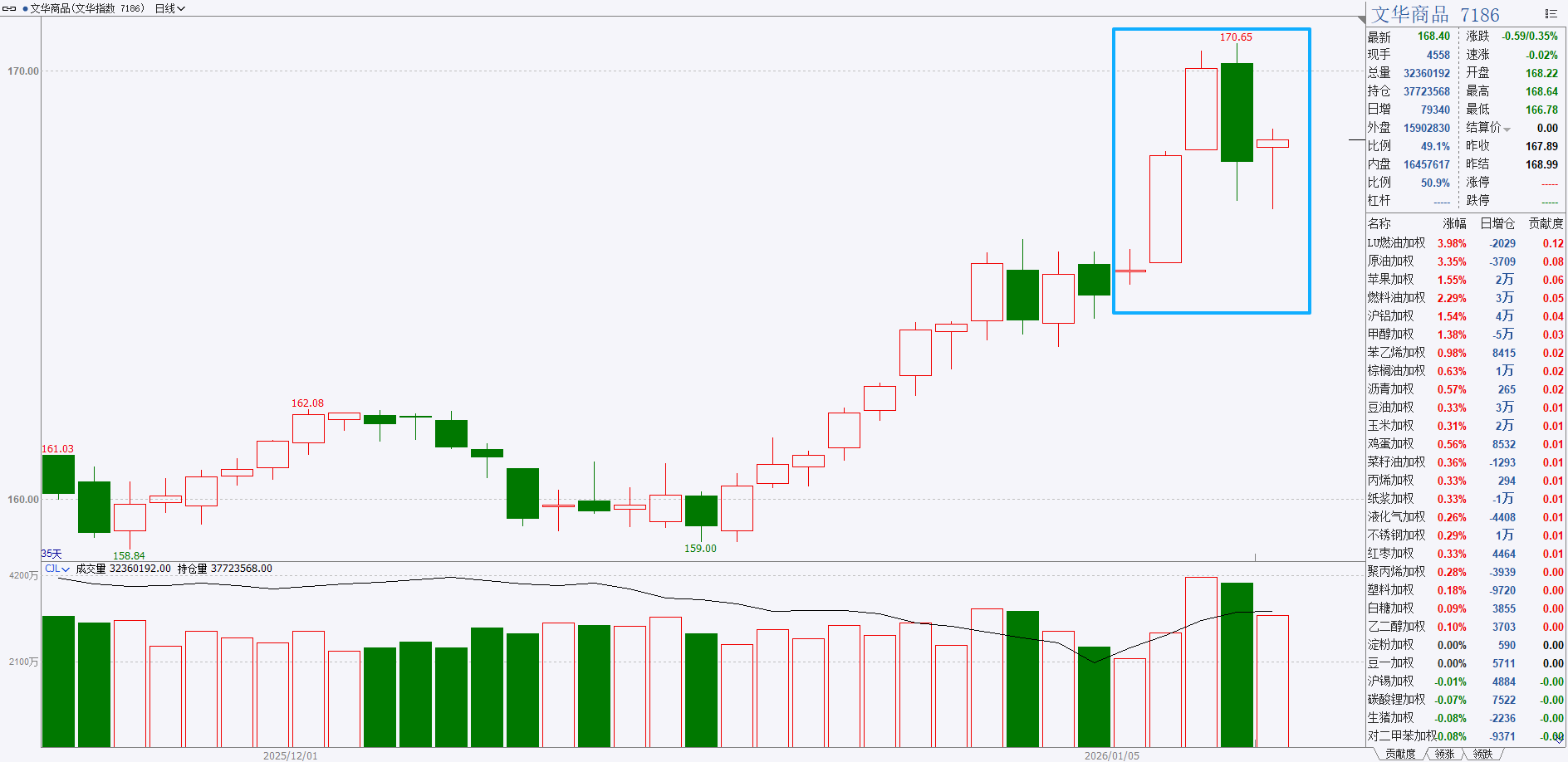 冲高回落,如昨日风险提示,处于170重要位置,警惕回落。不过这个回落,依然处于小级别的支撑之上,我对此的看法是:给出强势品种回补多单的机会。弱势品种依旧是要等待日线的转变。