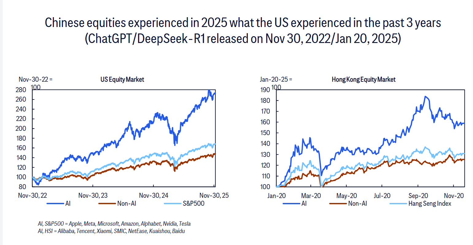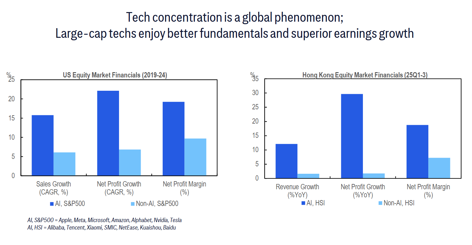 “美股2019-24年财务表现图”(文档第3页)和“港股2025Q1-Q3财务表现图”(文档第3页)印证了这一点:美股AI龙头净利润率达20%以上,营收和利润增速(CAGR)均超15%,大幅跑赢非AI企业;港股AI板块同样强势,净利润增长率突破30%,营收和利润率表现也显著优于非AI板块。
