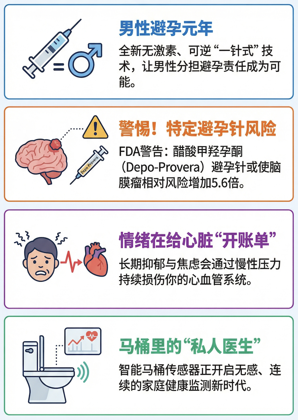 【🖊️关键词】避孕针风险;FDA 黑框警告;脑膜瘤;男性避孕革命;输精管水凝胶;膳食硝酸盐;甜菜根汁;心理心脏病学;长寿生物标志物;智能马桶传感器。