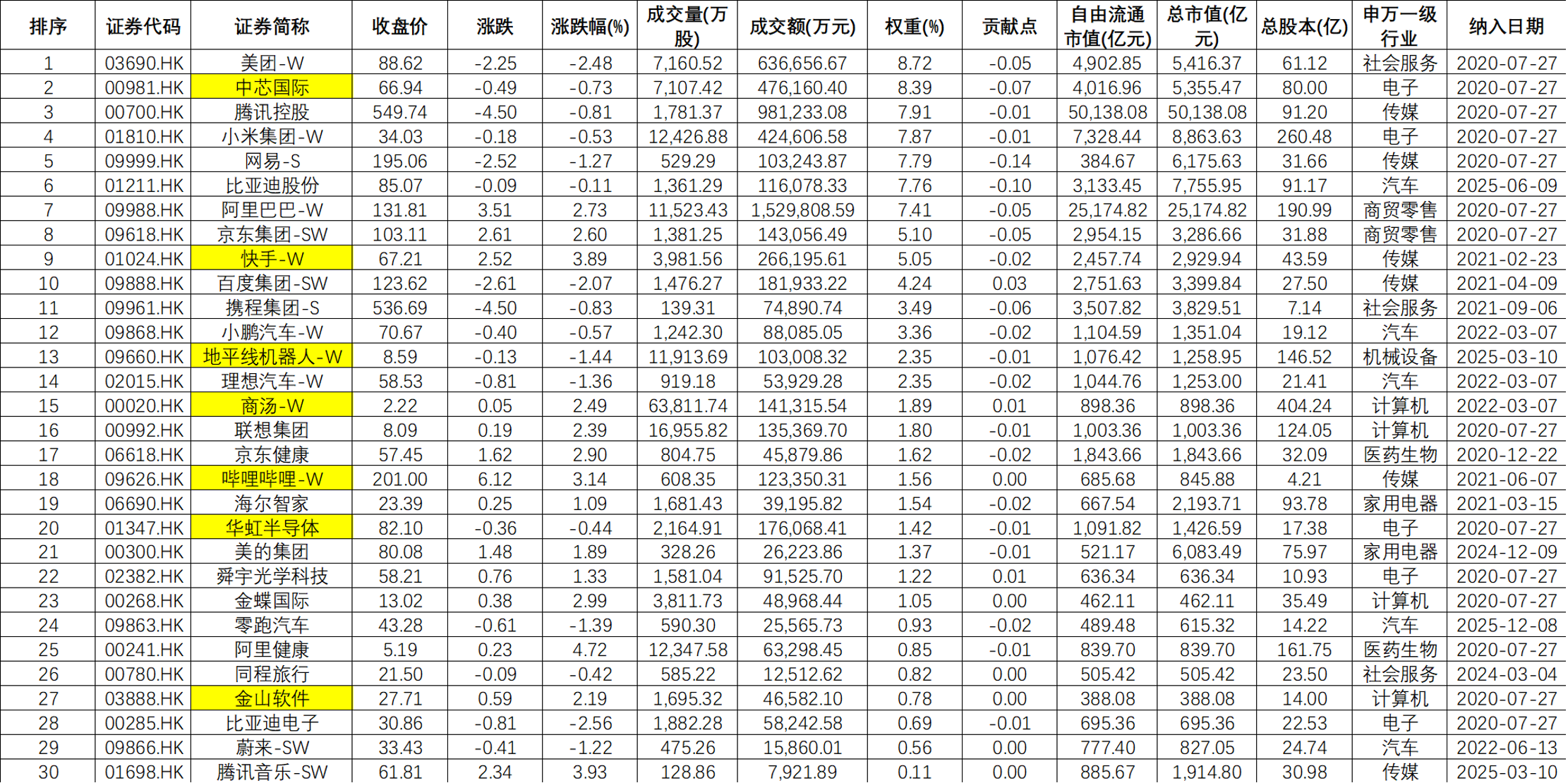 恒科成分股
