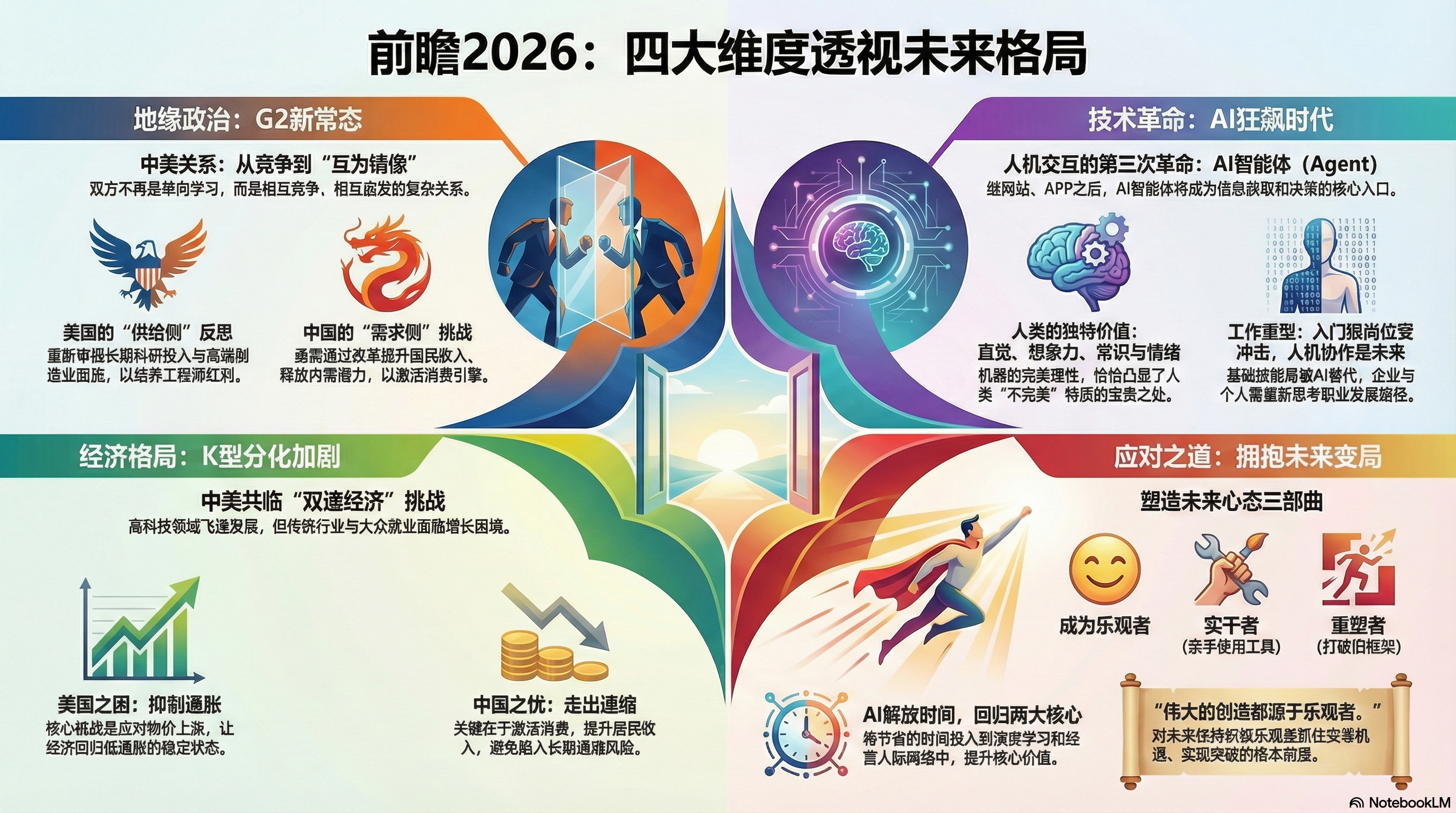 2. 技术革命:从AI智能体到科学突破。2026年将是AI技术深度重塑社会的一年,核心在于人机协同方式的根本改变。