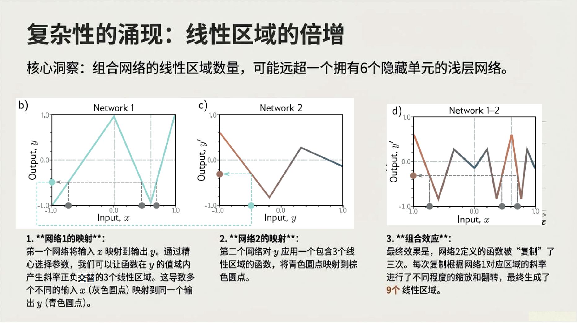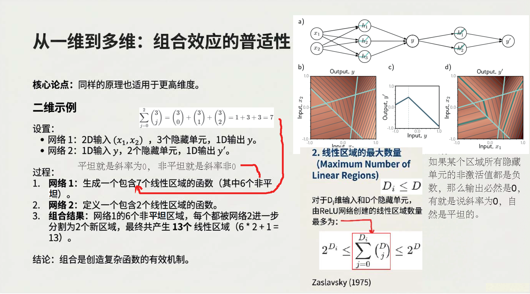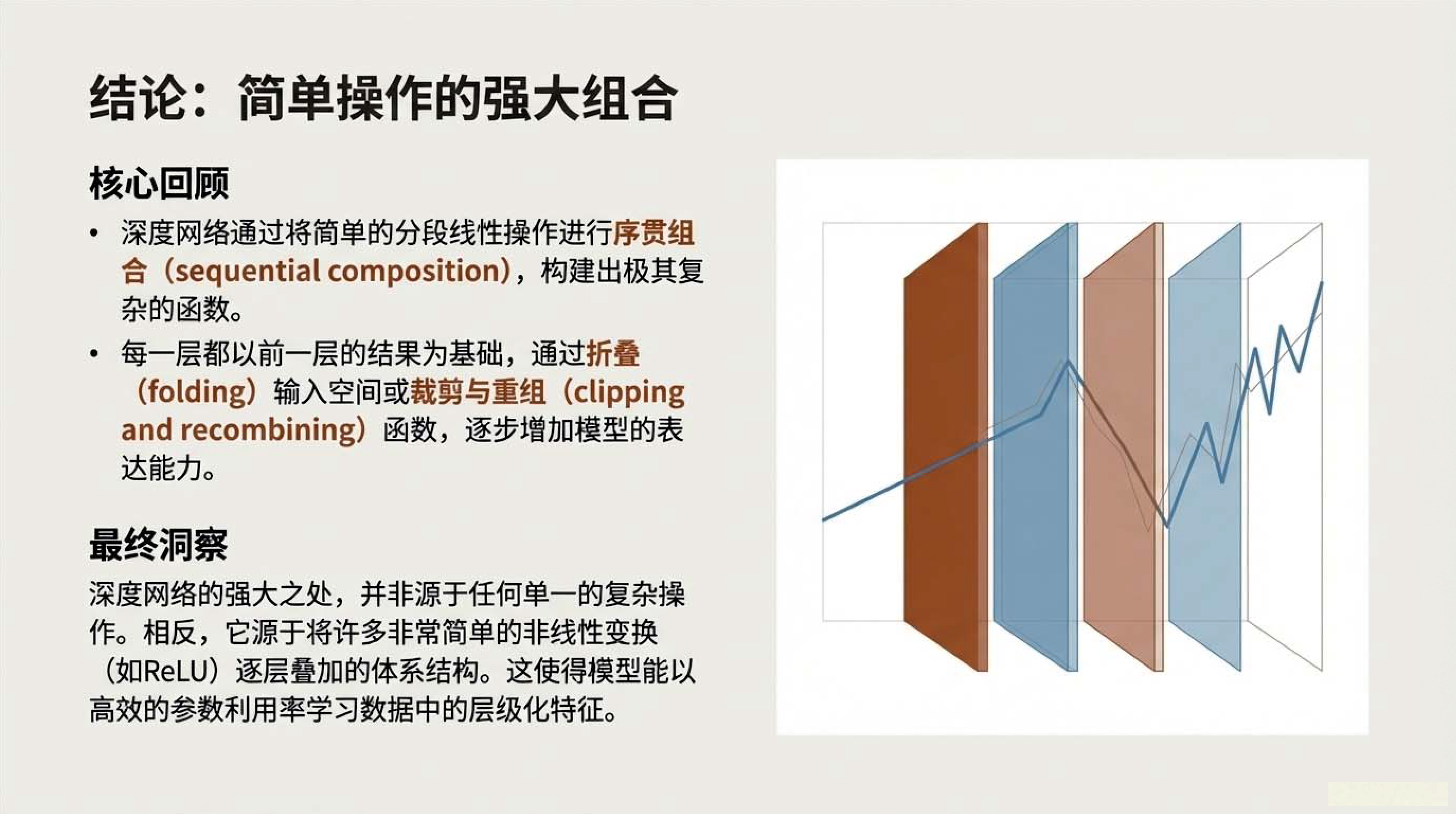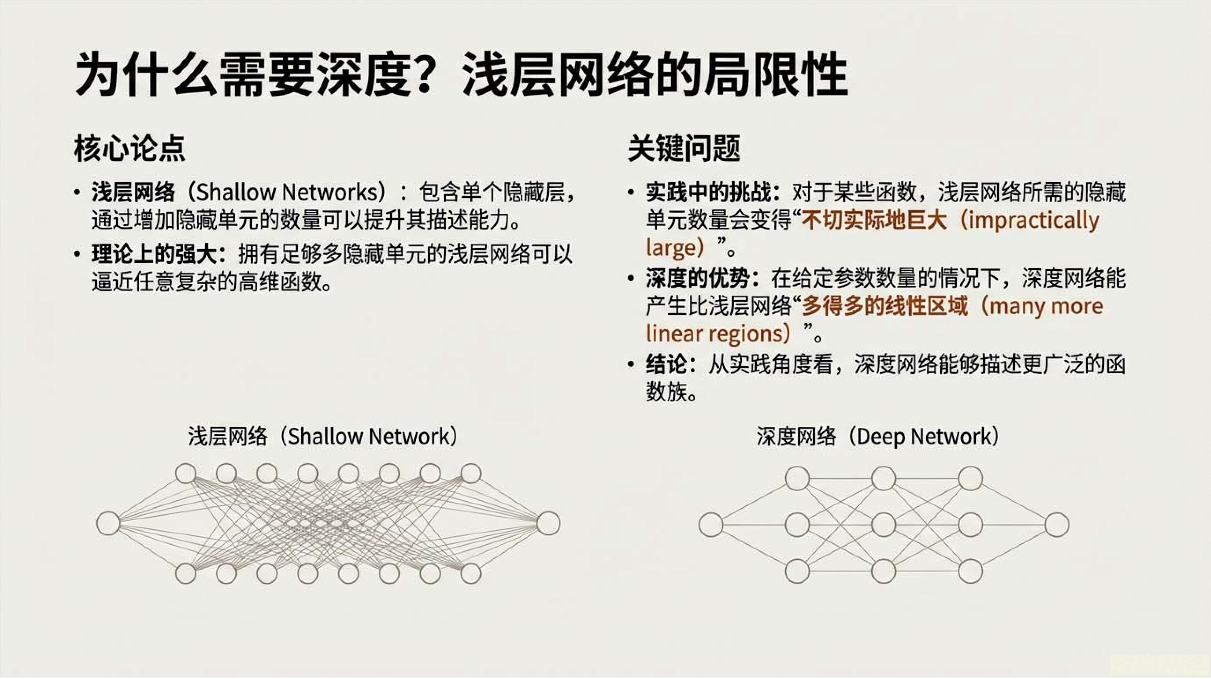 第6课视频的主要内容: 介绍了深度神经网络通过逐层组合简单操作,如折叠输入空间和裁剪与重组,能够以更少参数高效构建复杂模型。相比浅层网络,深度网络在相同参数量下能产生更多线性区域,从而提升表达能力。浅层网络通近复杂函数需要极多神经元,实践中面临挑战,而深度网络能描述更广泛的函数族。
