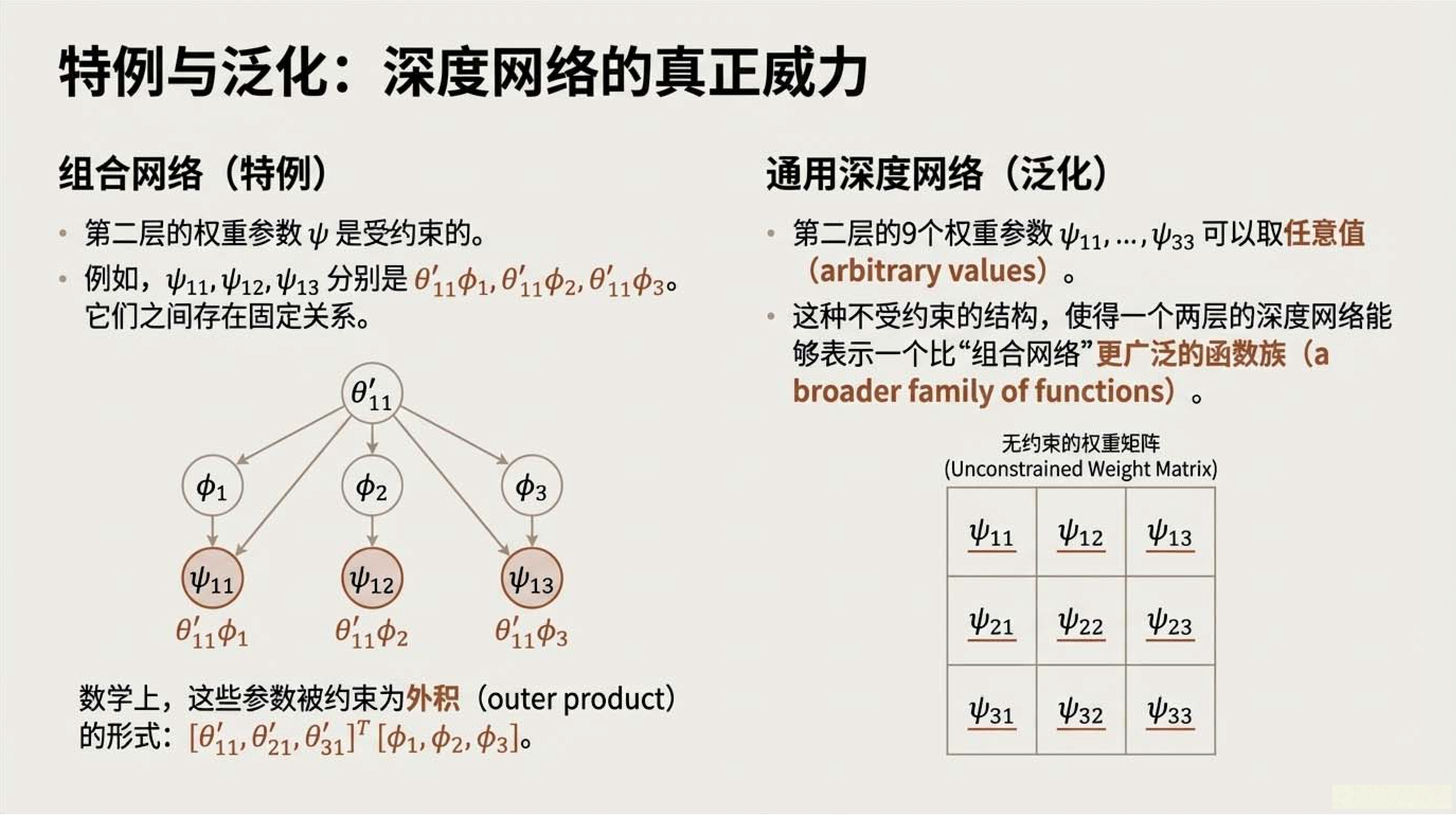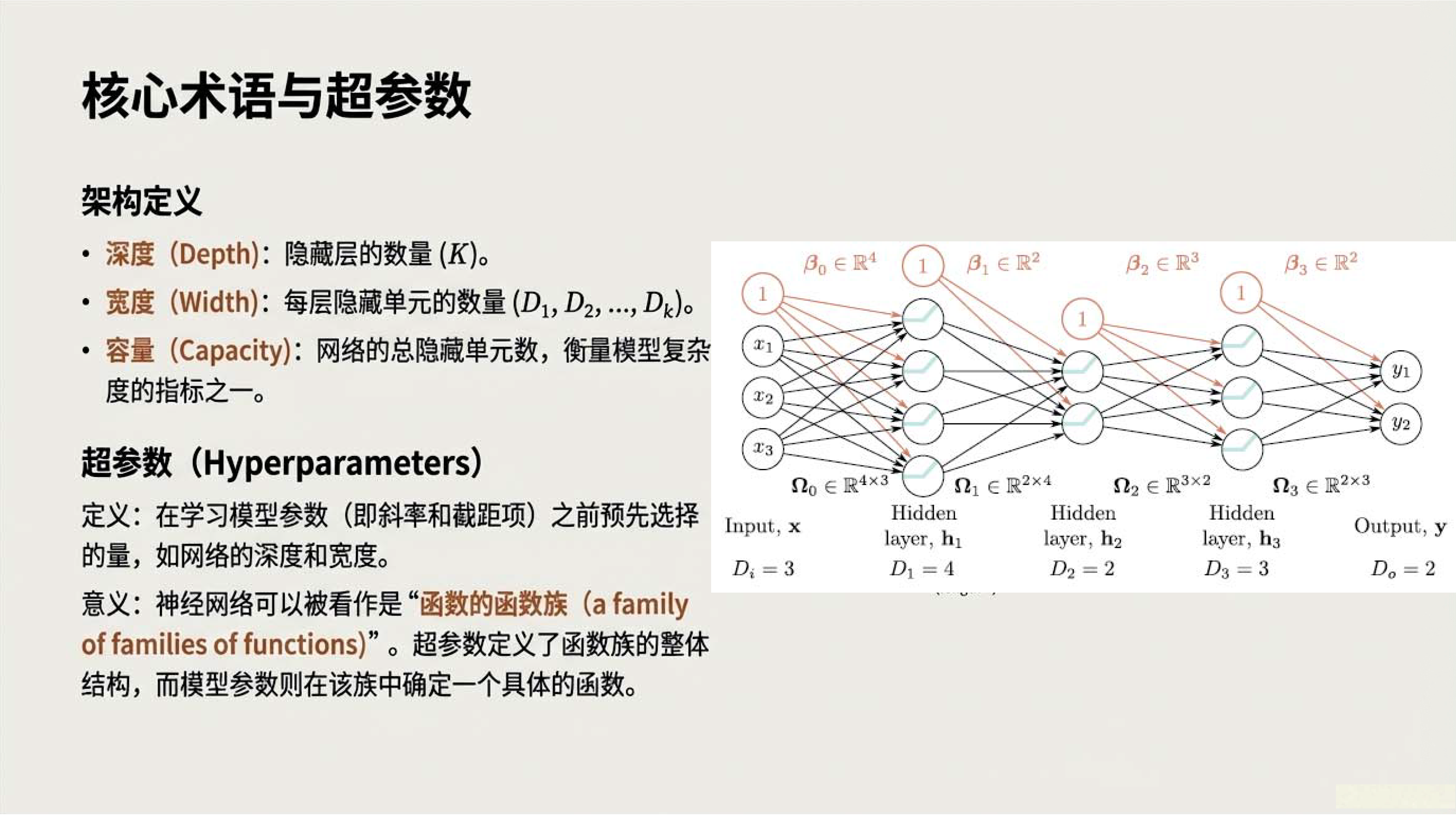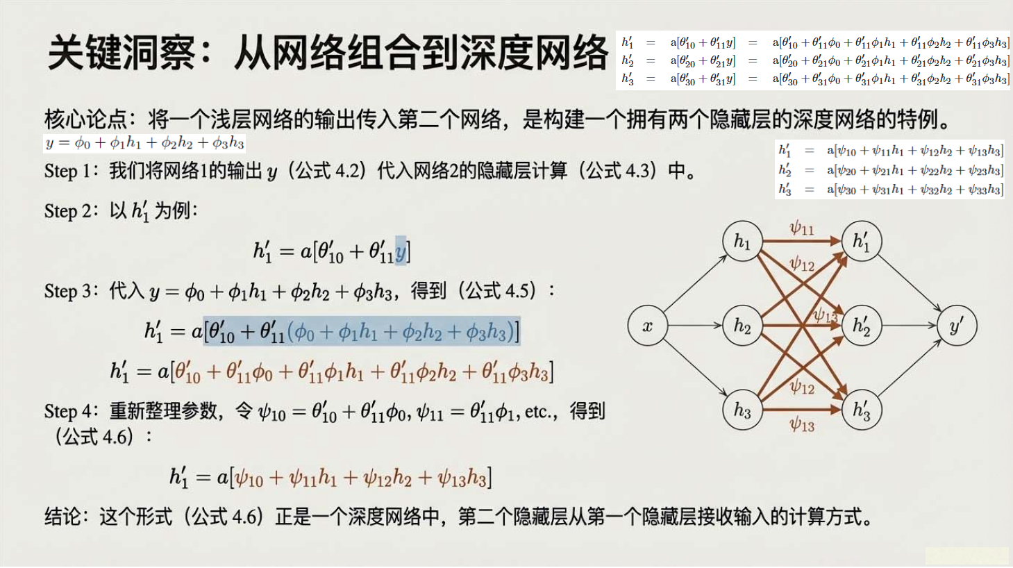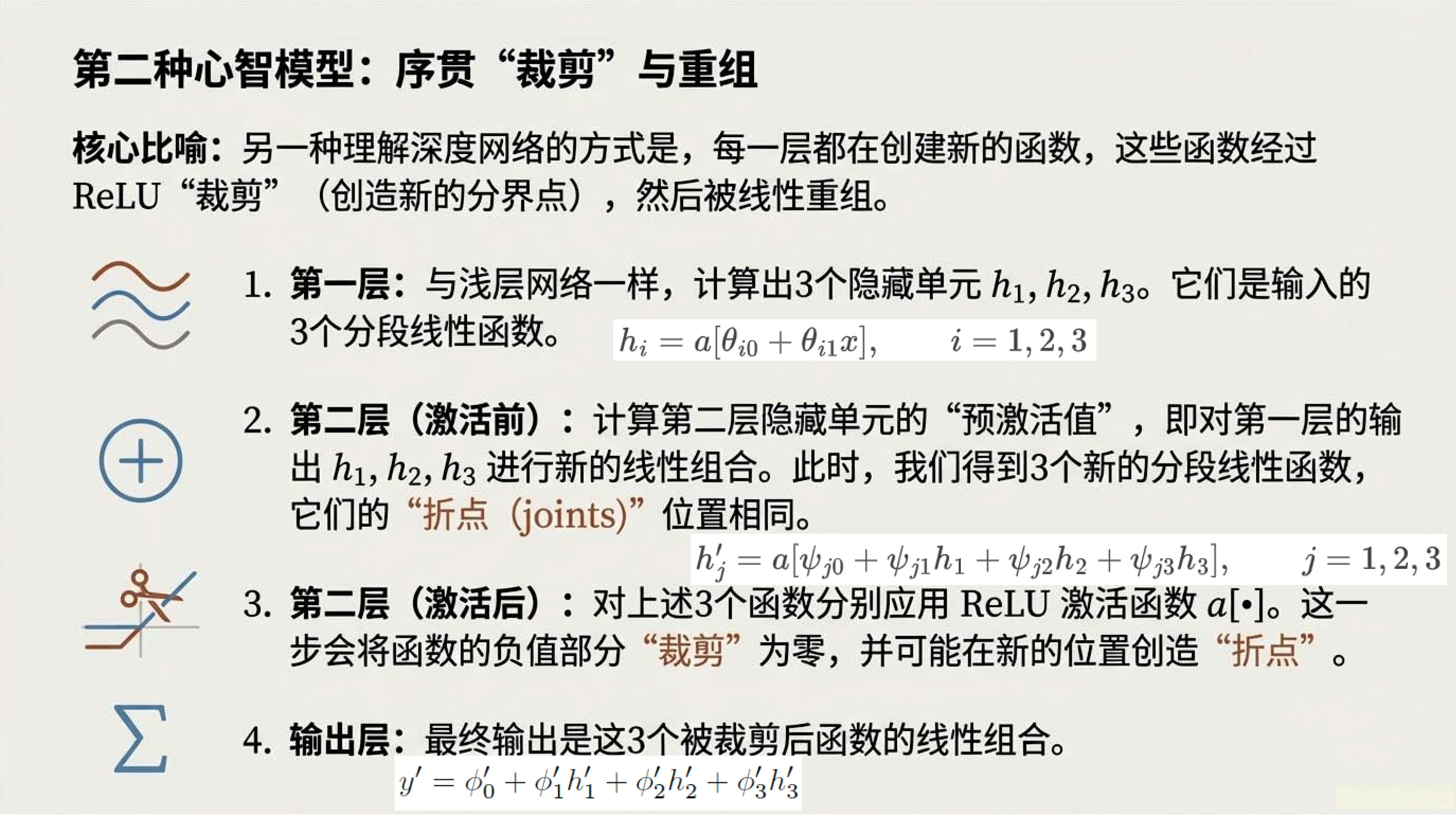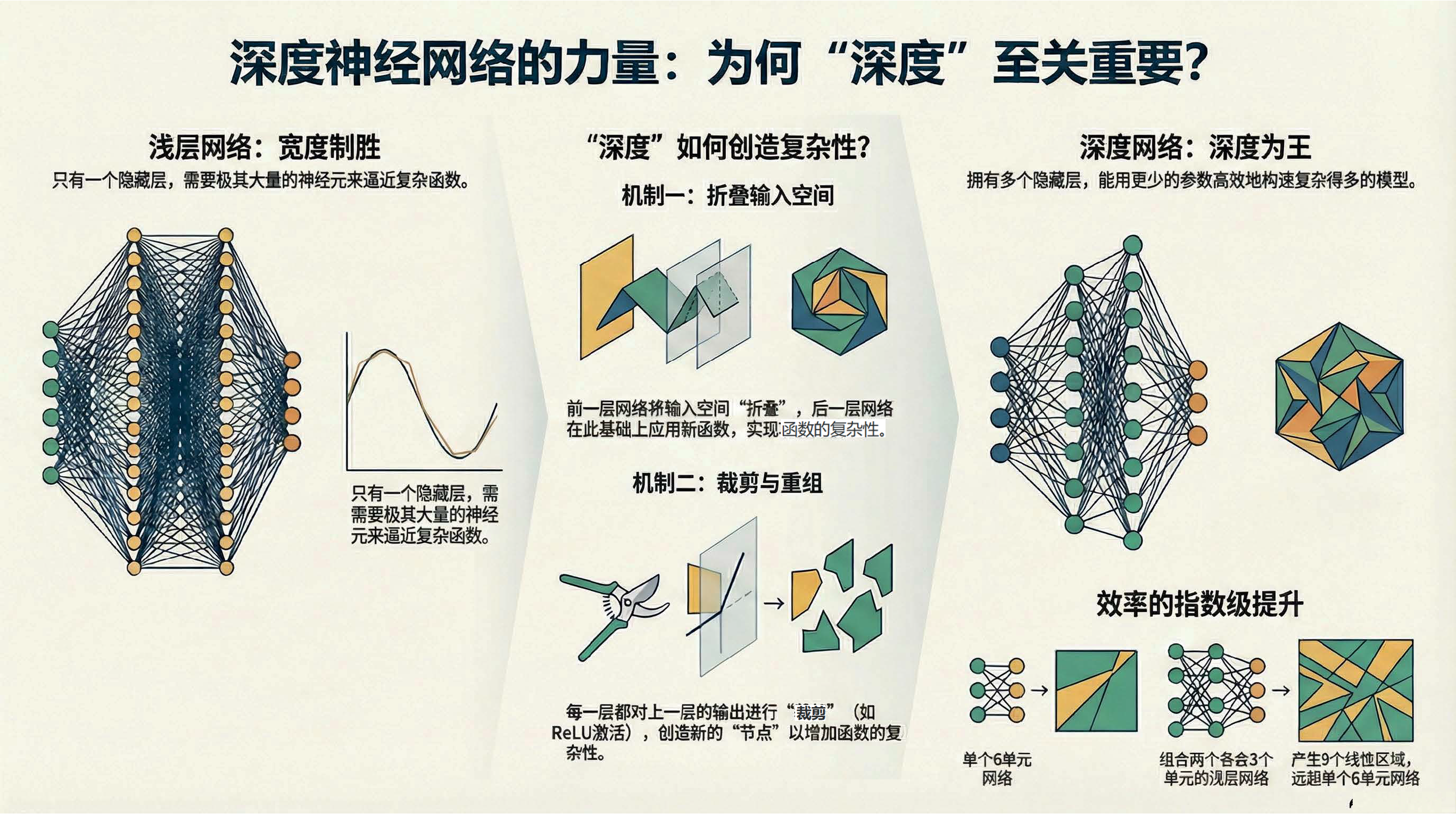 第6课视频的主要内容: 介绍了深度神经网络通过逐层组合简单操作,如折叠输入空间和裁剪与重组,能够以更少参数高效构建复杂模型。相比浅层网络,深度网络在相同参数量下能产生更多线性区域,从而提升表达能力。浅层网络通近复杂函数需要极多神经元,实践中面临挑战,而深度网络能描述更广泛的函数族。