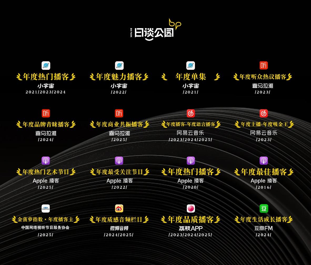 日谈公园,曾获小宇宙年度热门播客、喜马拉雅品牌青睐播客、Apple播客年度最佳播客、网易云音乐年度语言播客、荔枝APP年度品质播客等多项殊荣,并发起“日光派对”播客MCN,提供播客经济相关服务。