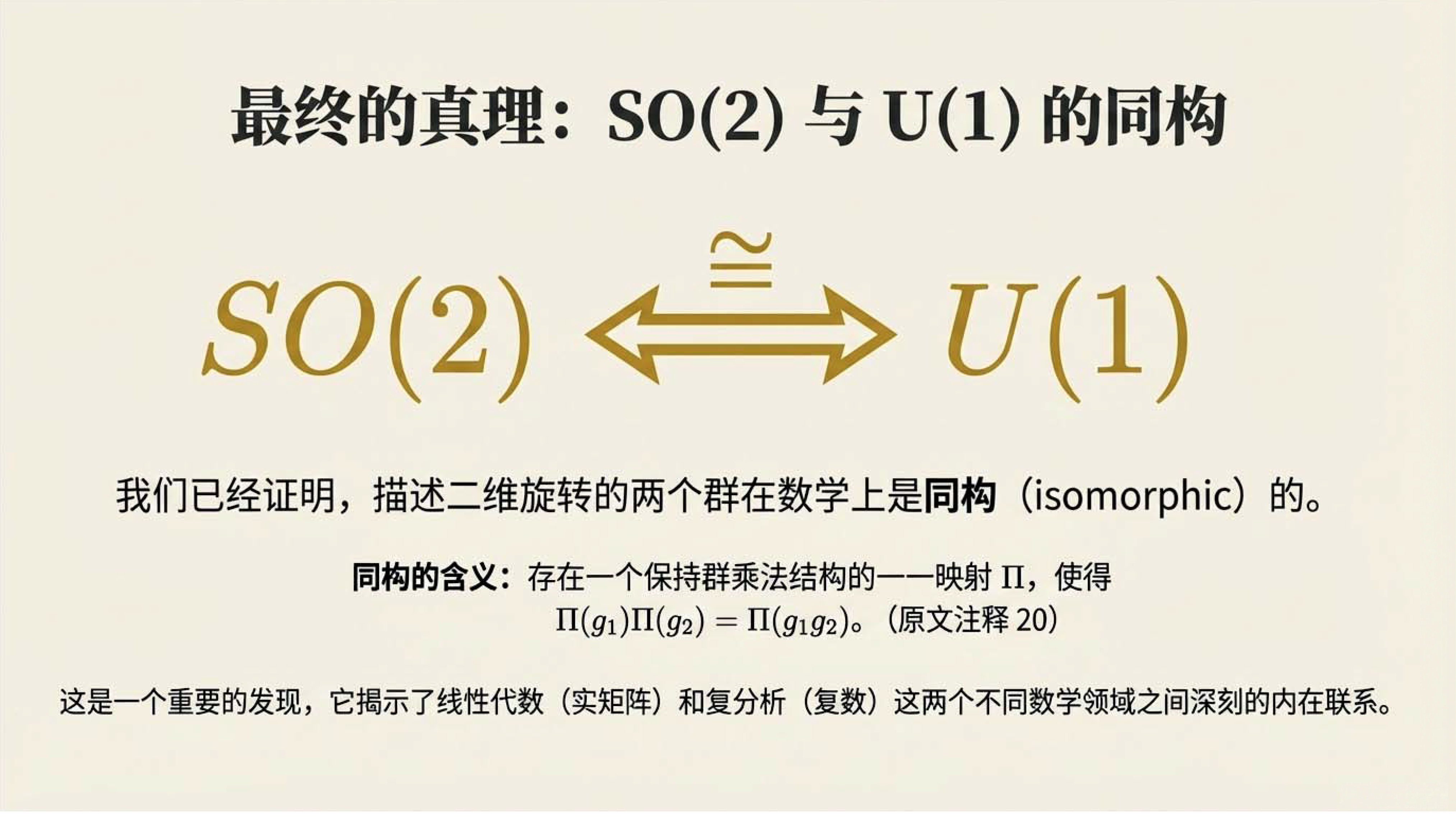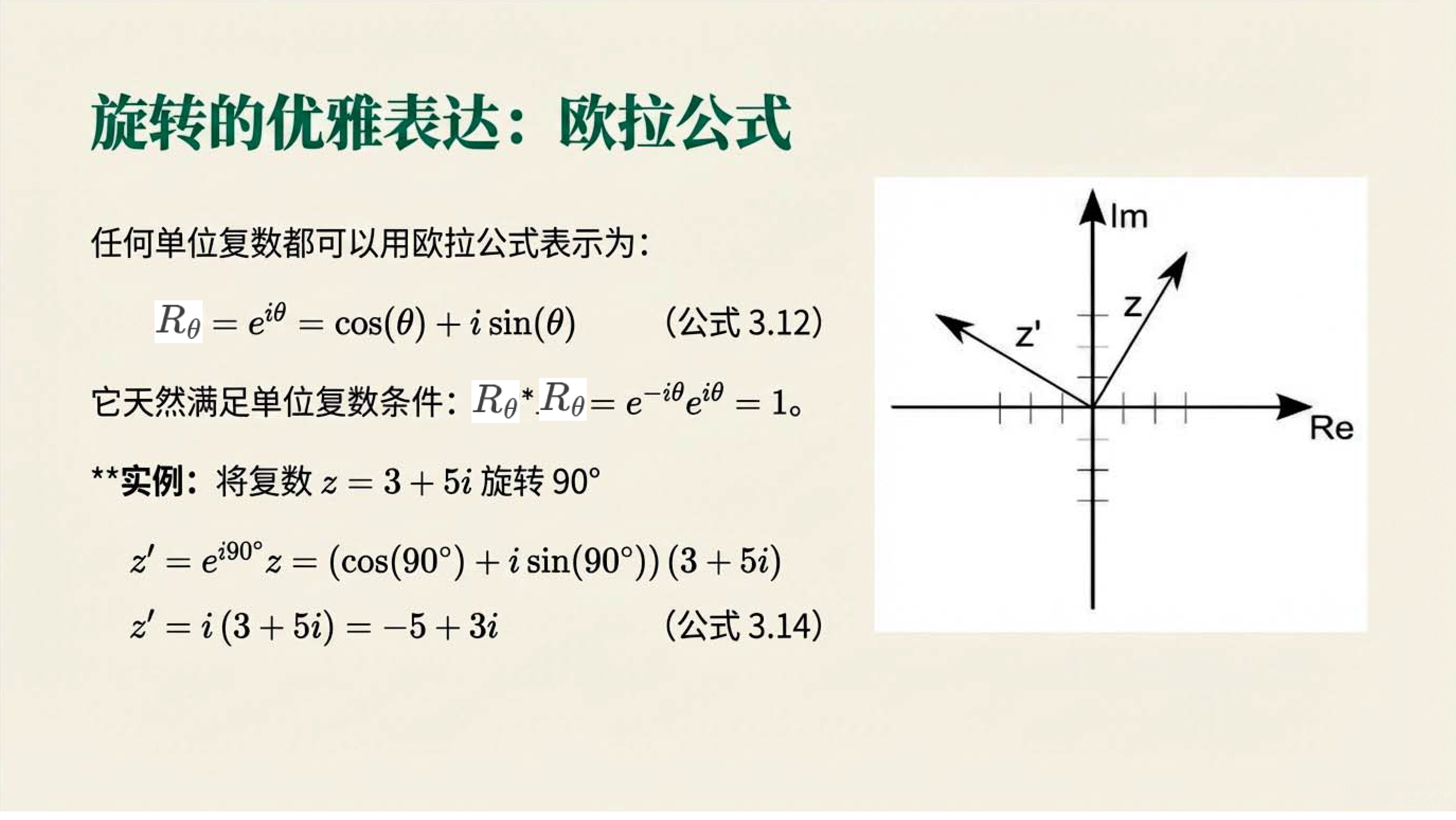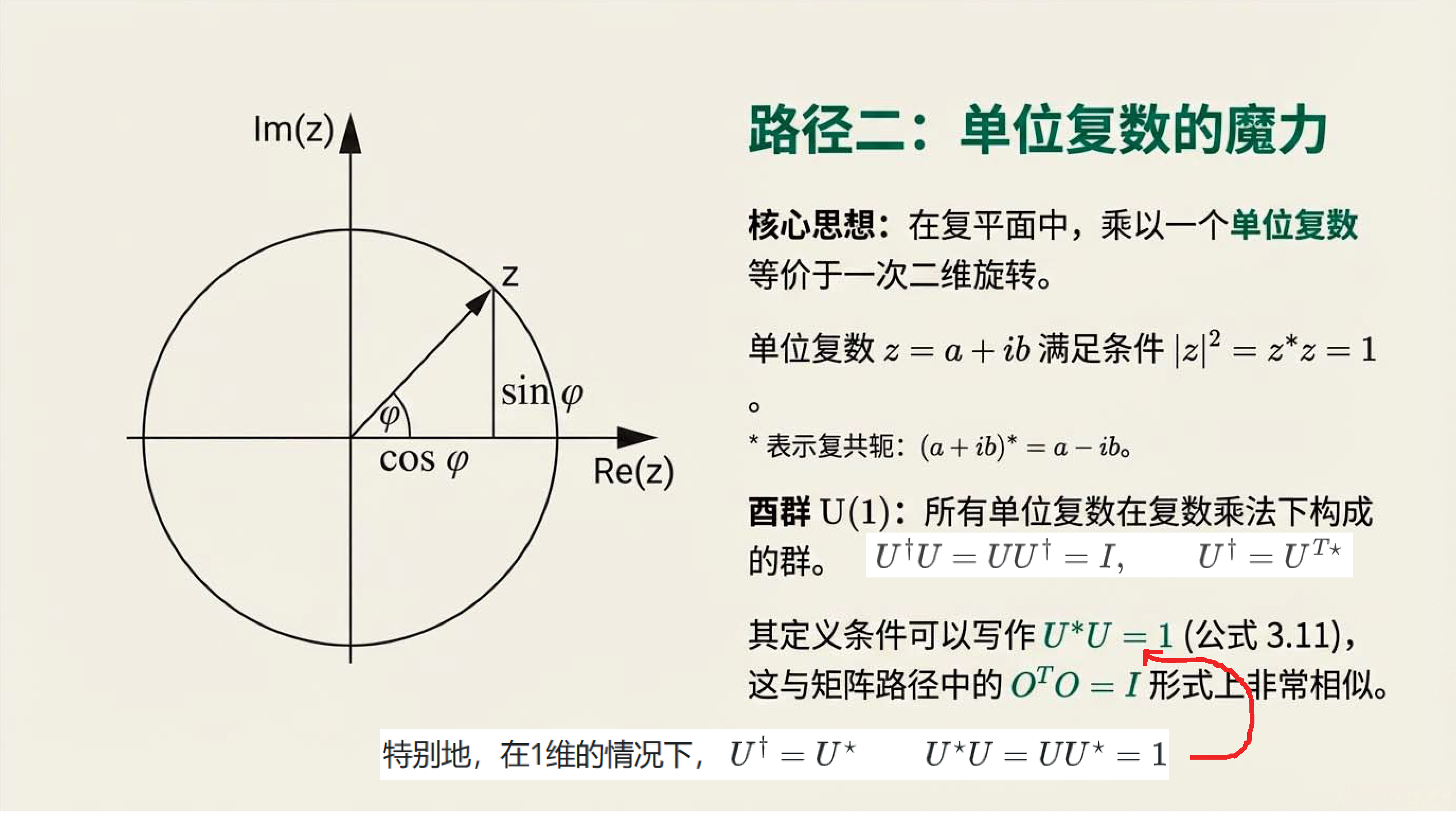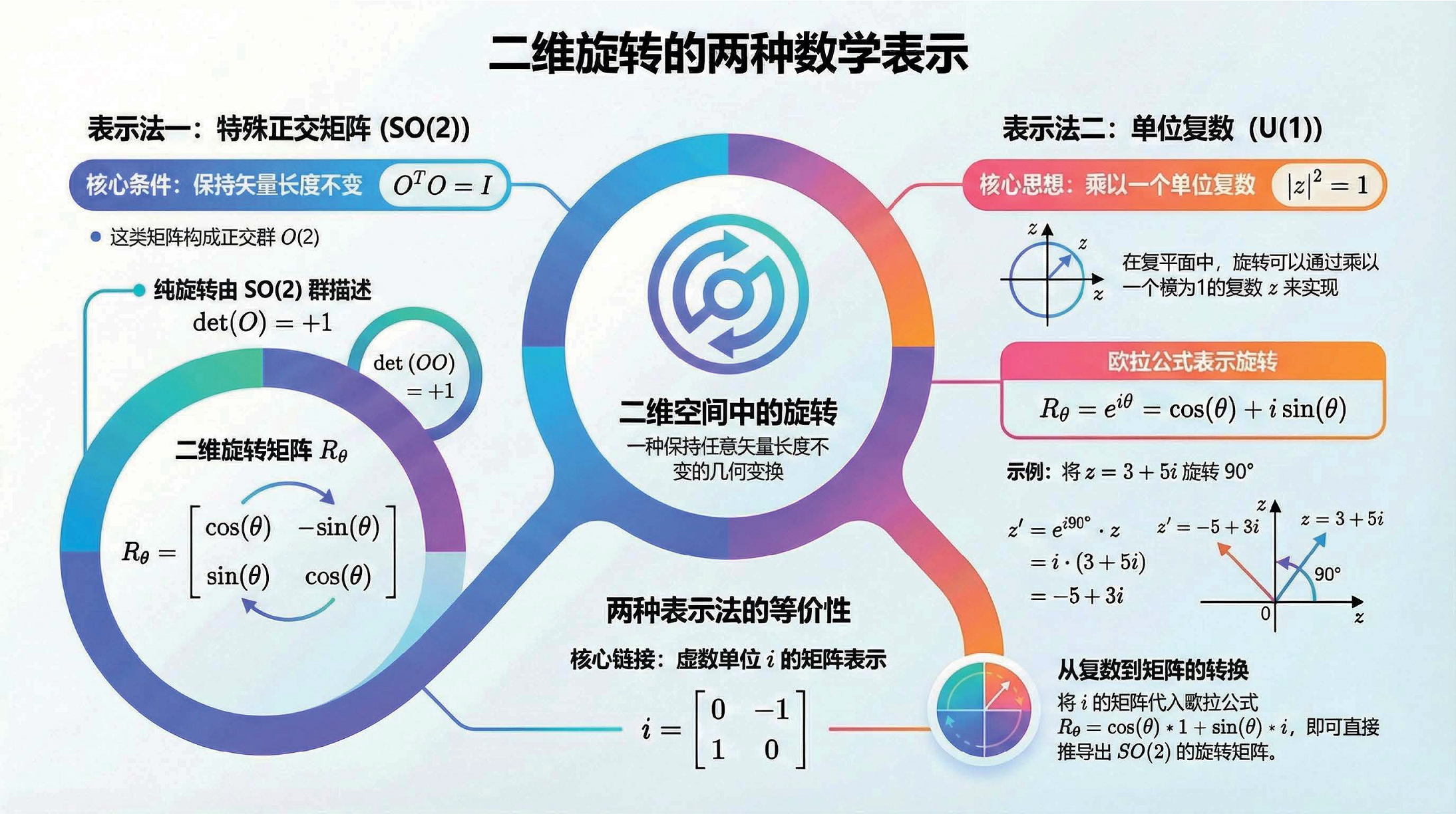 第5课视频的主要内容: 介绍了二维旋转的两种数学表示,即矩阵表示和复数表示,通过推导证明了这两种表示法在形式和作用效果上完全等价。还指出这两种表示法对应的群S0(2)与U(1)是同构的,揭示了线性代数和复分析的深刻联系。