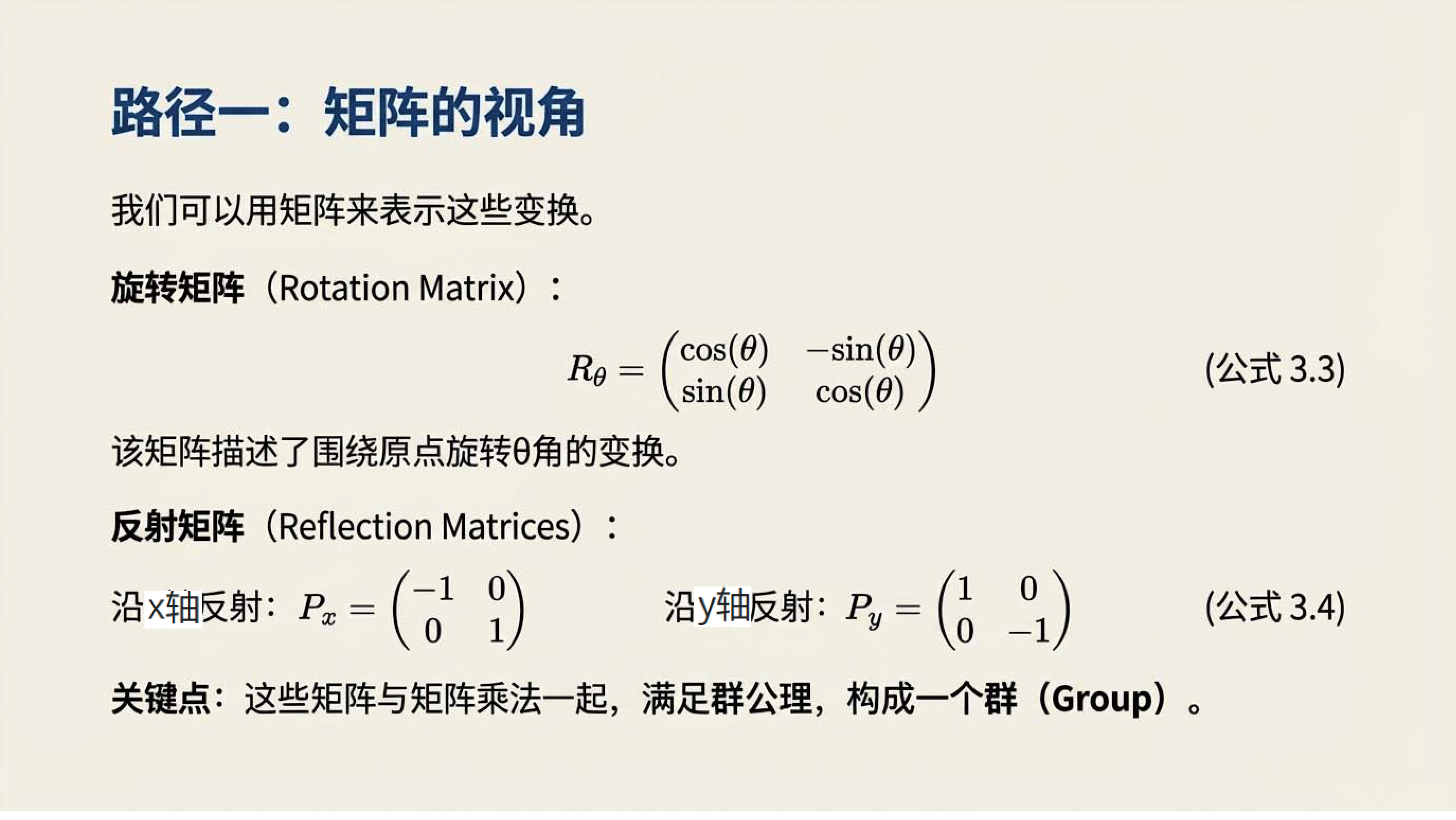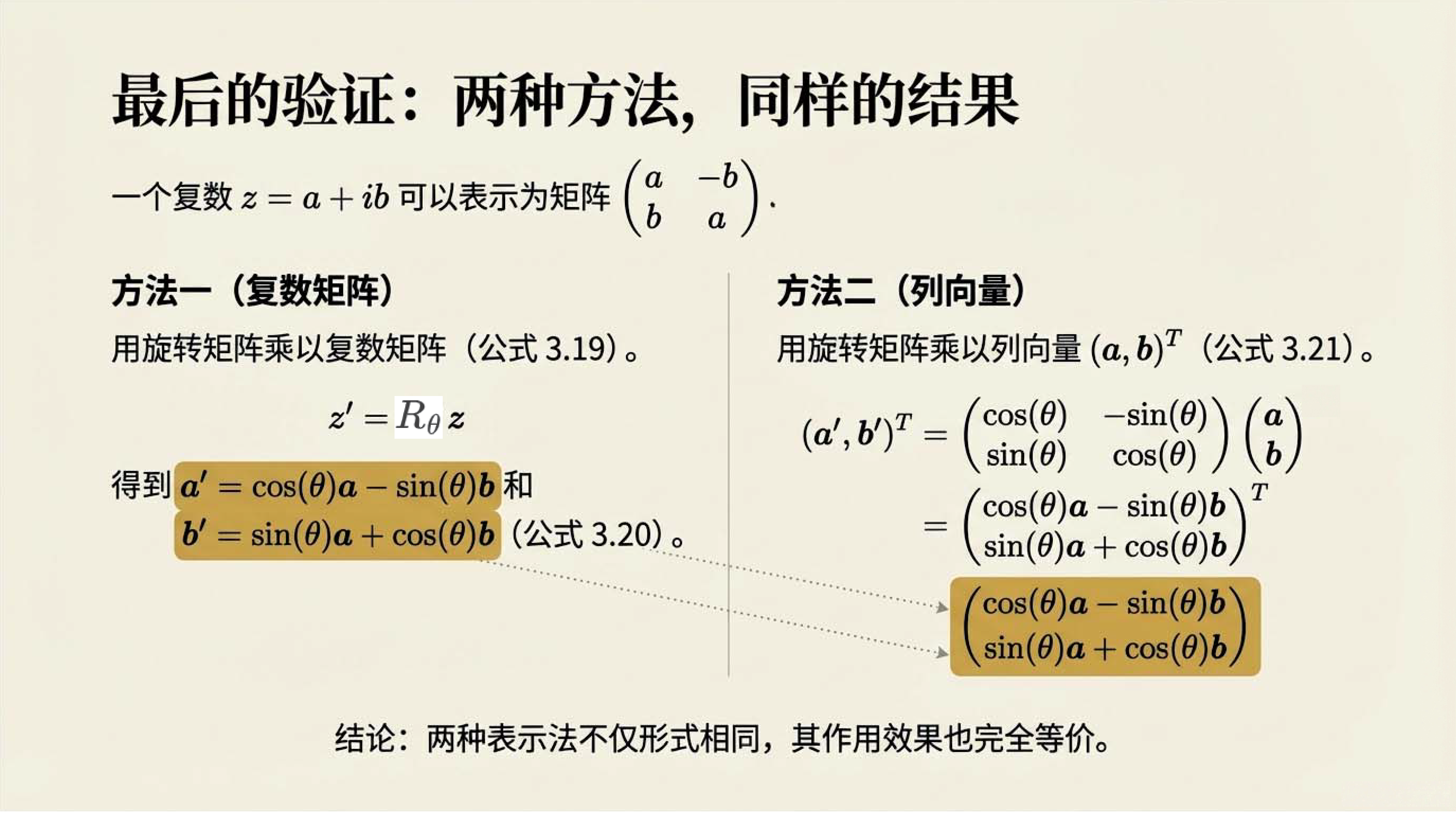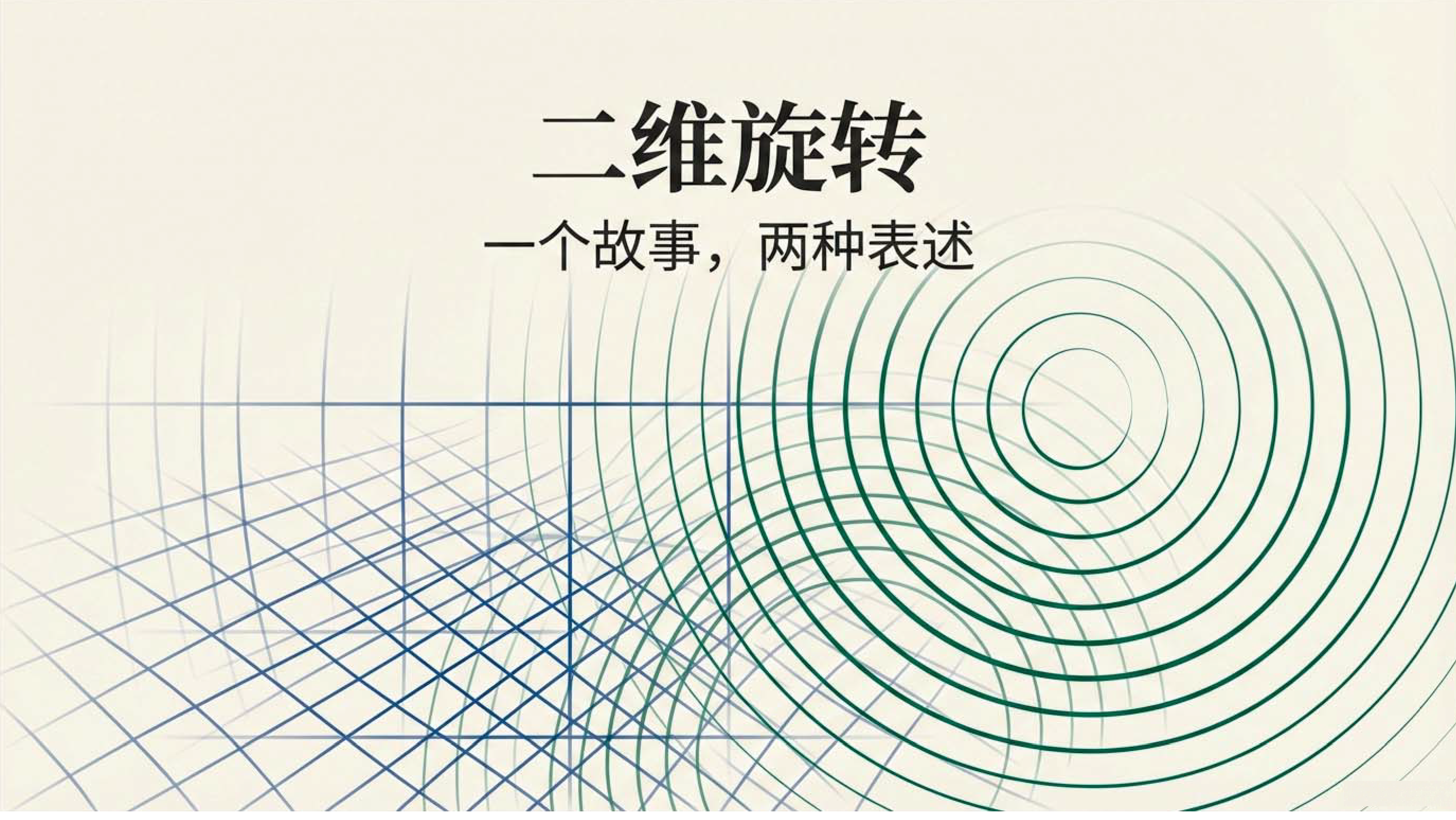第5课视频的主要内容: 介绍了二维旋转的两种数学表示,即矩阵表示和复数表示,通过推导证明了这两种表示法在形式和作用效果上完全等价。还指出这两种表示法对应的群S0(2)与U(1)是同构的,揭示了线性代数和复分析的深刻联系。