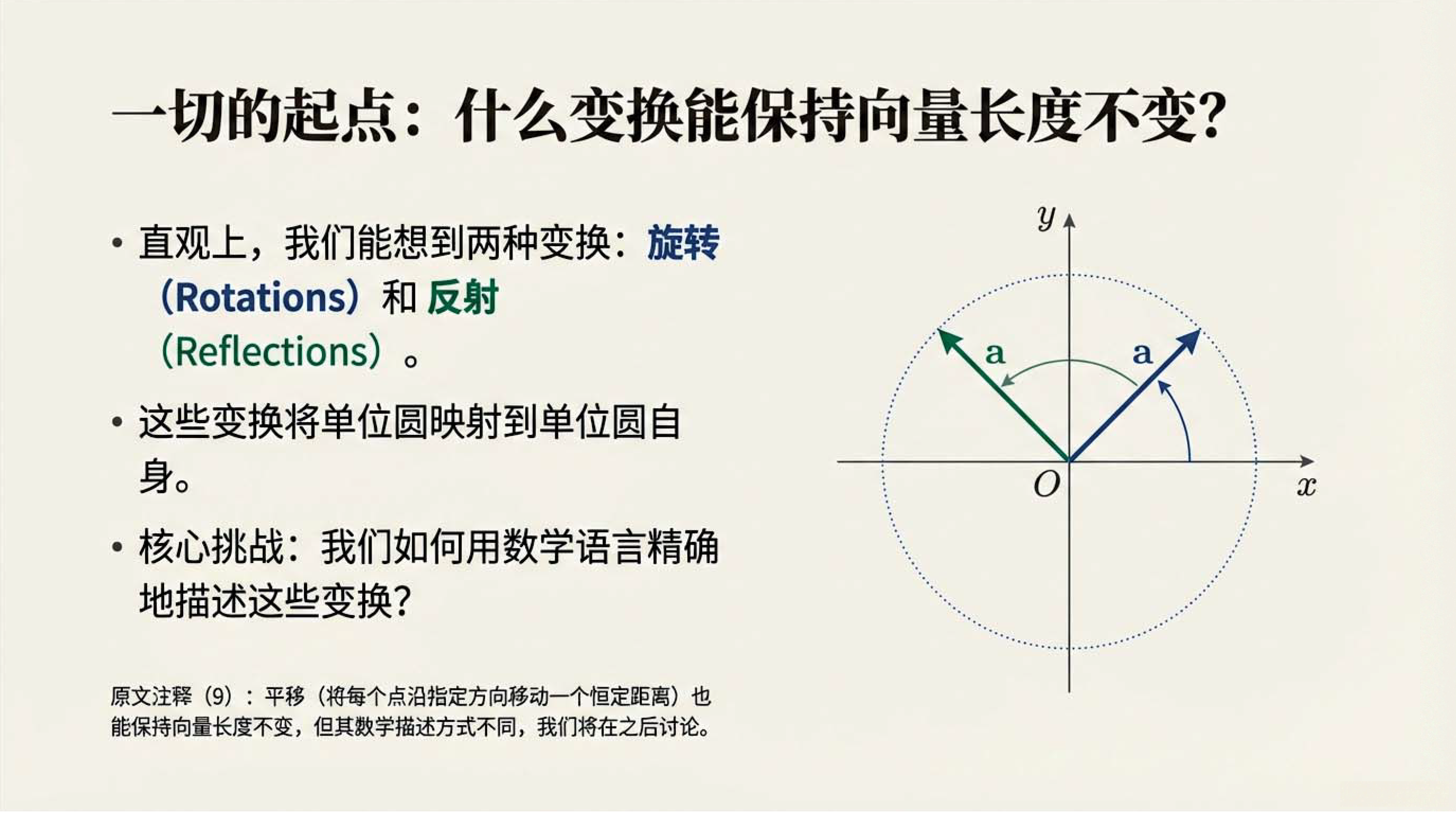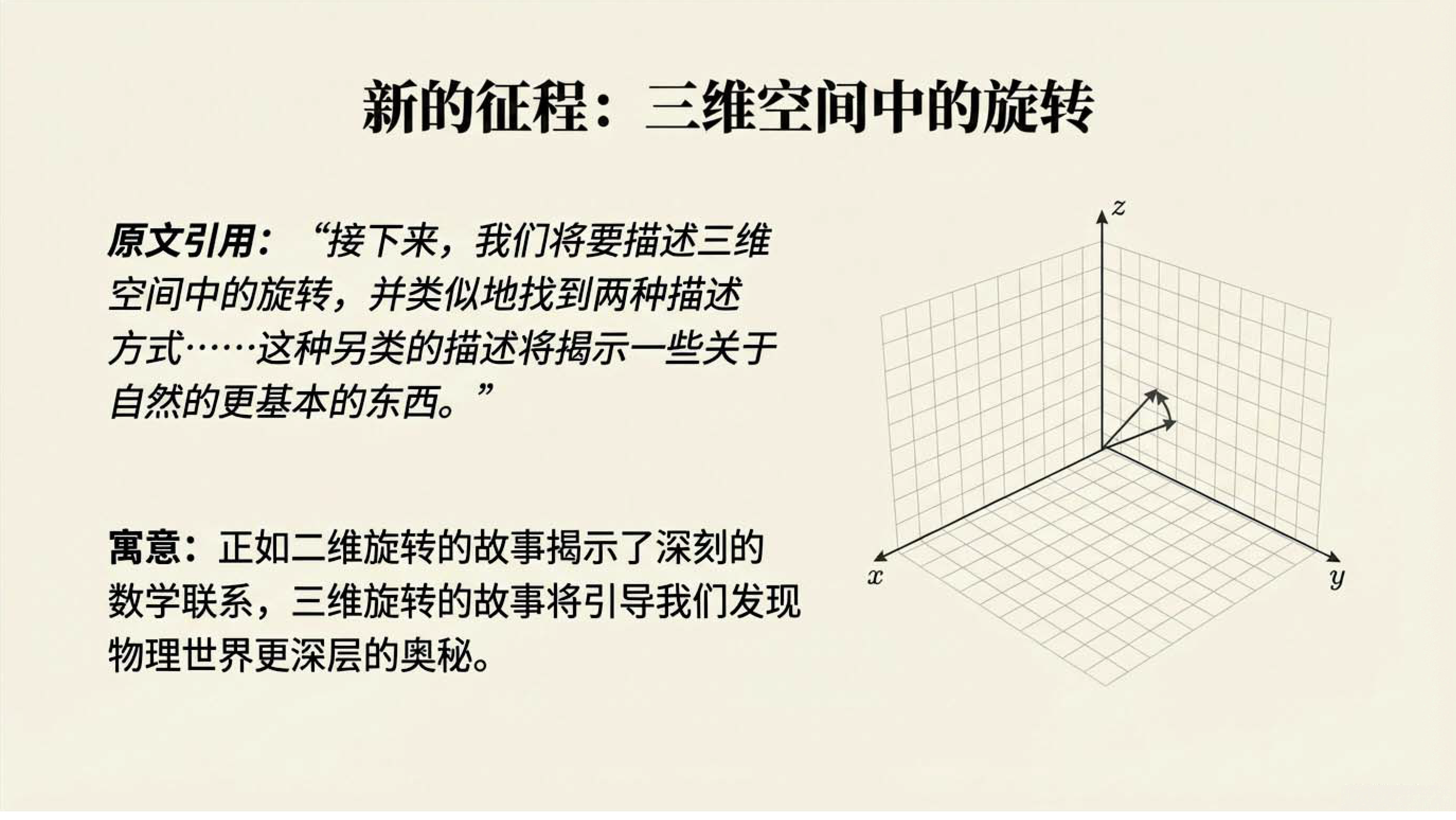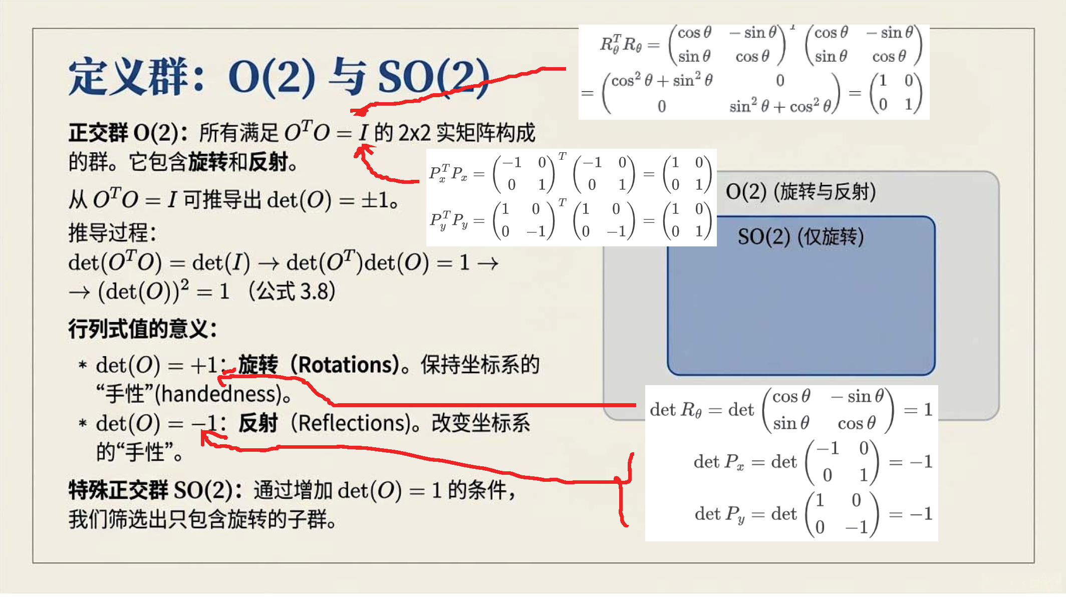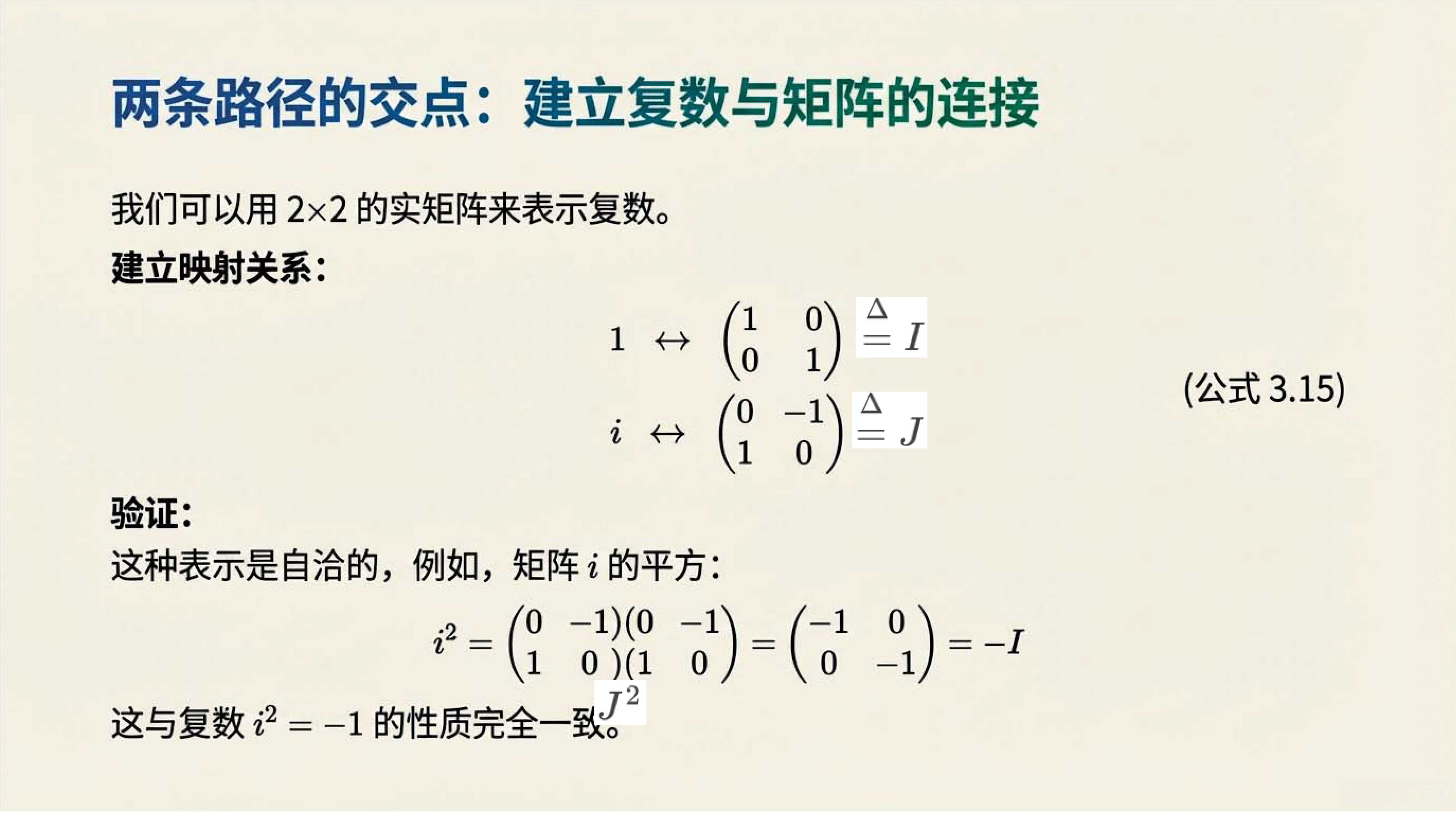 第5课视频的主要内容: 介绍了二维旋转的两种数学表示,即矩阵表示和复数表示,通过推导证明了这两种表示法在形式和作用效果上完全等价。还指出这两种表示法对应的群S0(2)与U(1)是同构的,揭示了线性代数和复分析的深刻联系。