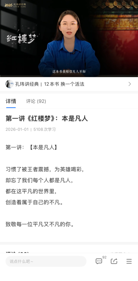 本课程第一讲《红楼梦》:本是凡人 现已更新。
