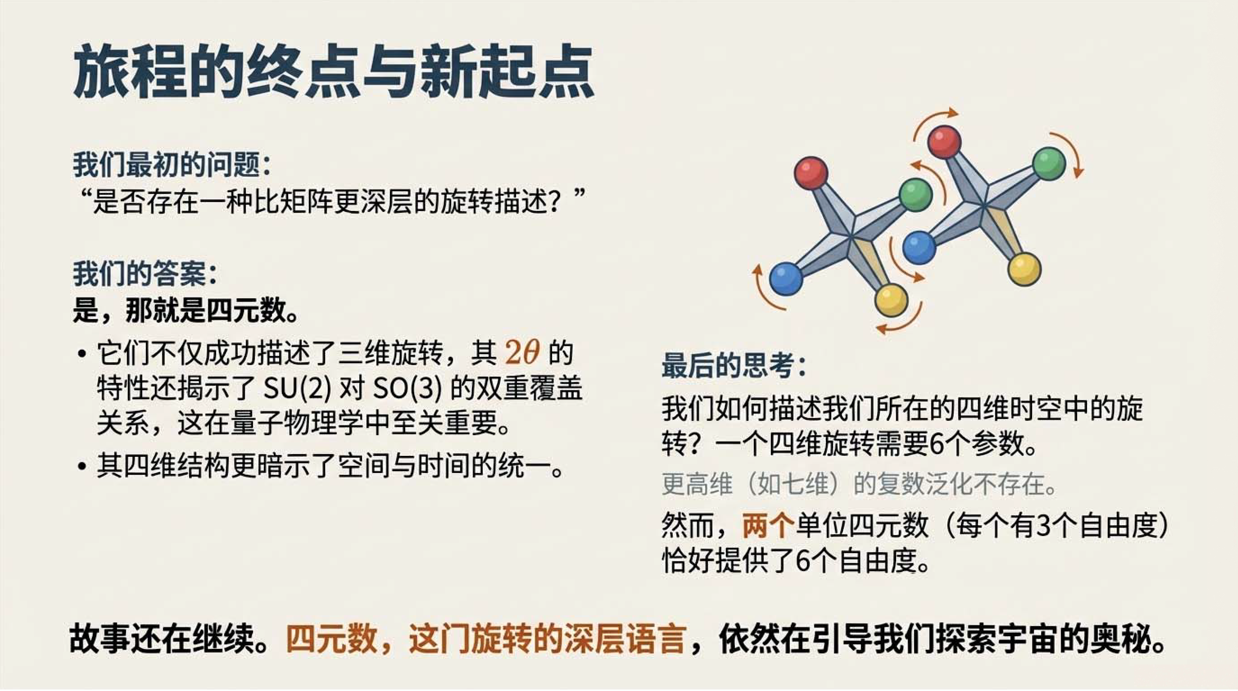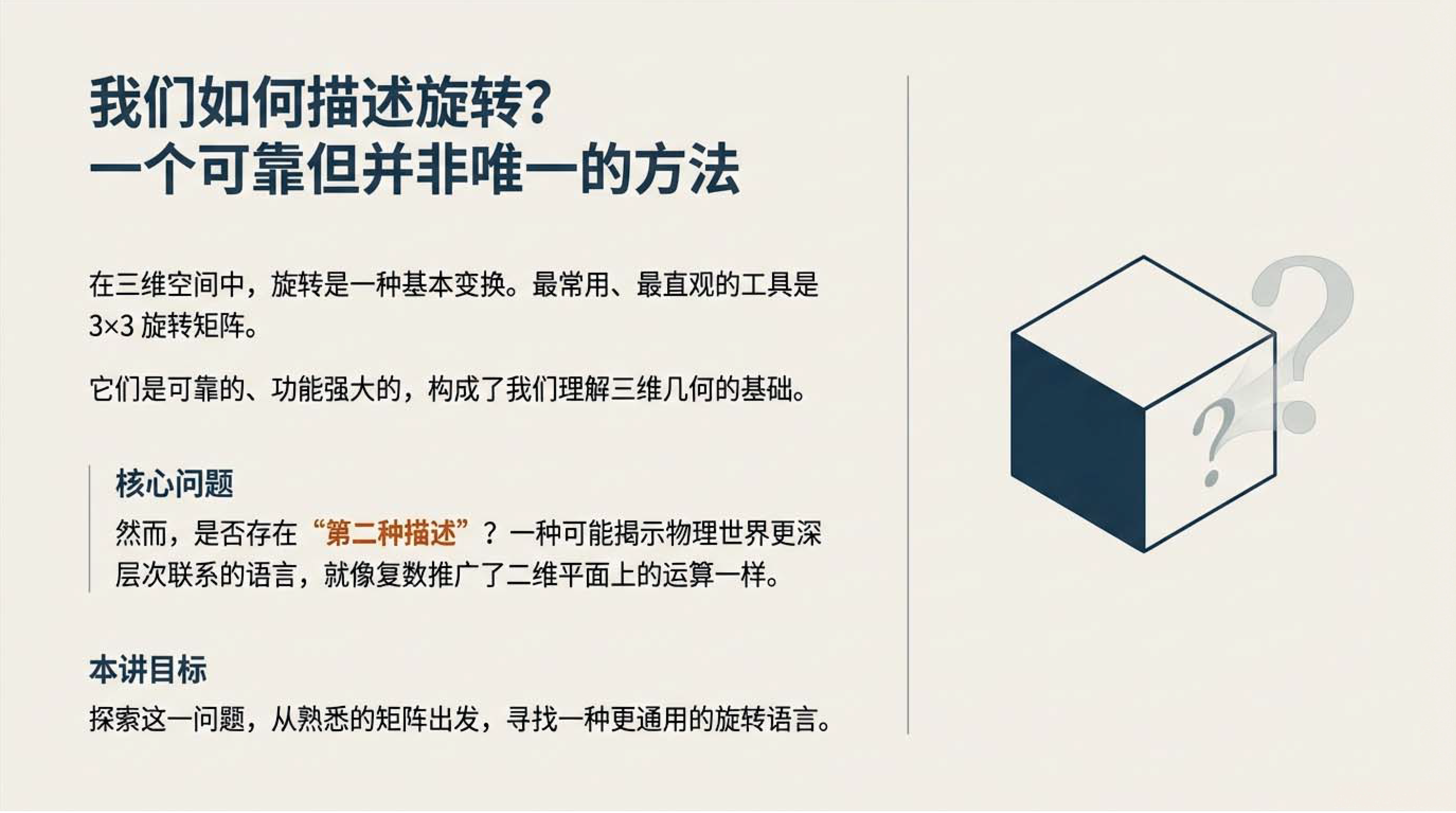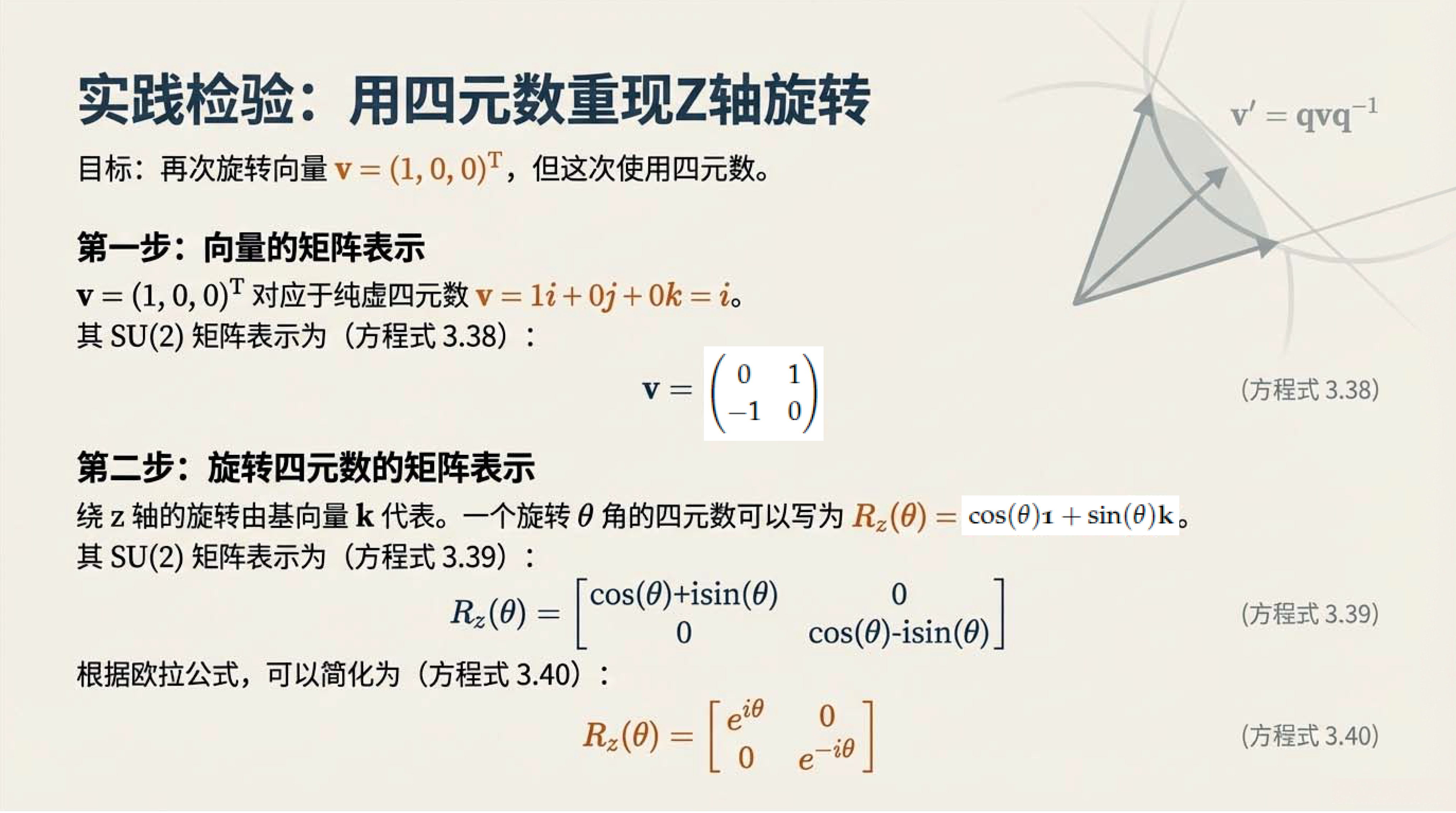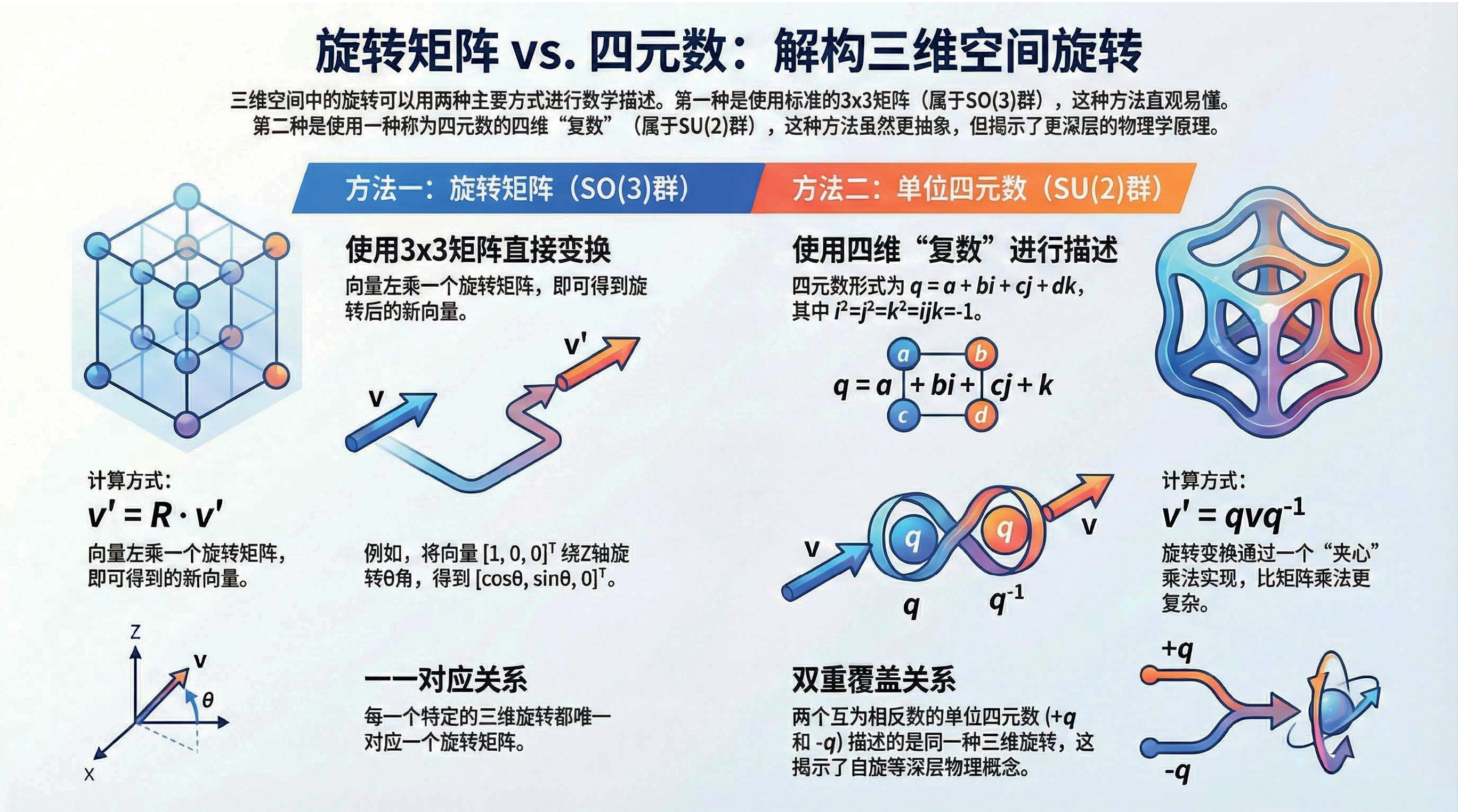 第6课视频的主要内容: 介绍了三维空间旋转有旋转矩阵和四元数两种数学描述方式,旋转矩阵直观易懂,四元数虽抽象但能揭示更深层物理学原理。还介绍了两种方式的计算、性质以及四元数与SU(2)群的对应关系等内容。