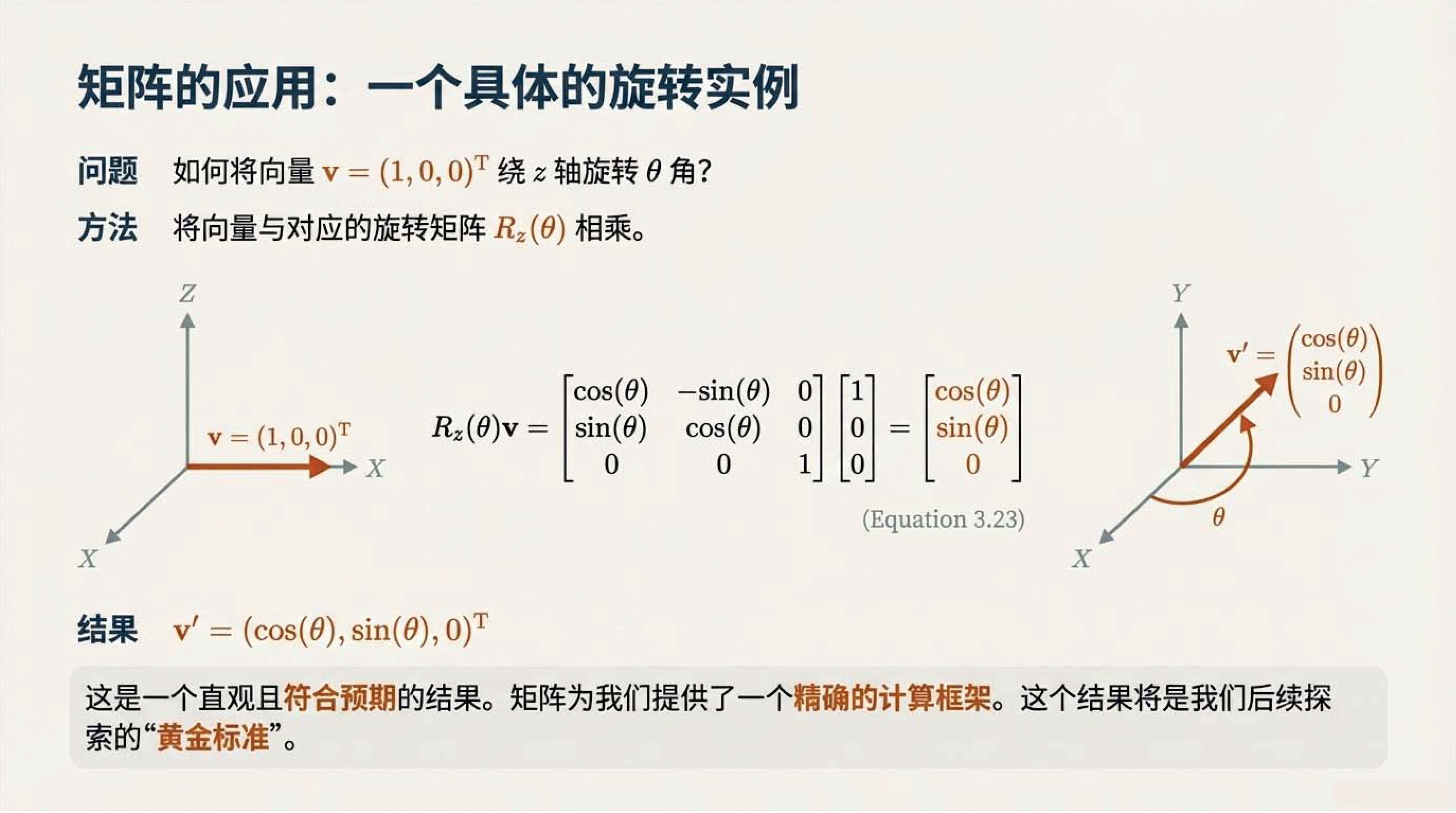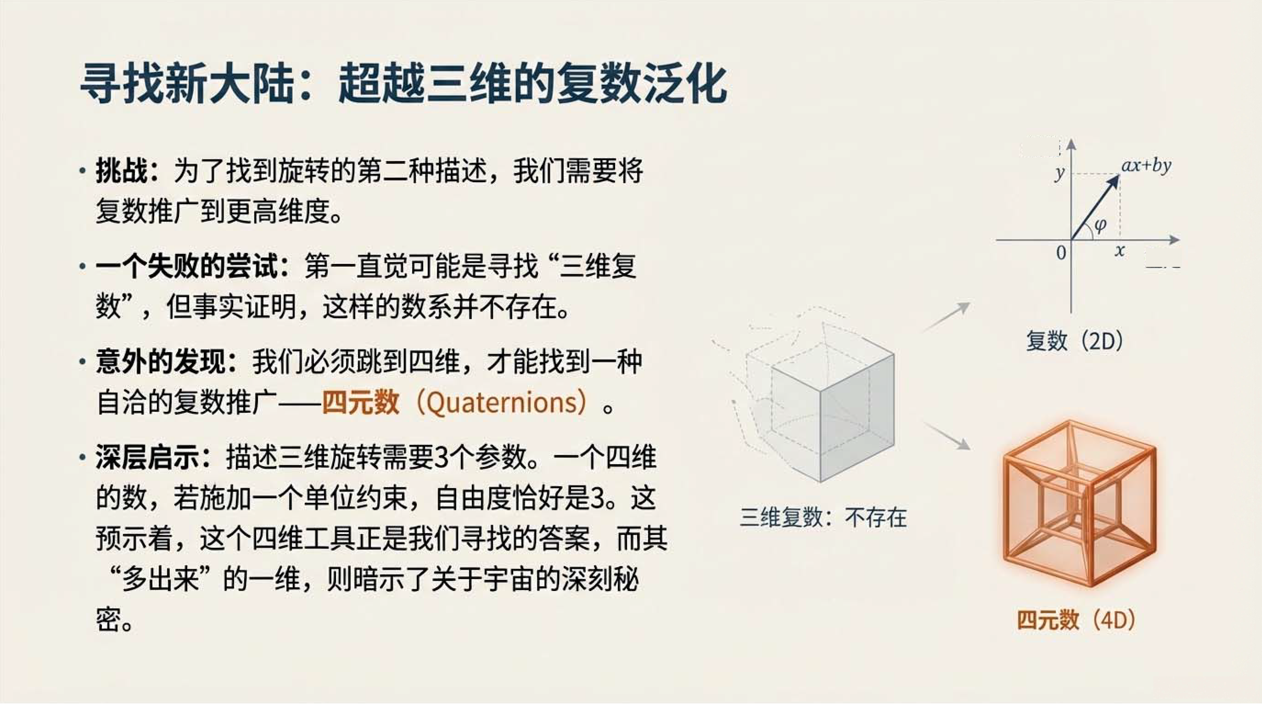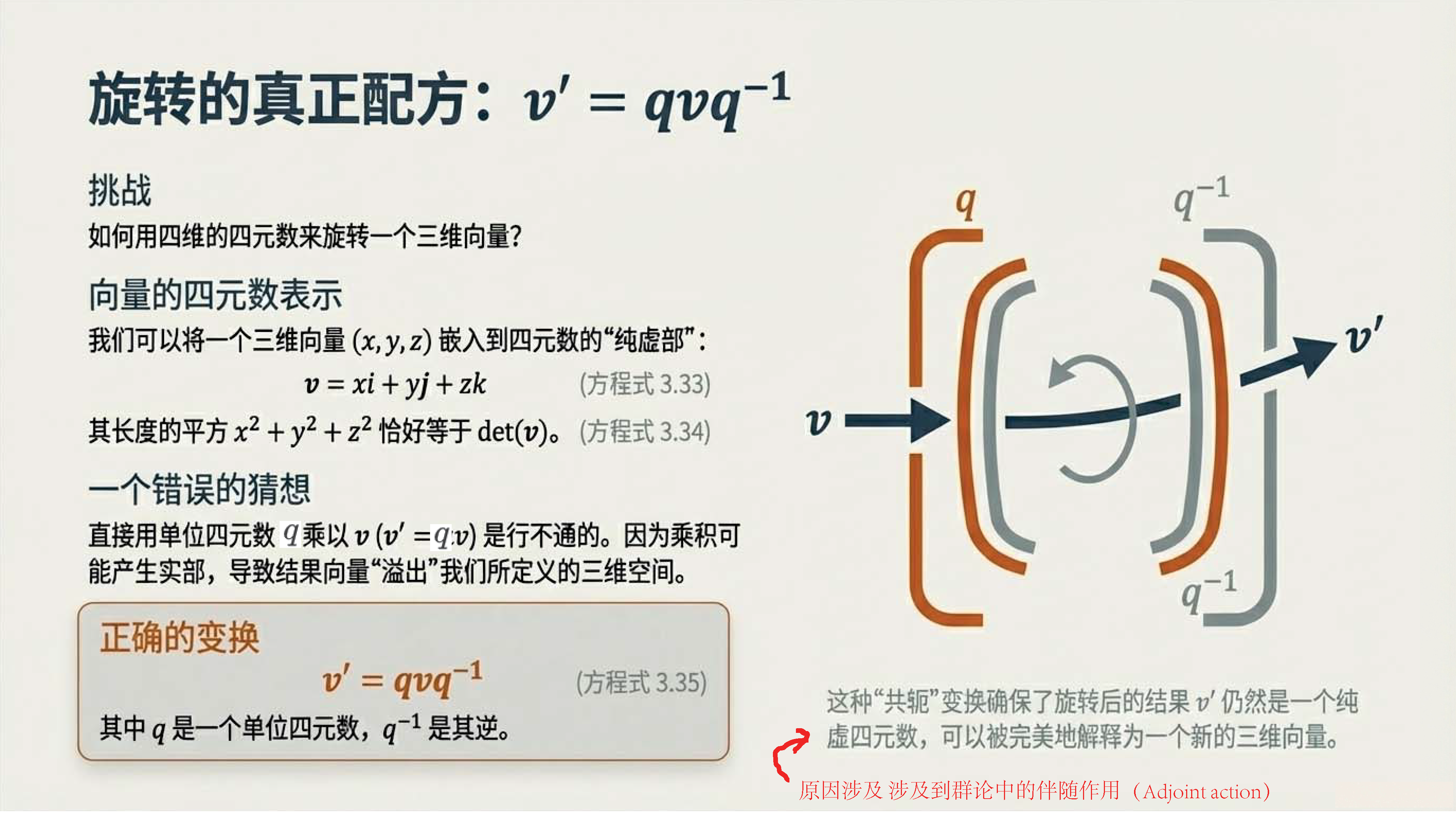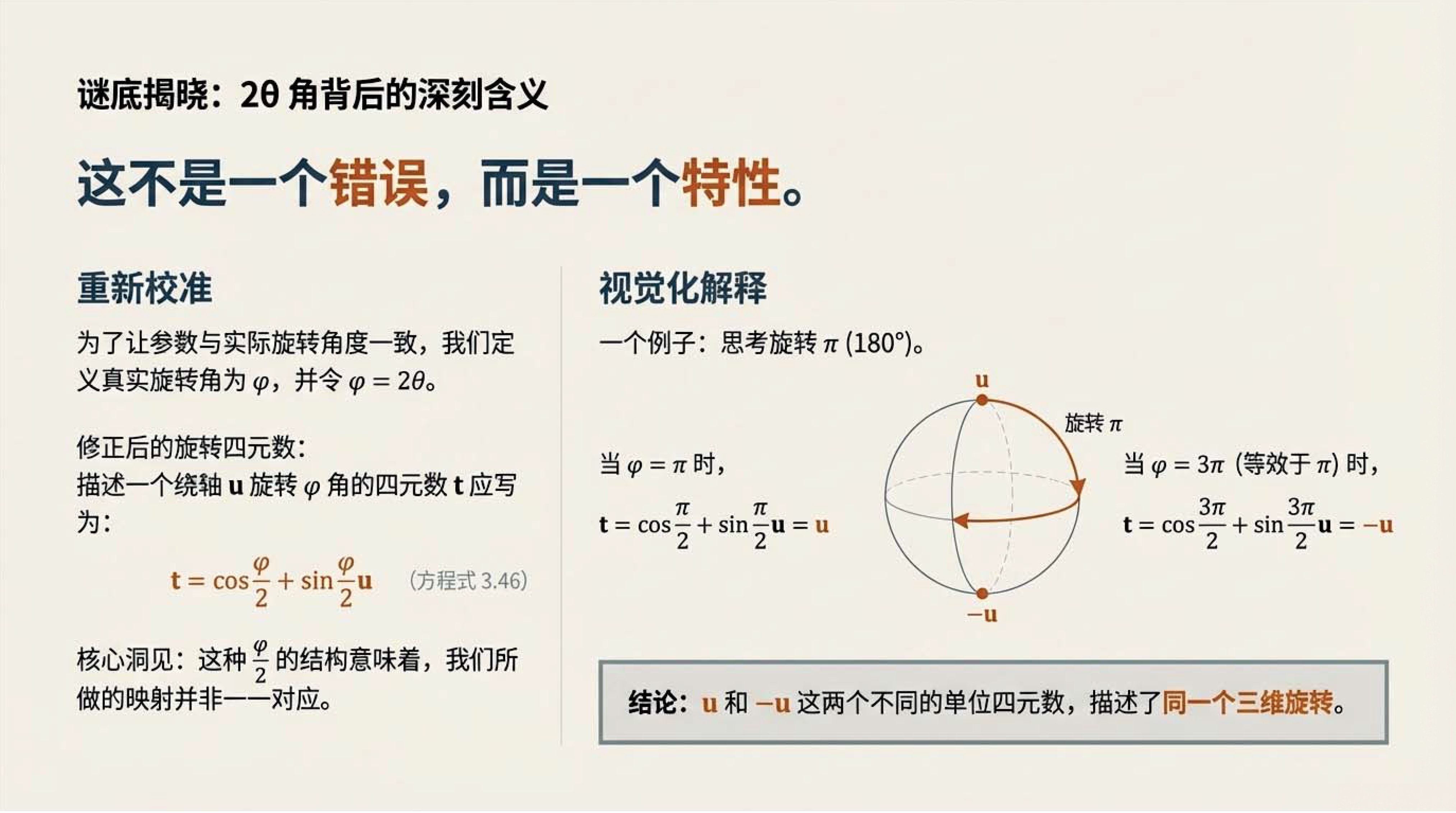 第6课视频的主要内容: 介绍了三维空间旋转有旋转矩阵和四元数两种数学描述方式,旋转矩阵直观易懂,四元数虽抽象但能揭示更深层物理学原理。还介绍了两种方式的计算、性质以及四元数与SU(2)群的对应关系等内容。