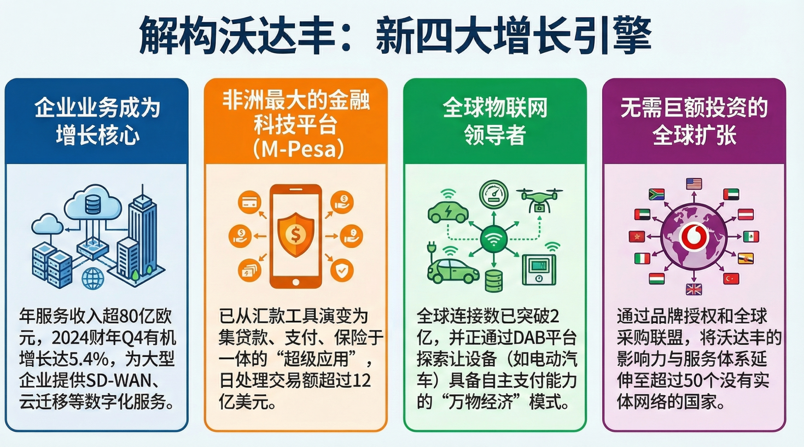 - 企业业务:增长引擎,提供物联网、云计算、专用网络等高附加值服务,实现5.4%的有机增长。